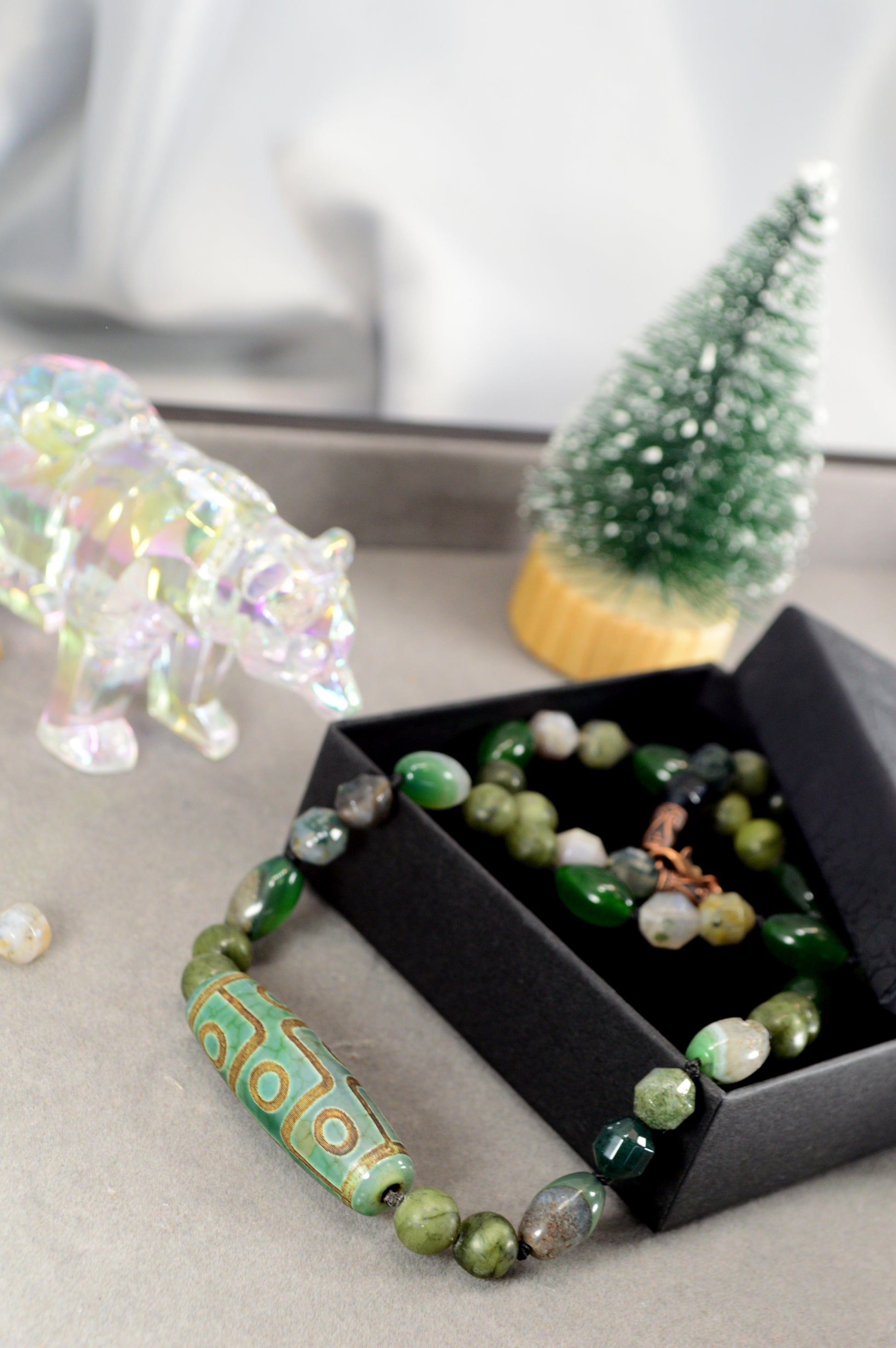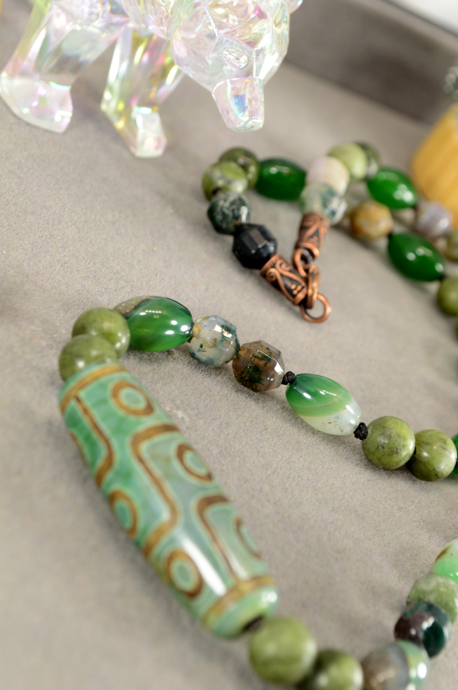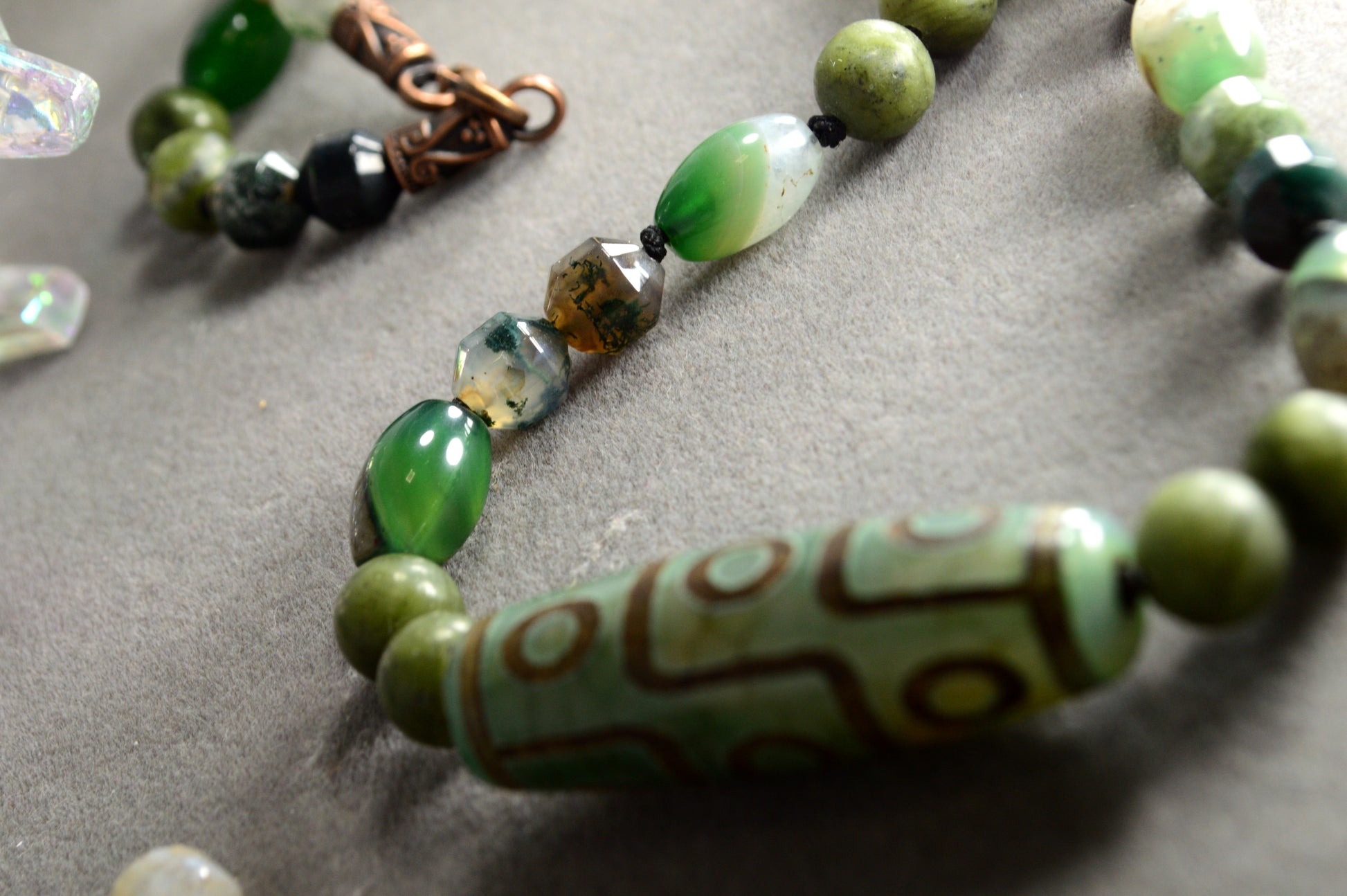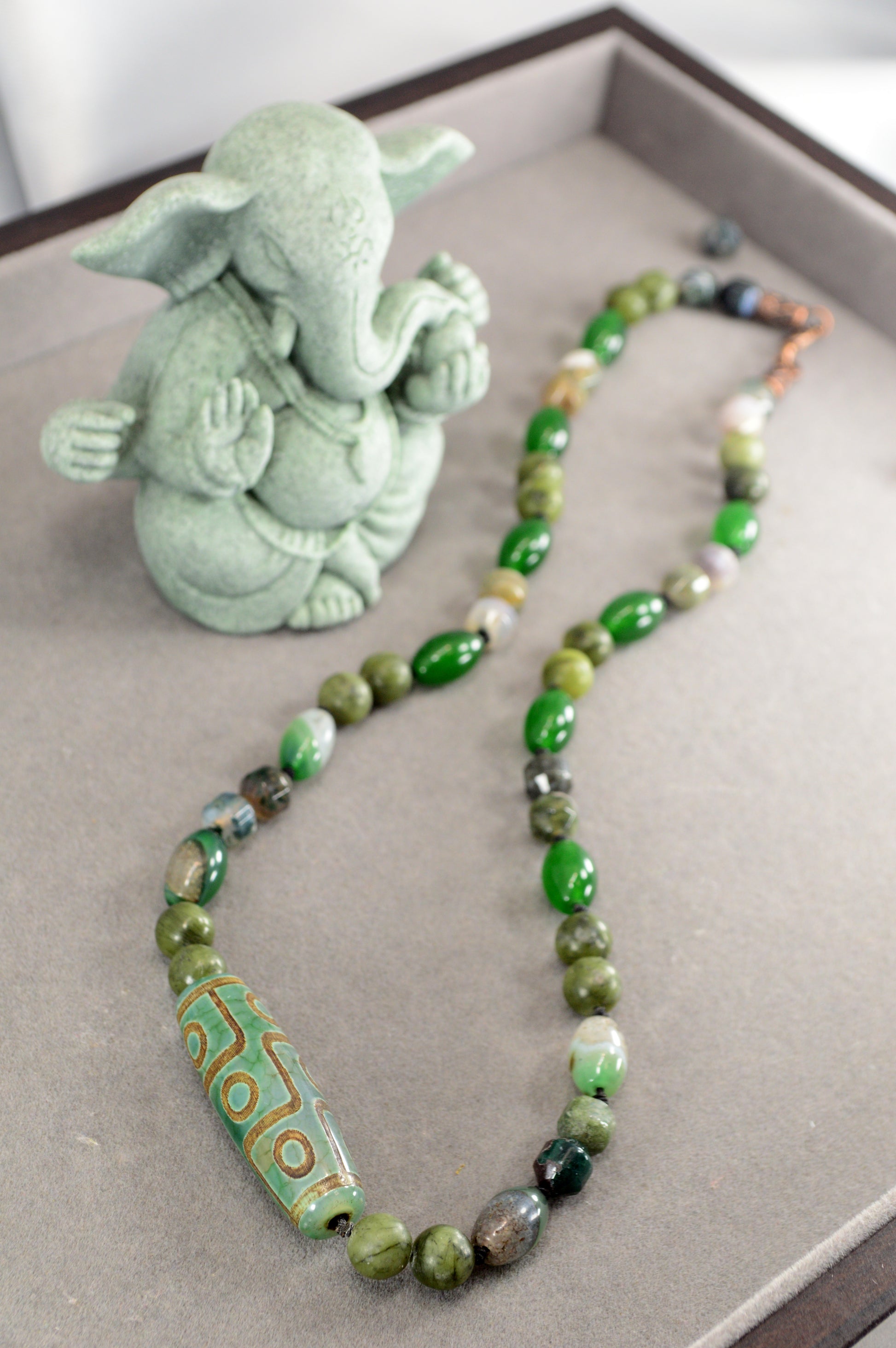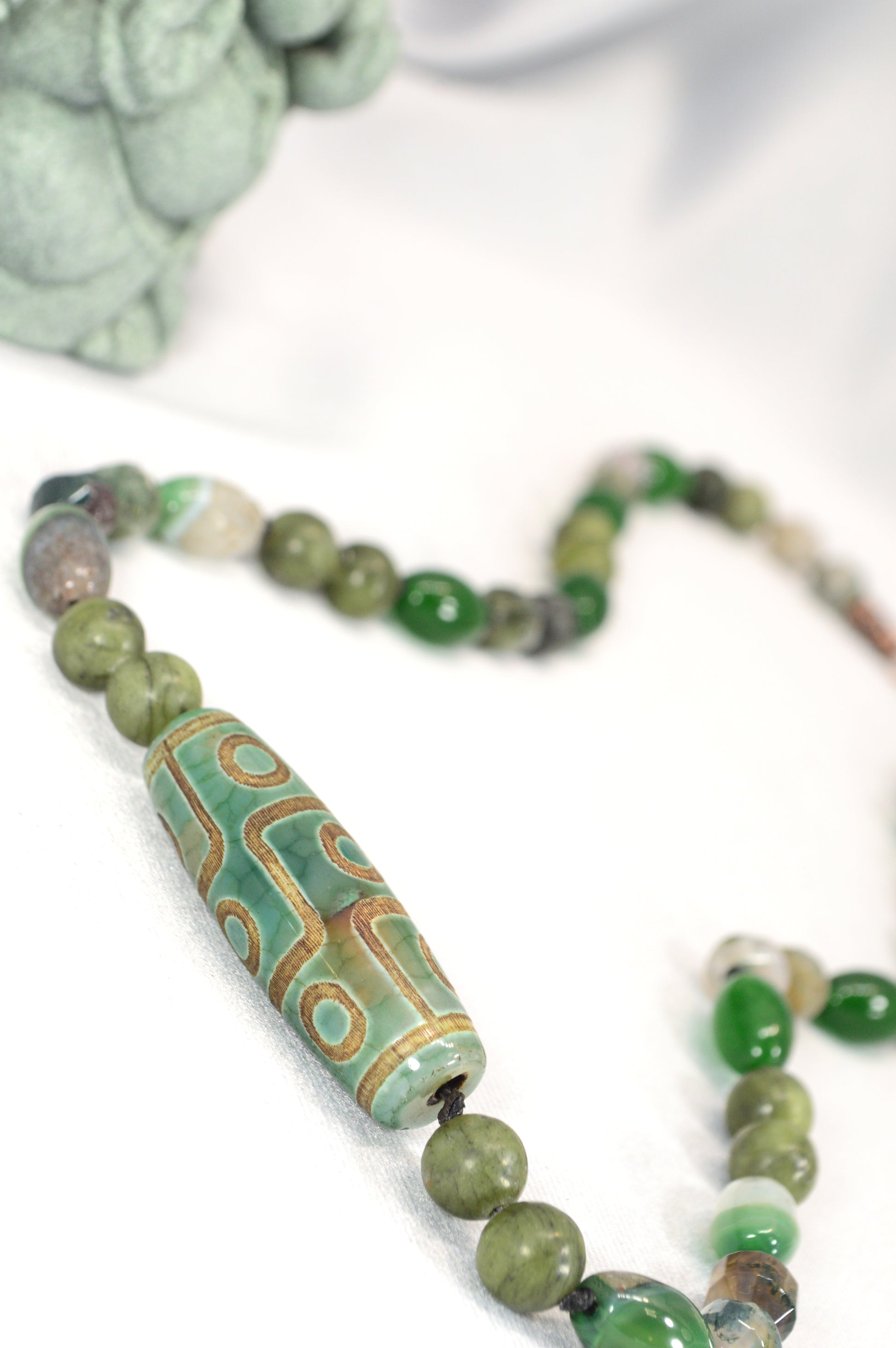 Green Agate, Jade, Esmeralda & Tibetan Dzi Bead Necklace – Boho Healing Stone Jewelry