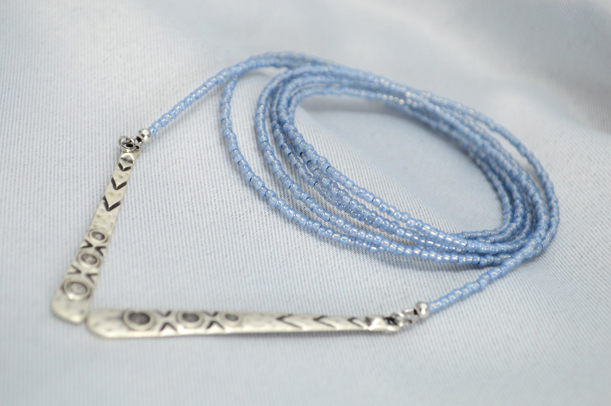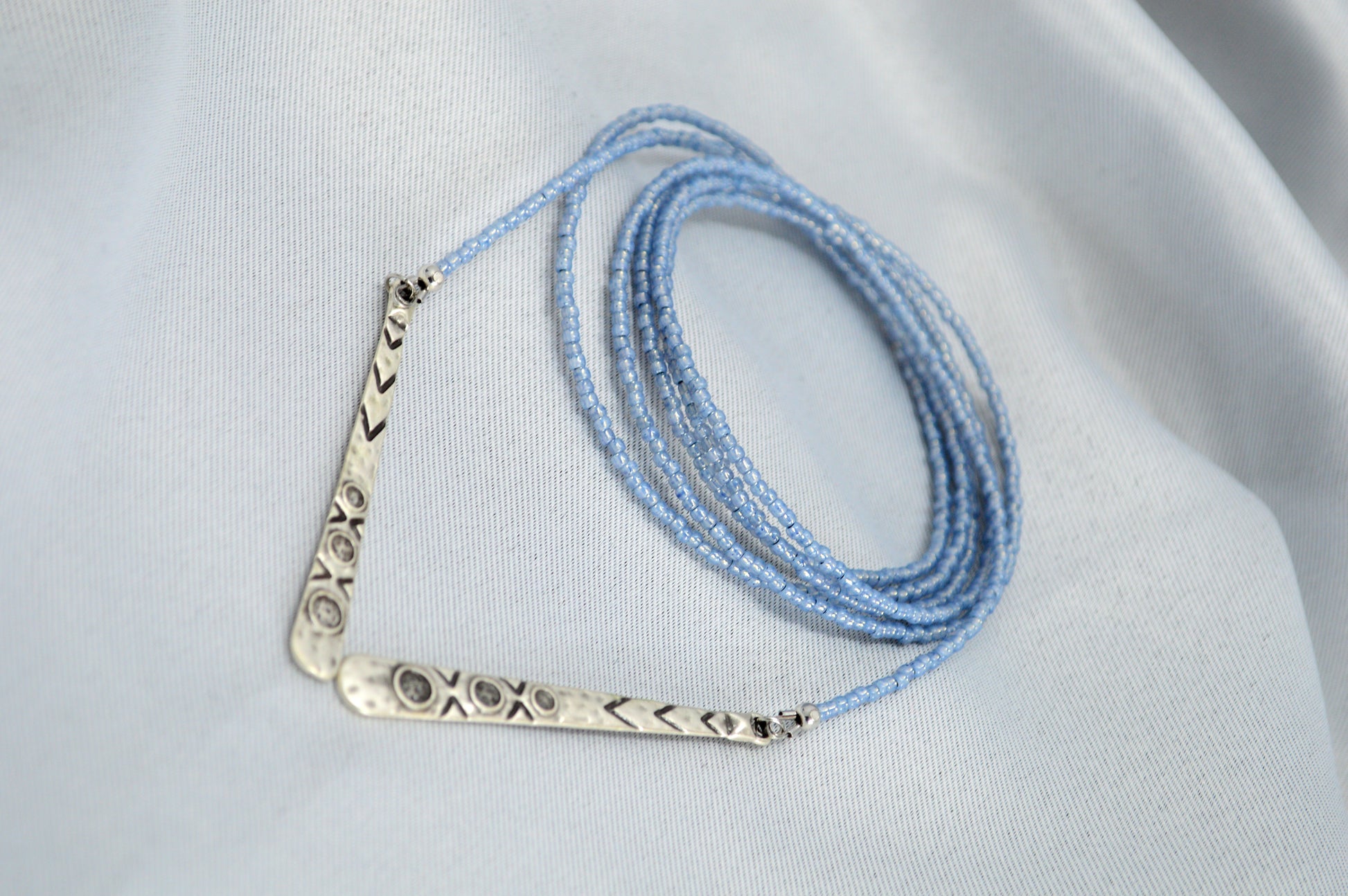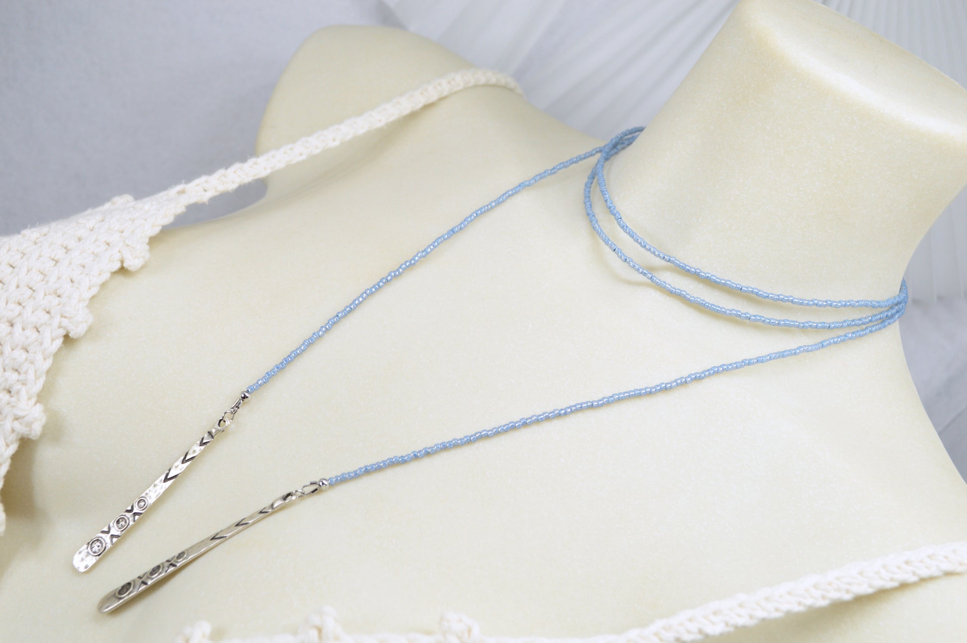 Light Blue Beaded Lariat Necklace, Boho Wrap Choker with Stainless Steel Drop Pendant