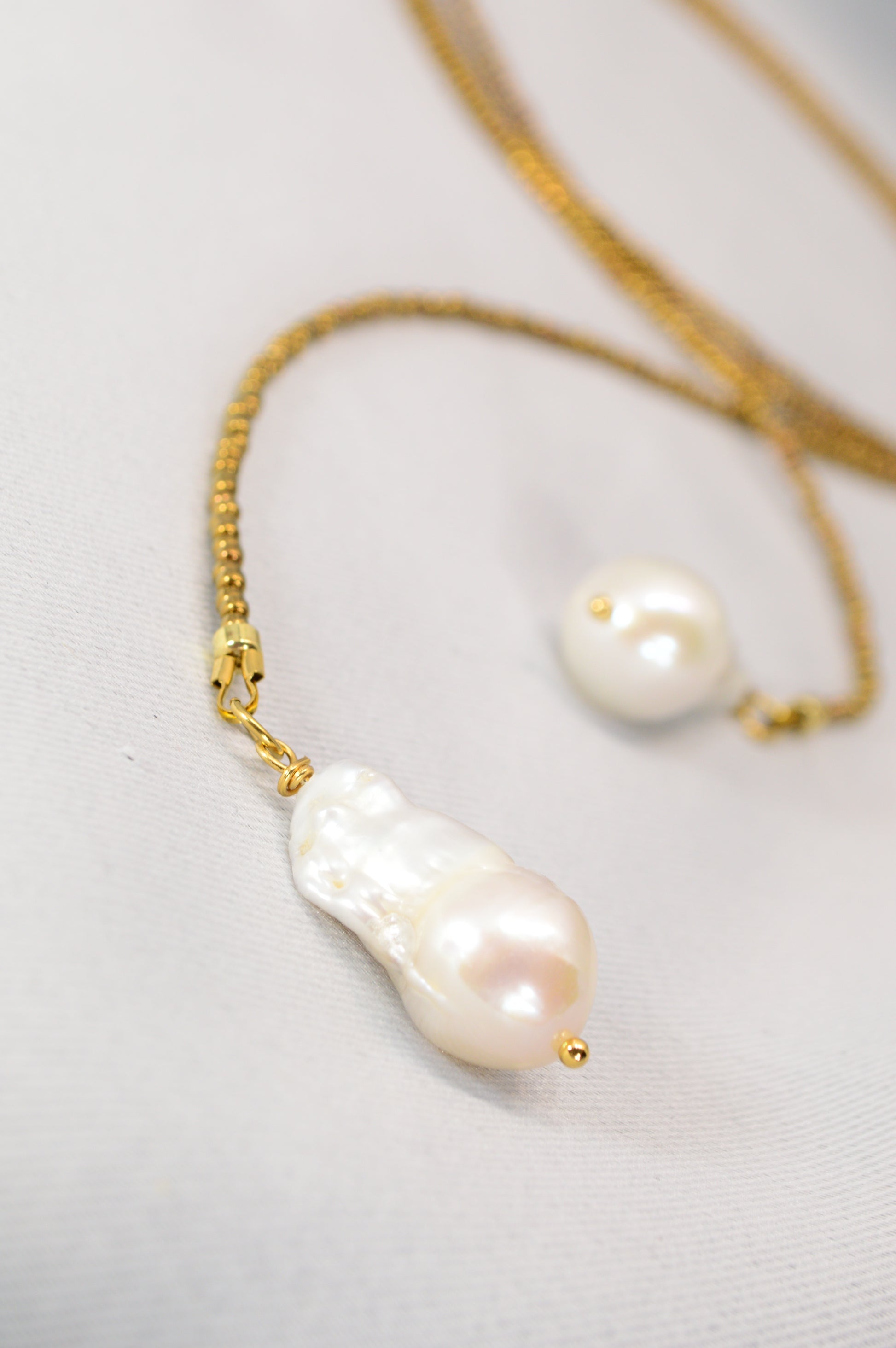 Long Pearl Drop Necklace – Gold Seed Beads & Baroque Pearl Pendant