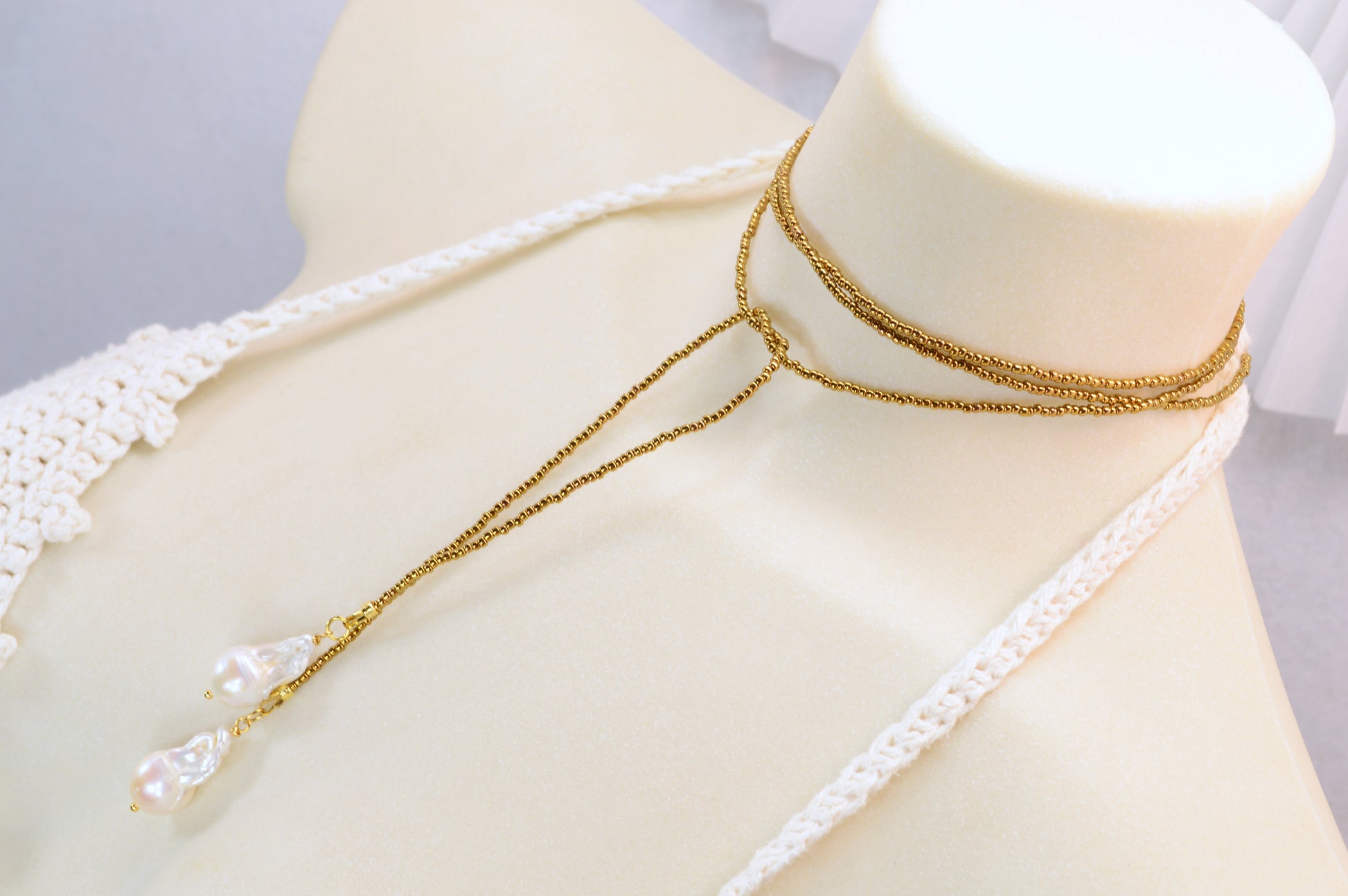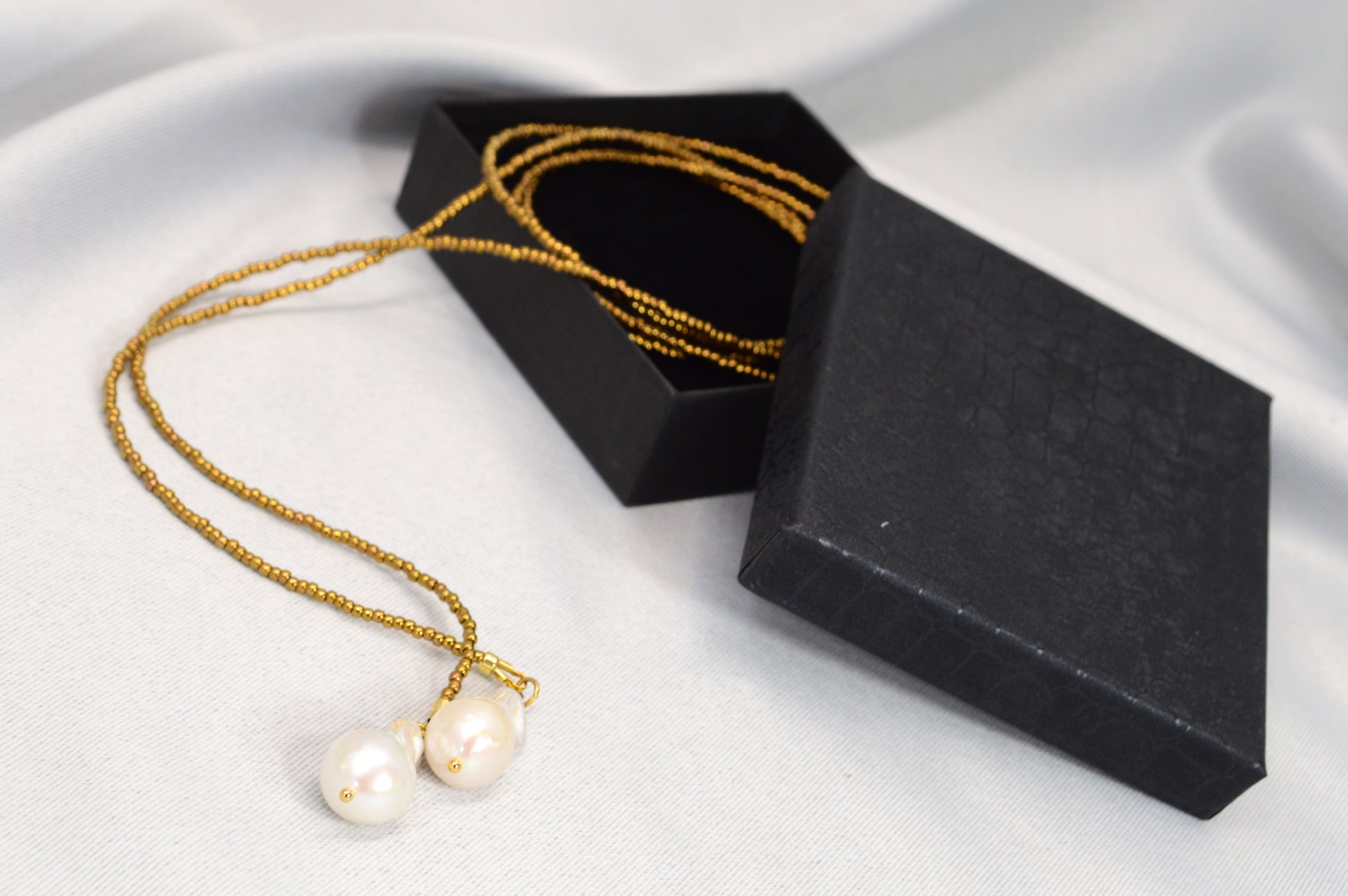 Elegant long necklace made from tiny gold glass seed beads with two natural baroque pearl drops. Light, minimal and easy to style — it can be worn long, doubled as a layered necklace, or wrapped as a choker + pendant combo. The pearls have beautiful organic shapes, each one unique, giving the piece a soft natural elegance. Perfect for summer outfits, minimal looks, beach style or adding a delicate golden accent to everyday wear.
