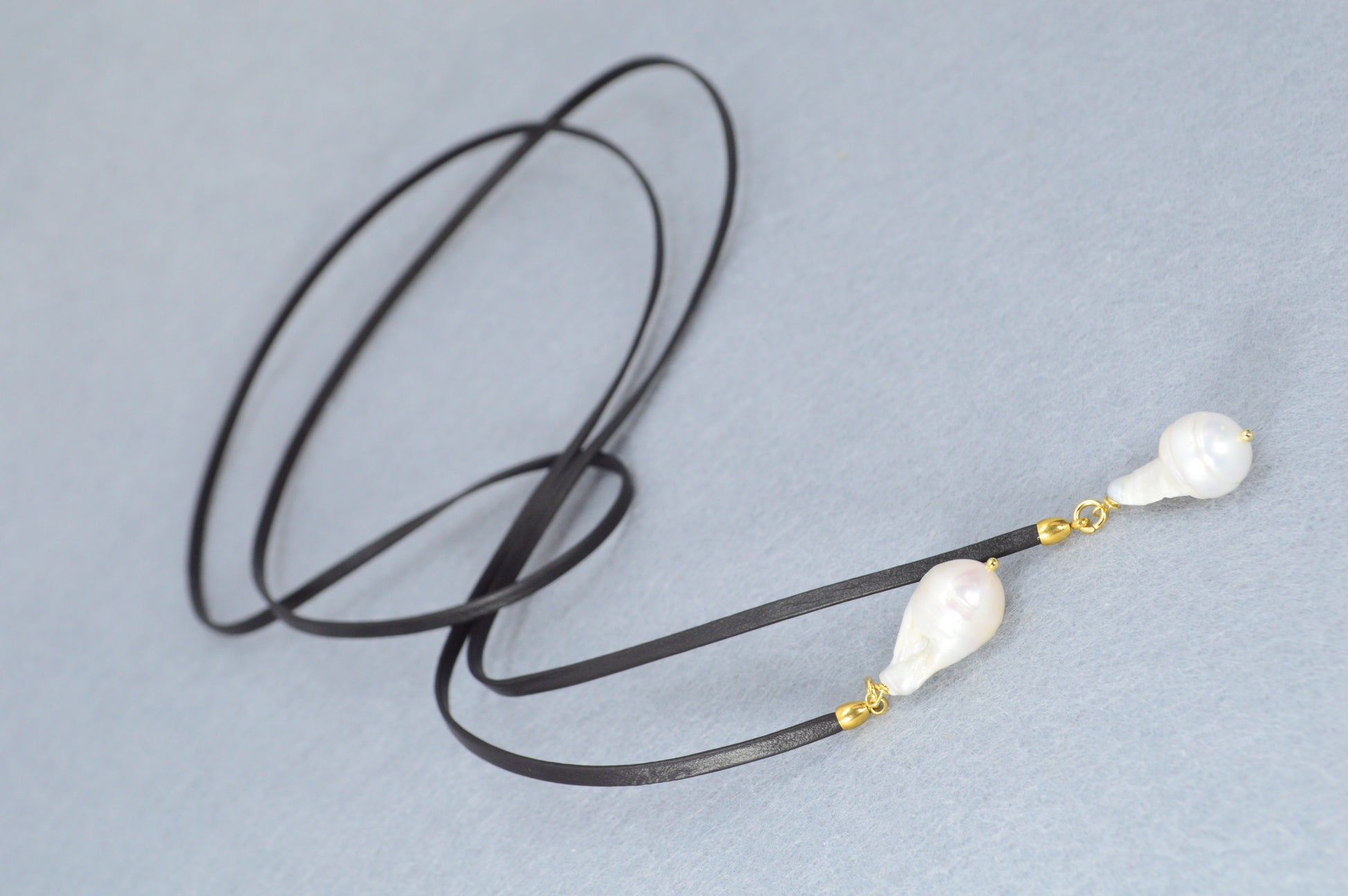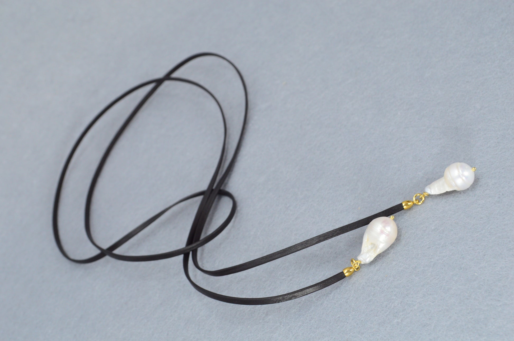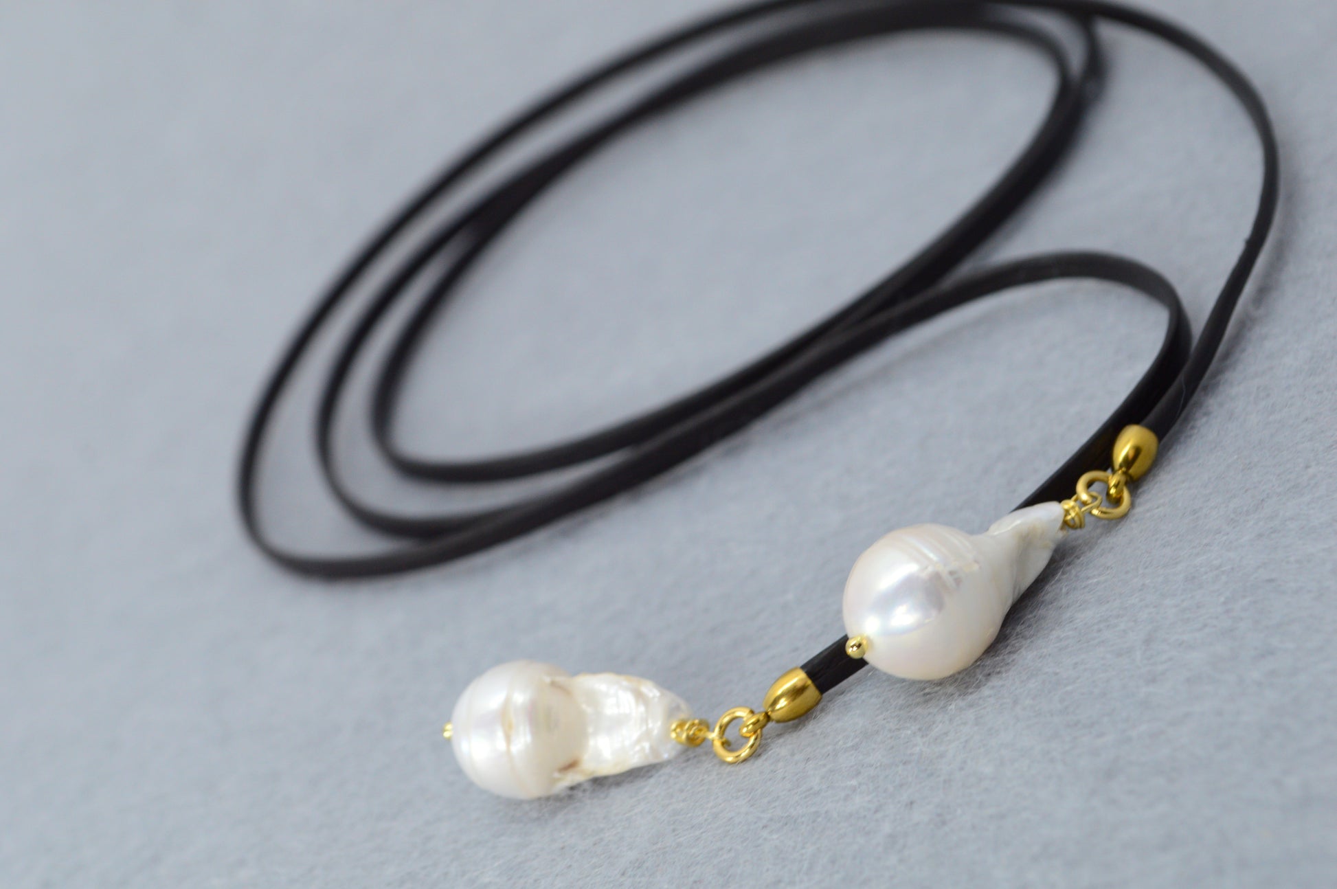 Step into the spotlight with this exclusive baroque pearl leather wrap choker – a bold blend of timeless elegance and modern edge. Handmade with natural baroque freshwater pearls, wrapped on sleek black leather cord and finished with gold-plated details, this versatile piece redefines what it means to wear pearls.
