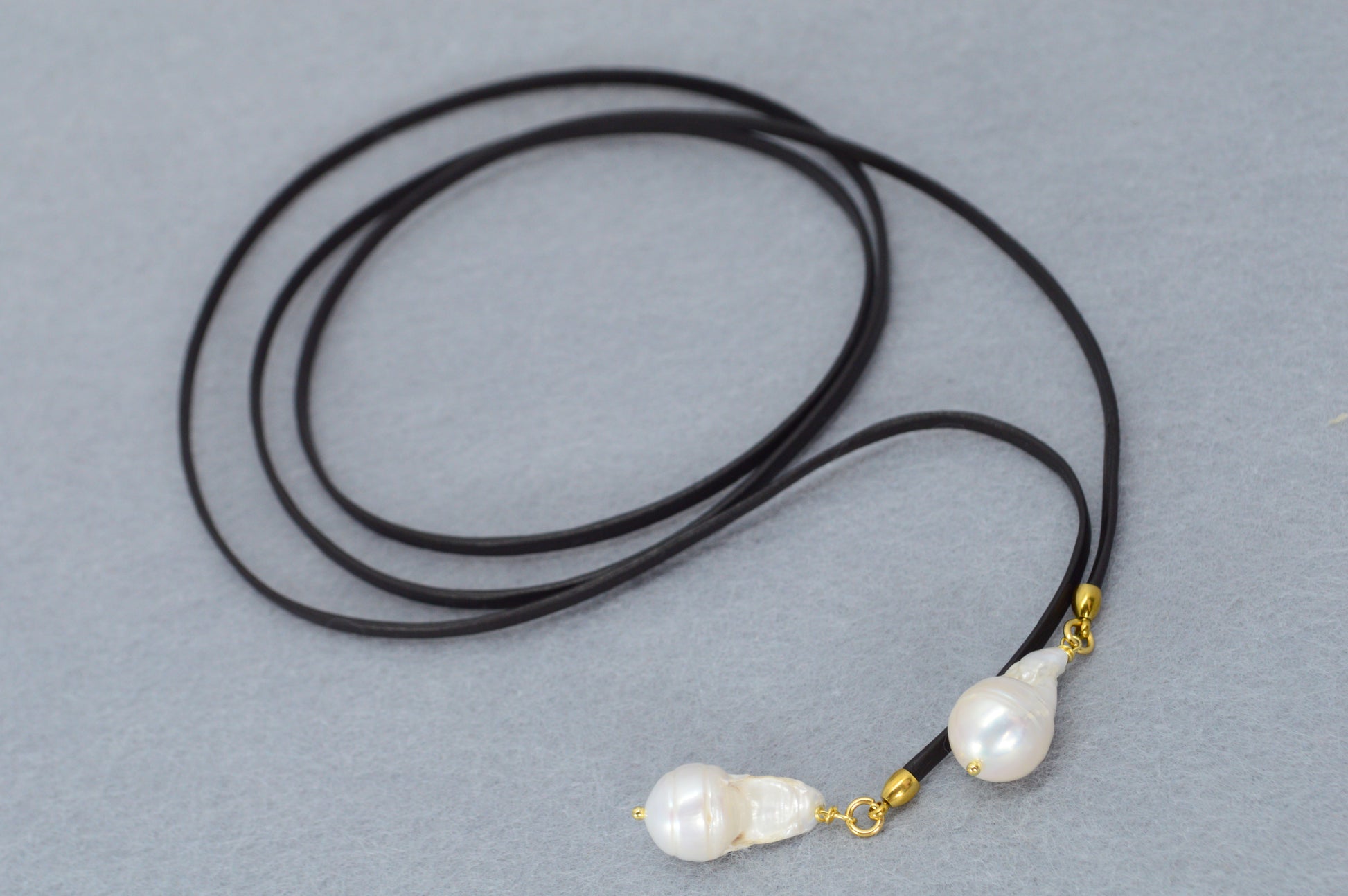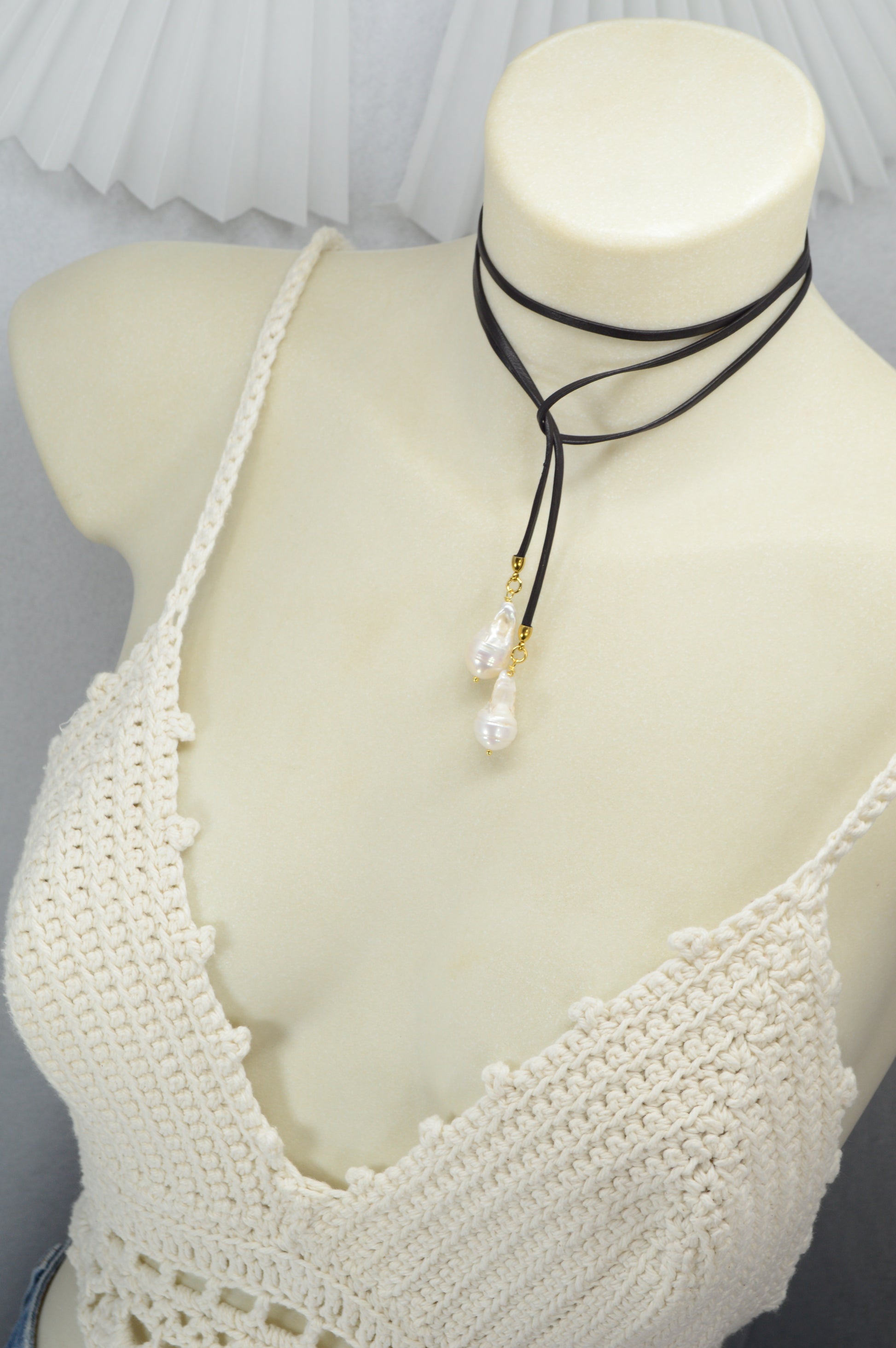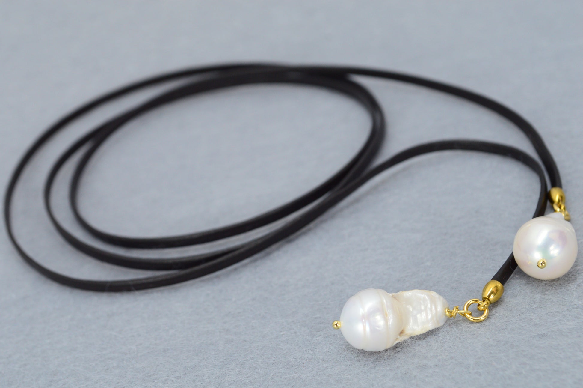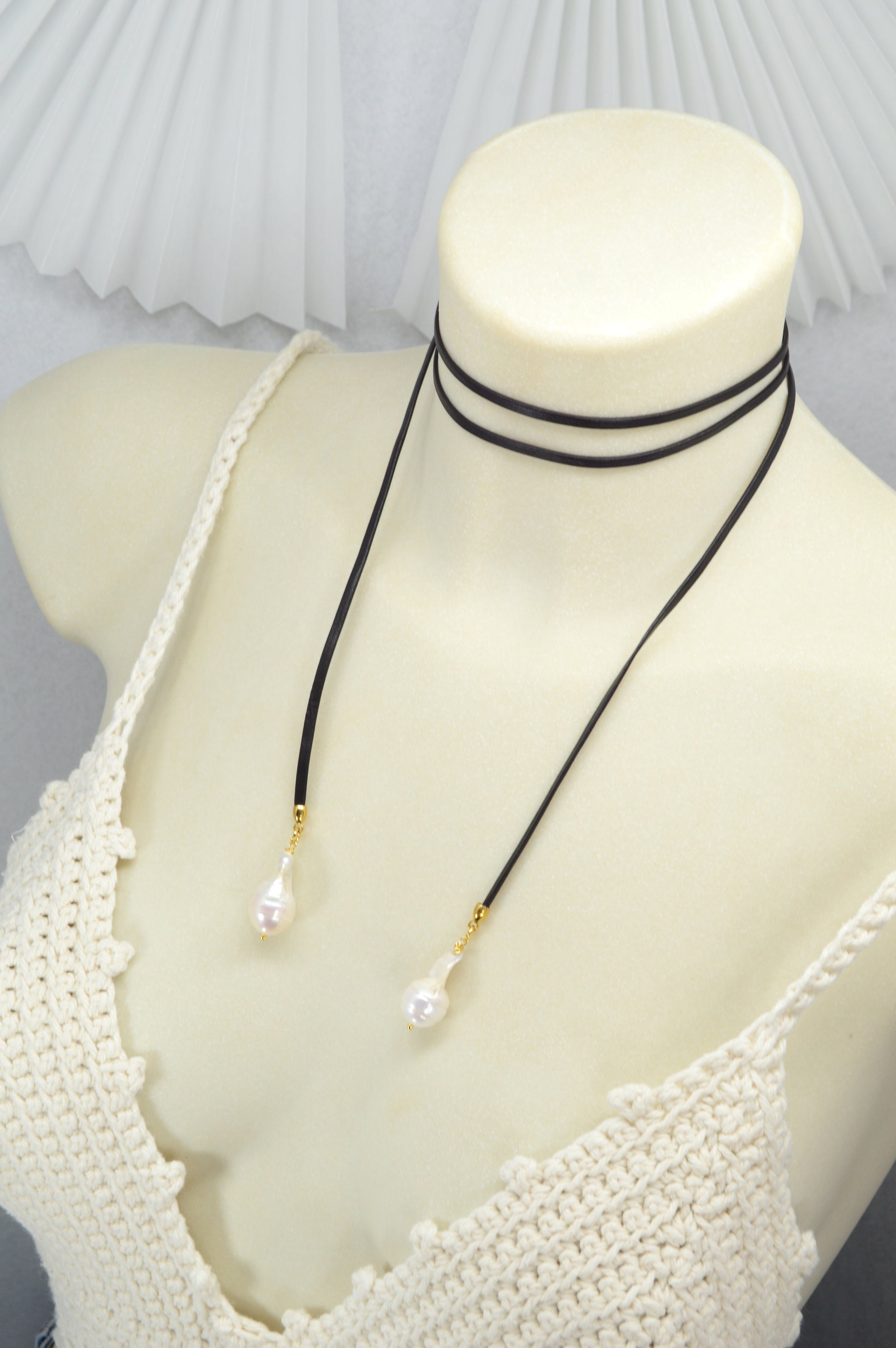 Luxury Baroque Pearl Leather Wrap Choker Necklace – Black Leather Cord, Gold Details, Statement Jewelry