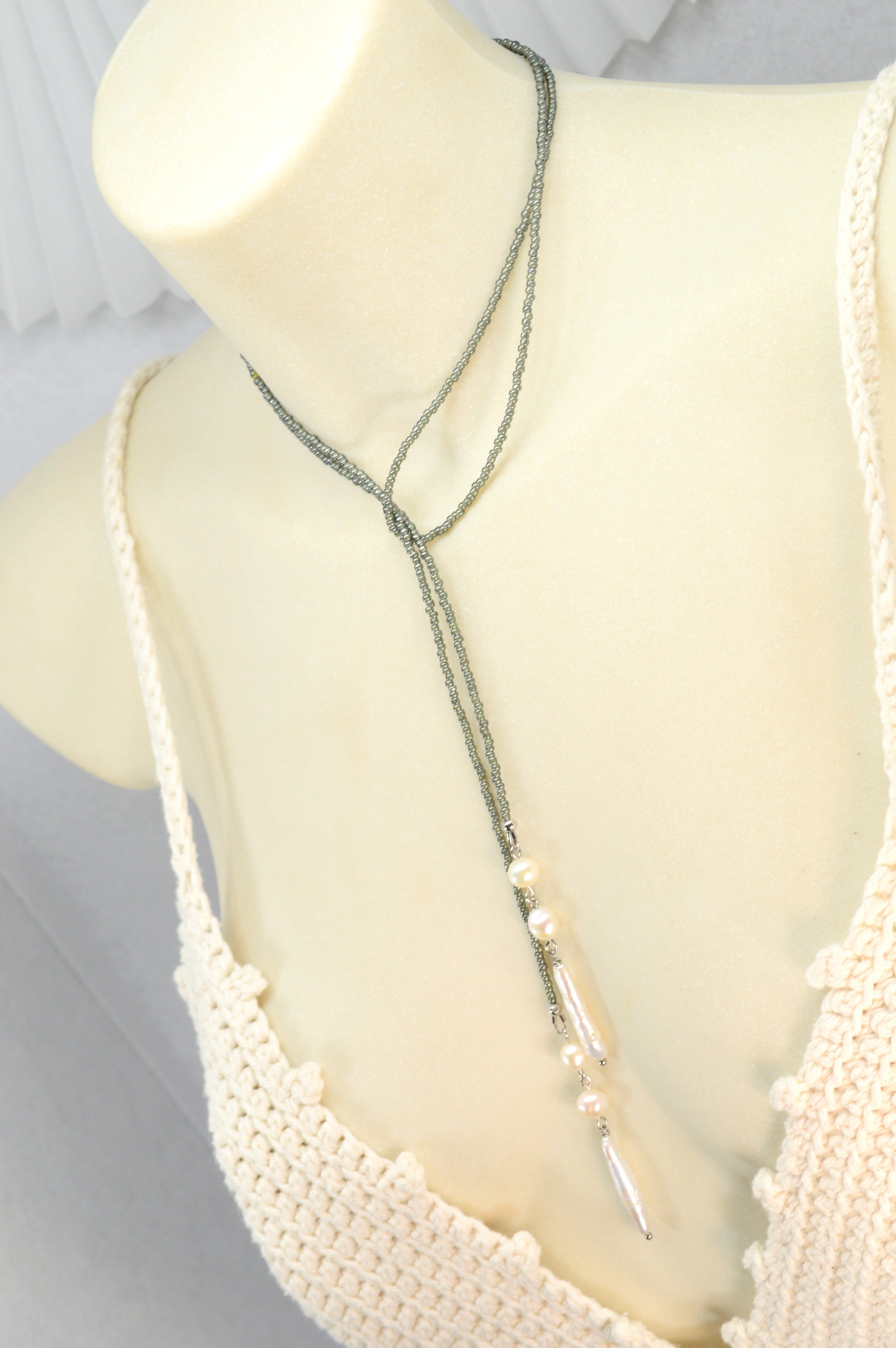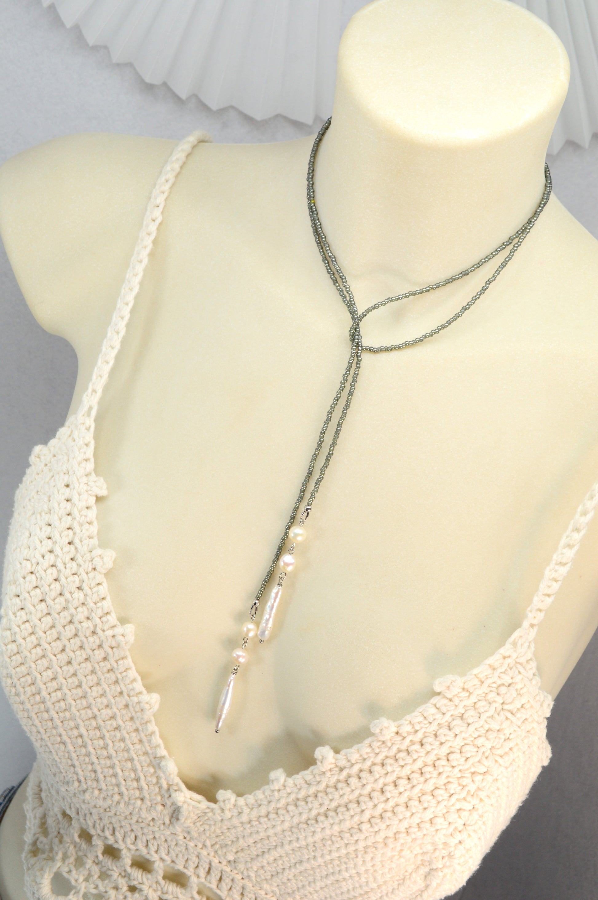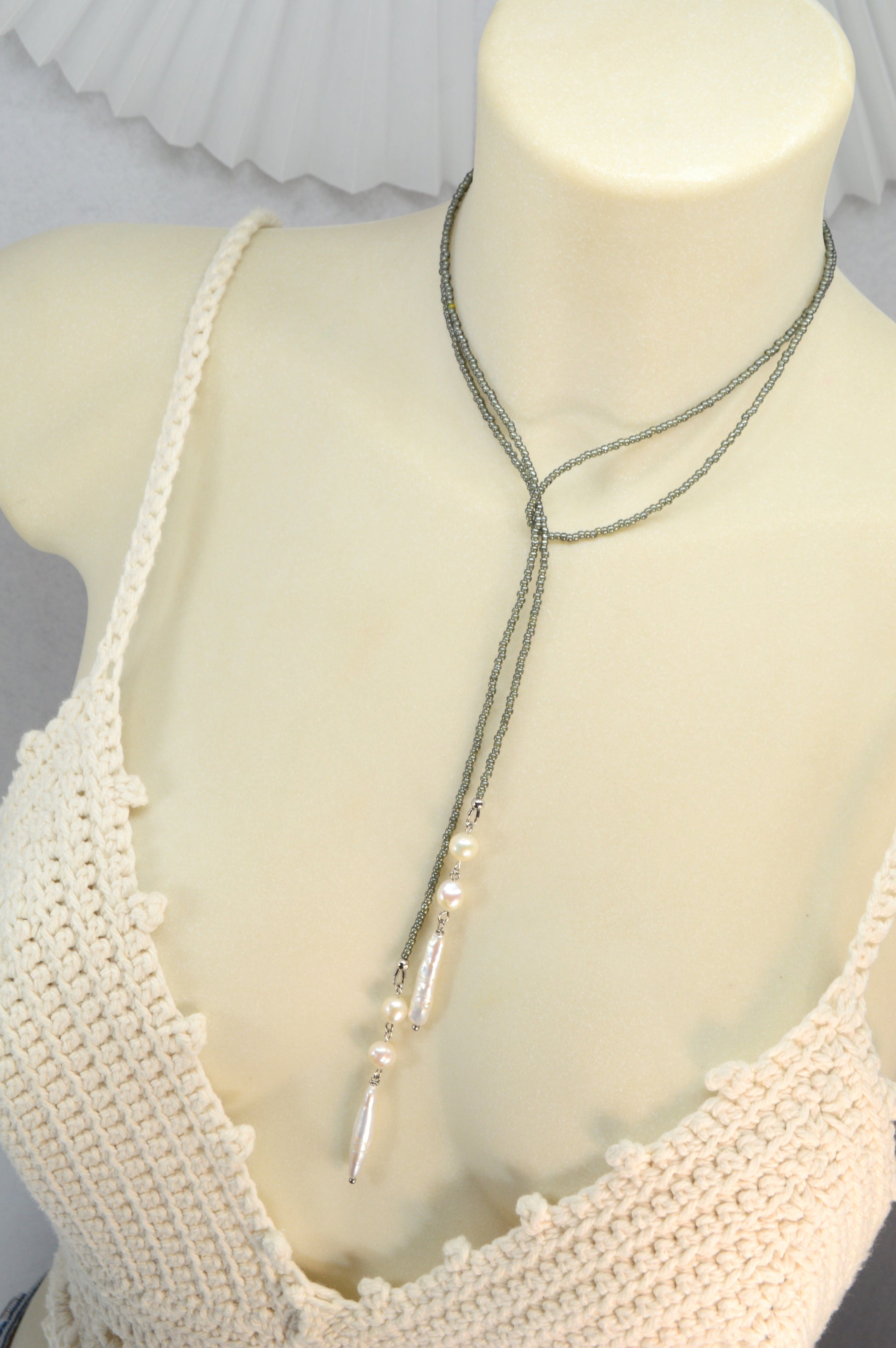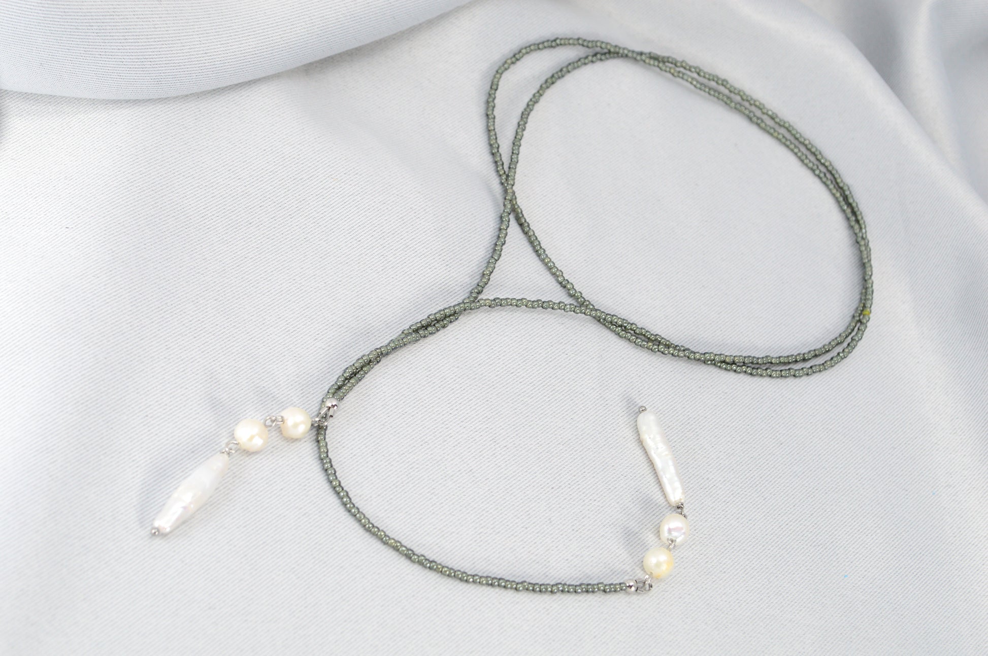 Step into effortless elegance with this handmade minimalist necklace, crafted with shimmering seed beads in a subtle metallic hue and finished with genuine freshwater pearls in organic shapes. The unique design combines delicate strands with natural pearl drops, making it the perfect balance of modern simplicity and timeless sophistication.