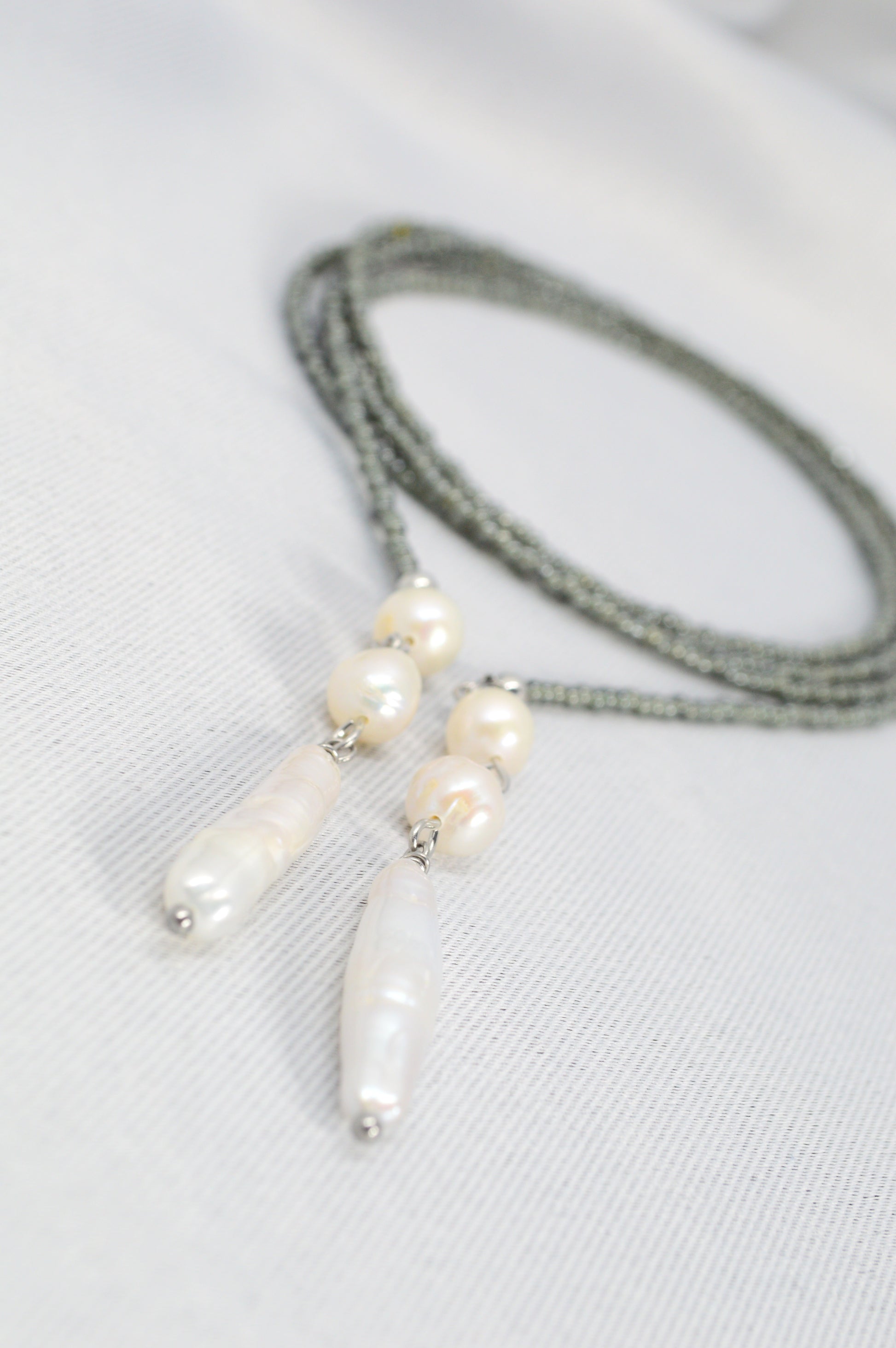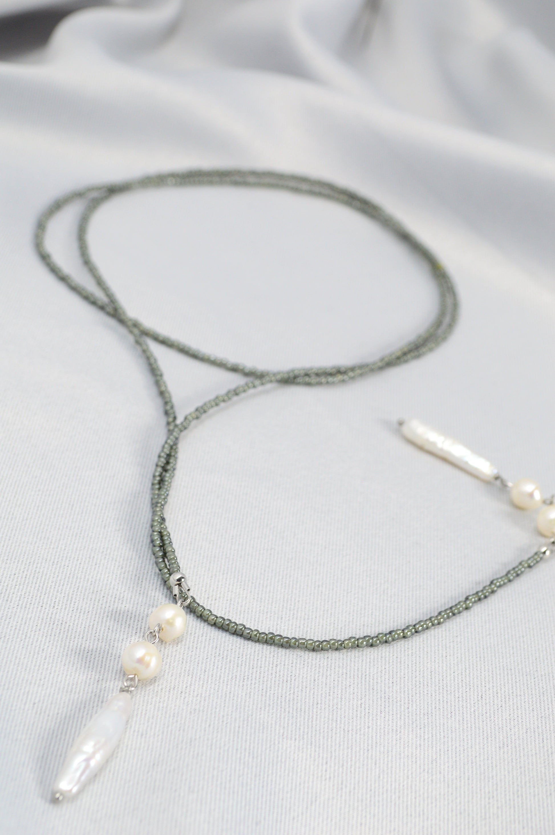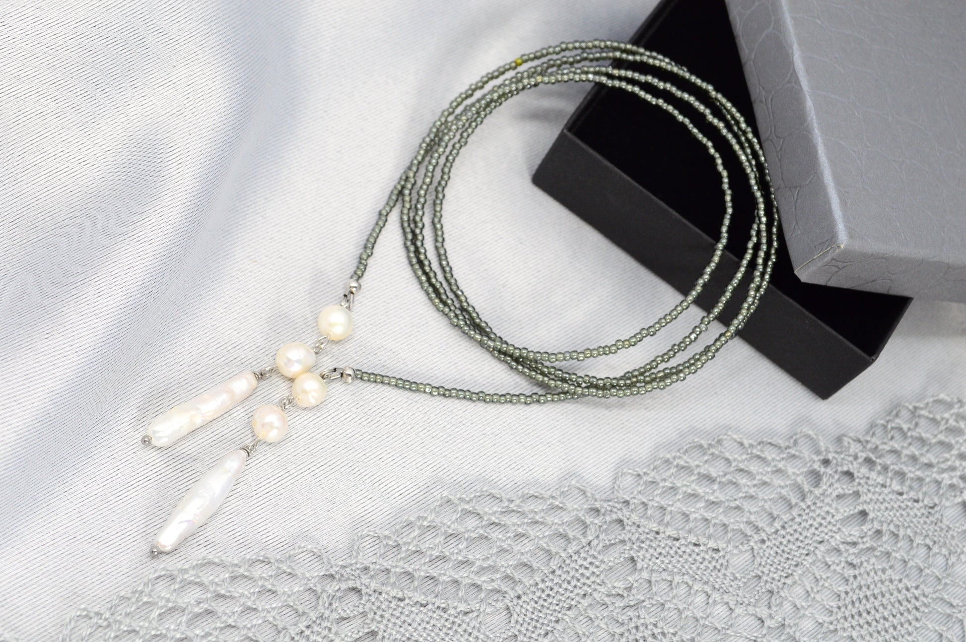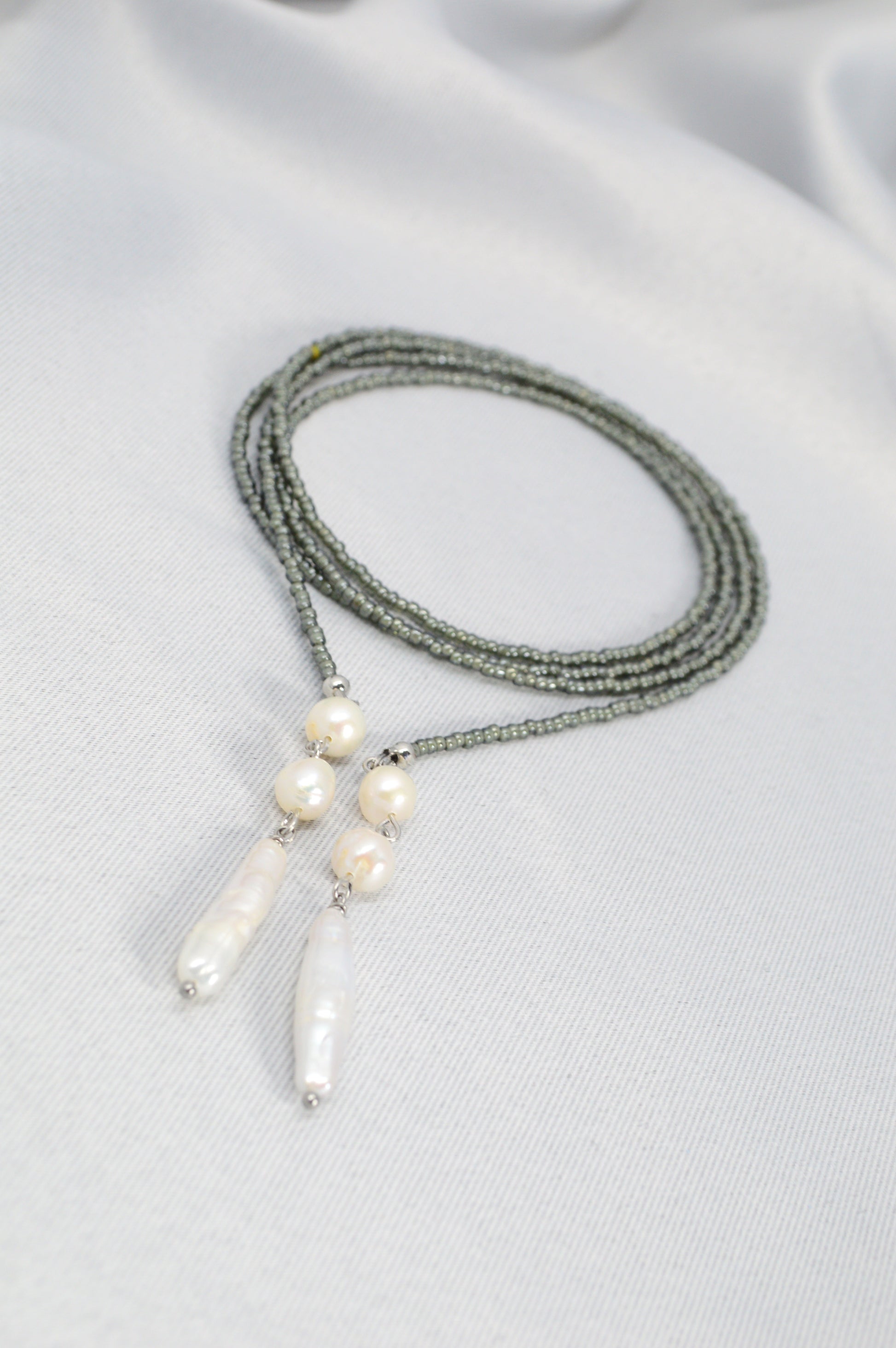 Step into effortless elegance with this handmade minimalist necklace, crafted with shimmering seed beads in a subtle metallic hue and finished with genuine freshwater pearls in organic shapes. The unique design combines delicate strands with natural pearl drops, making it the perfect balance of modern simplicity and timeless sophistication.