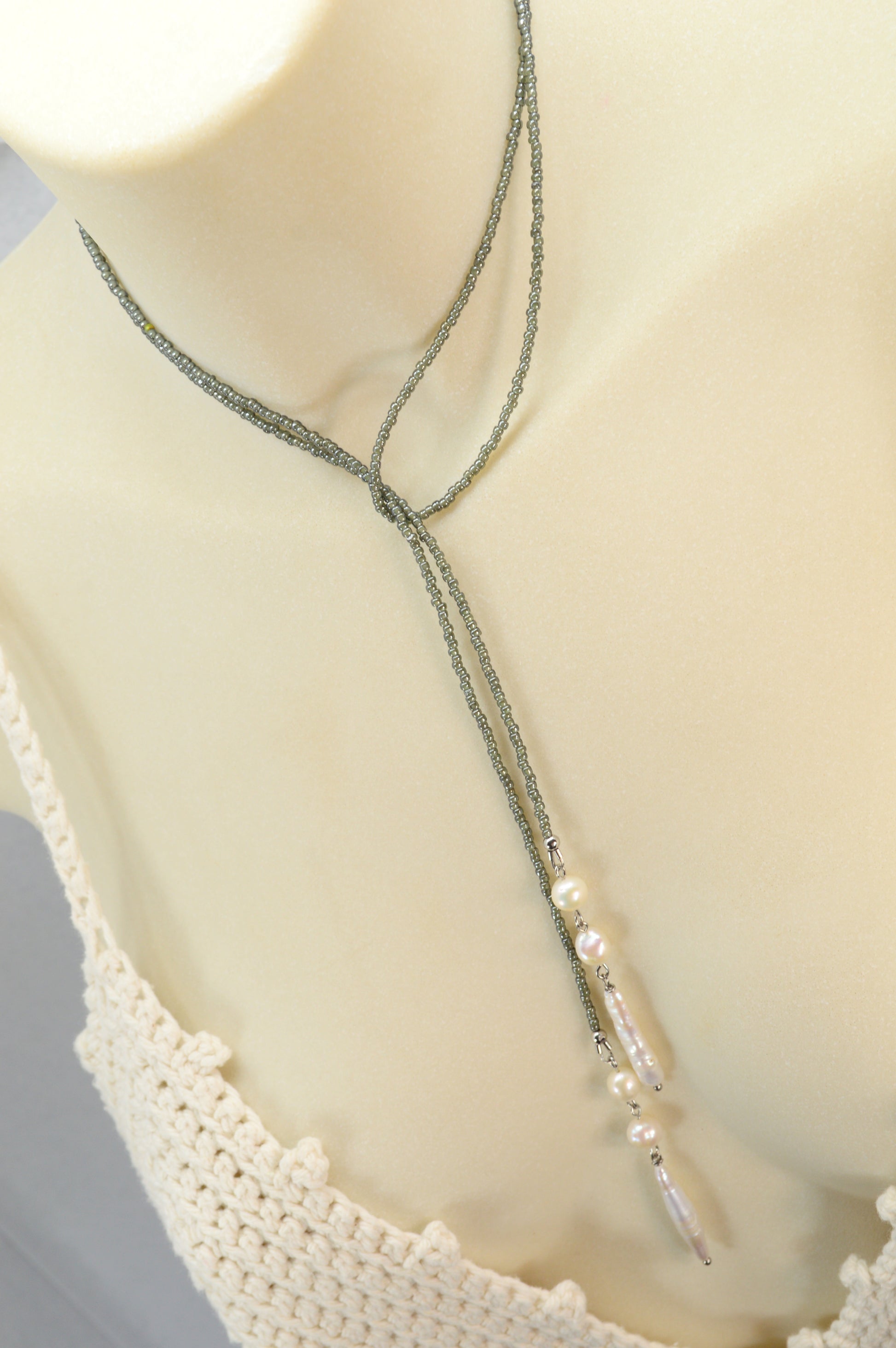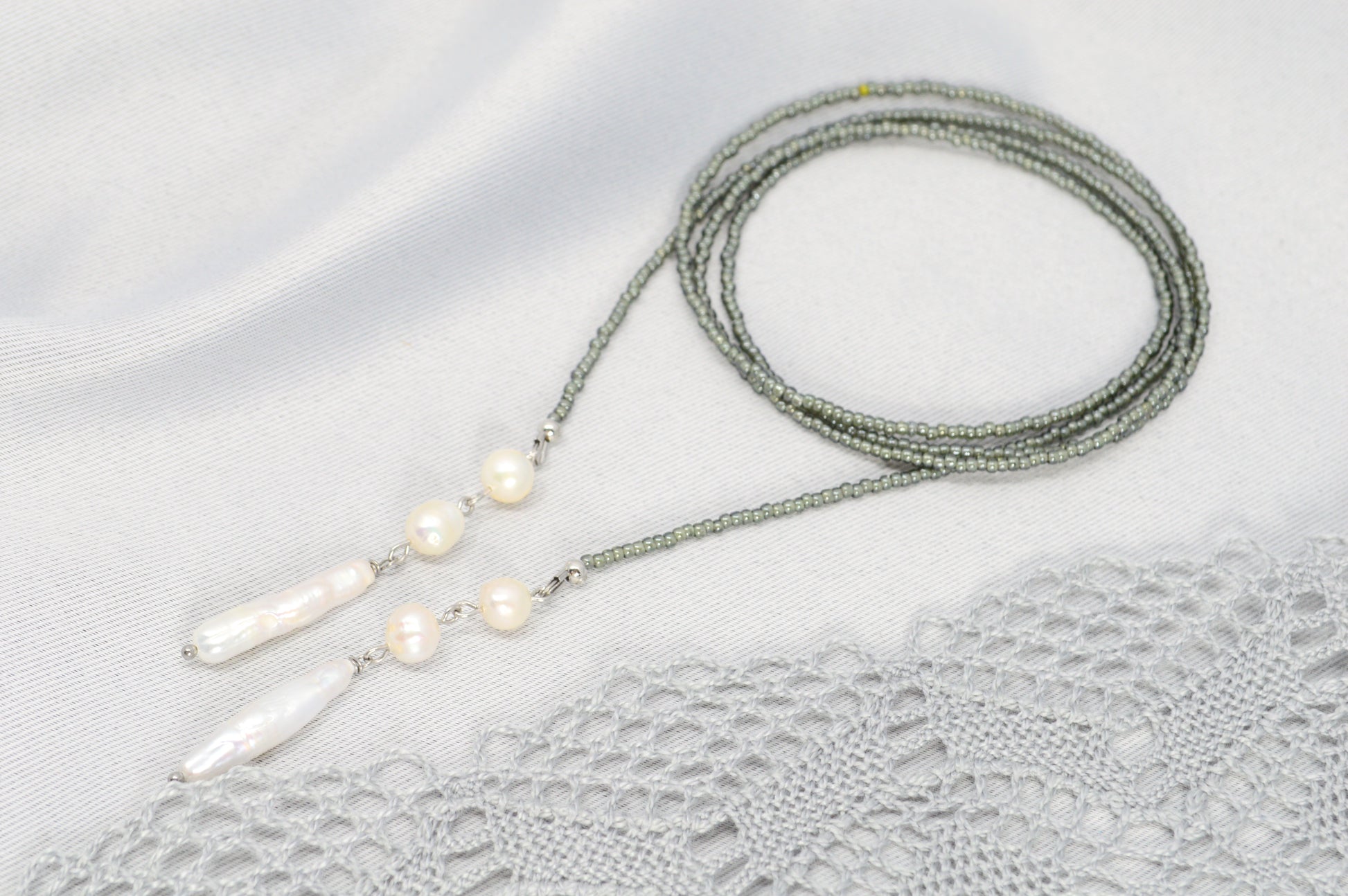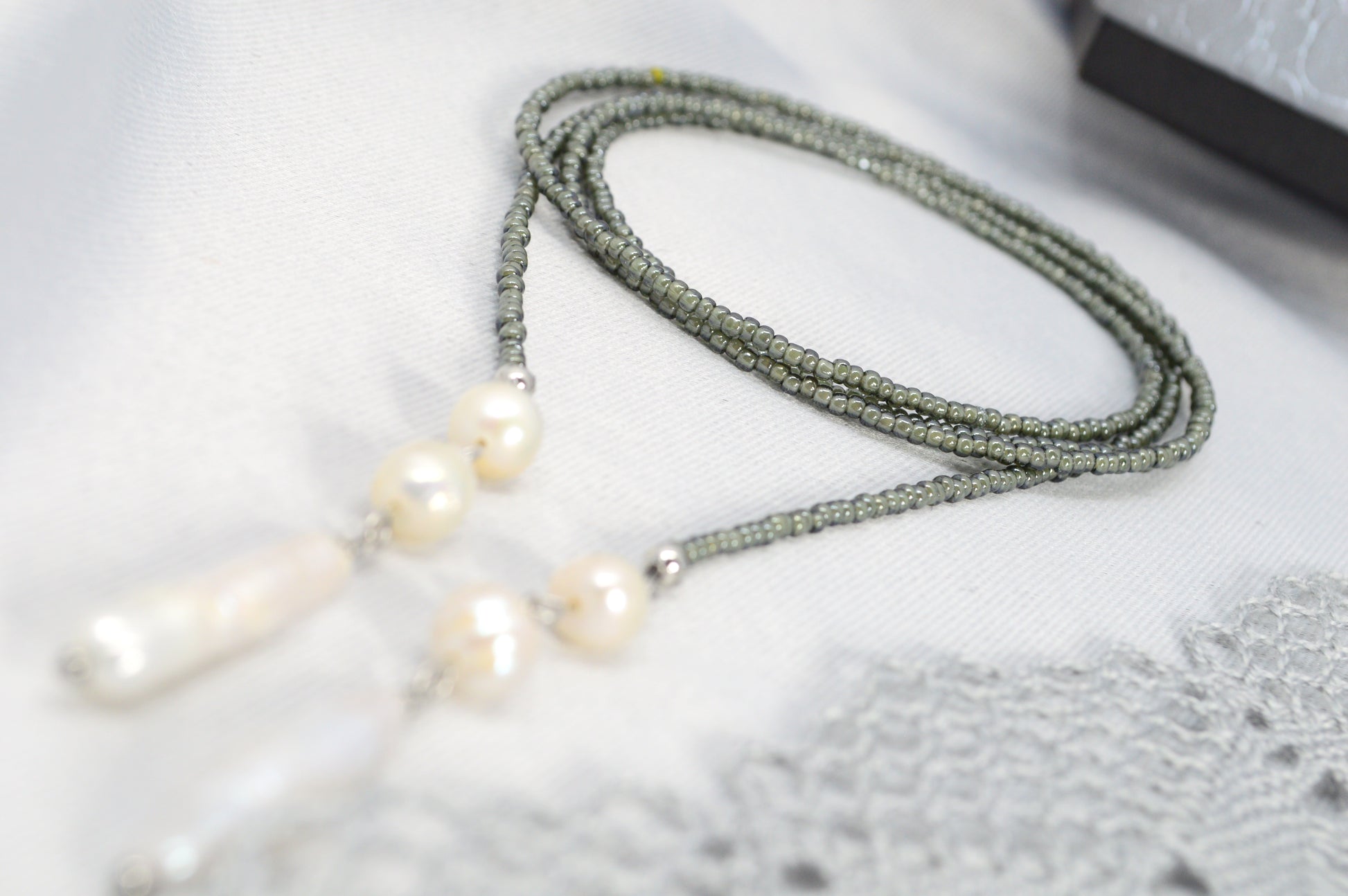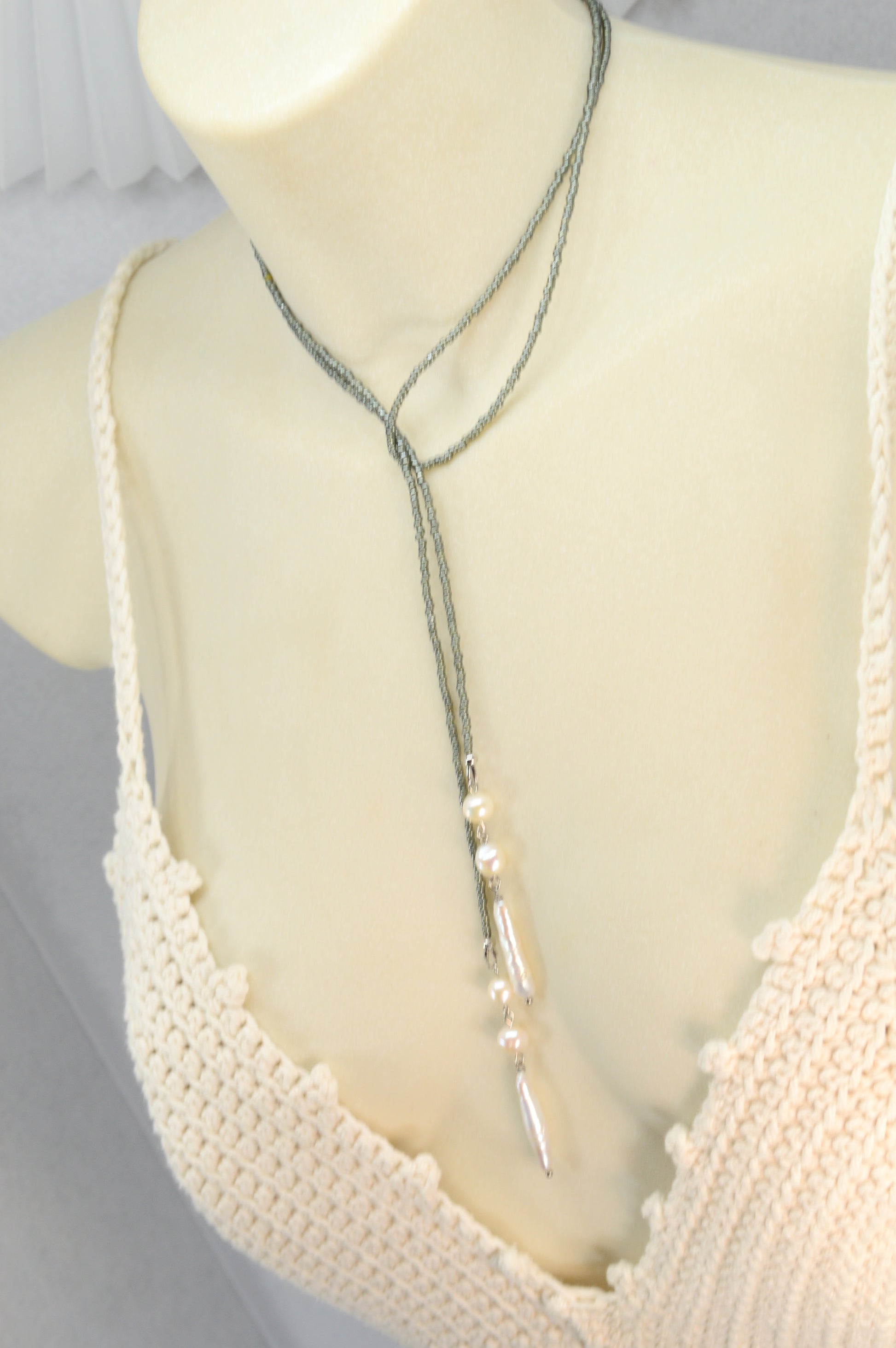 Step into effortless elegance with this handmade minimalist necklace, crafted with shimmering seed beads in a subtle metallic hue and finished with genuine freshwater pearls in organic shapes. The unique design combines delicate strands with natural pearl drops, making it the perfect balance of modern simplicity and timeless sophistication.