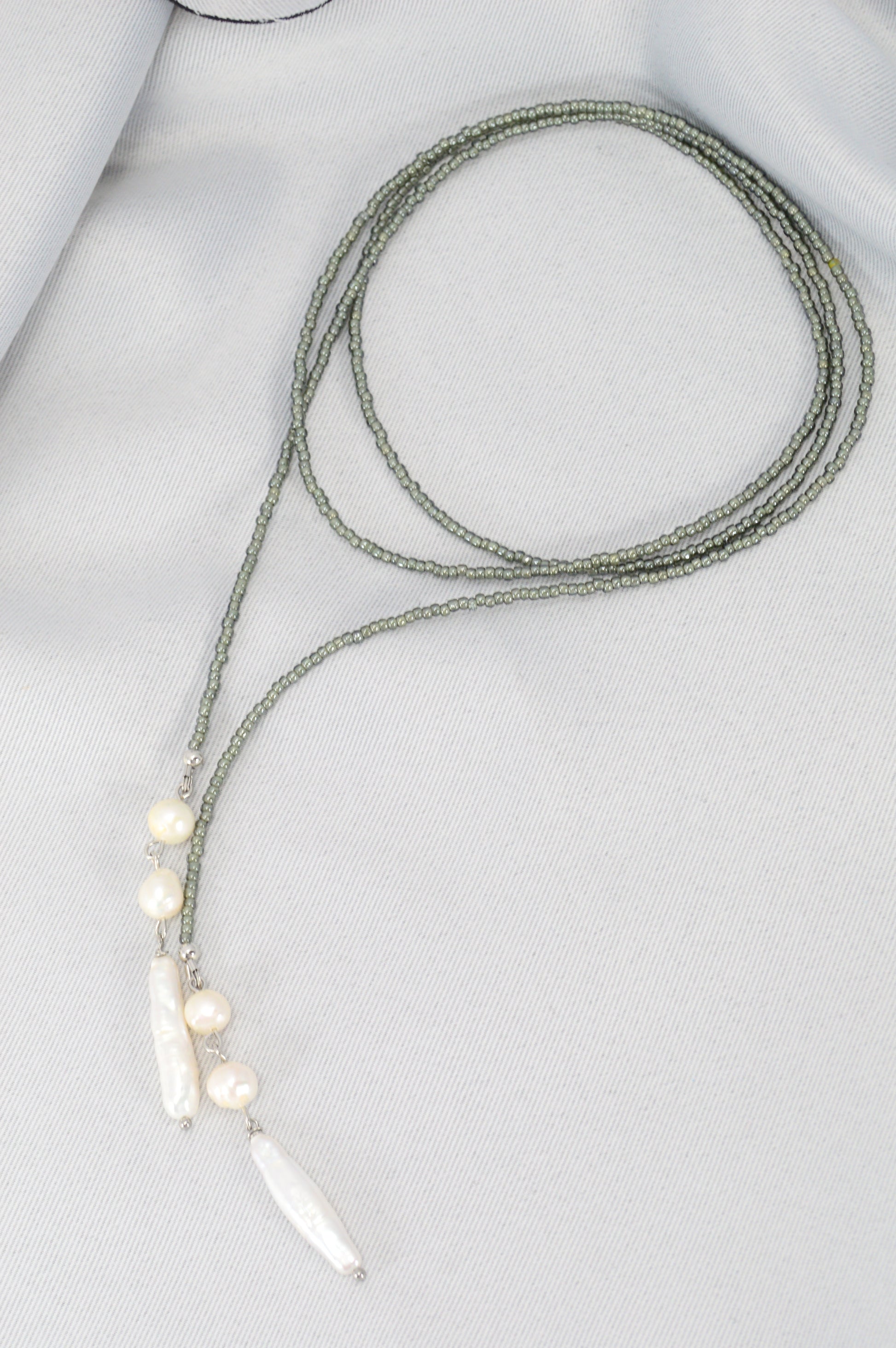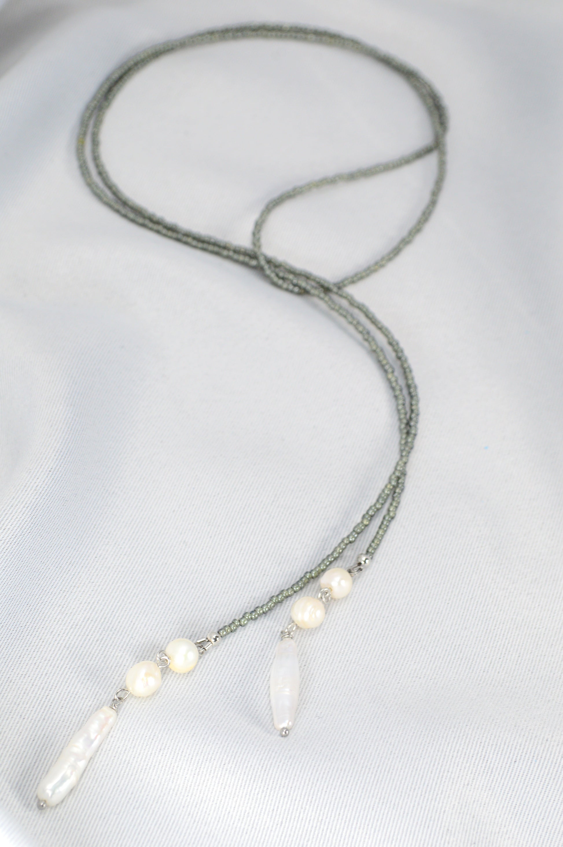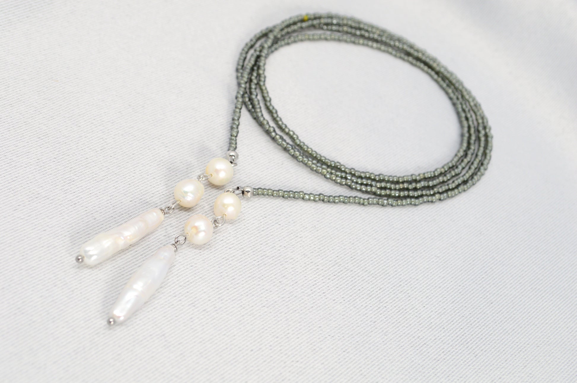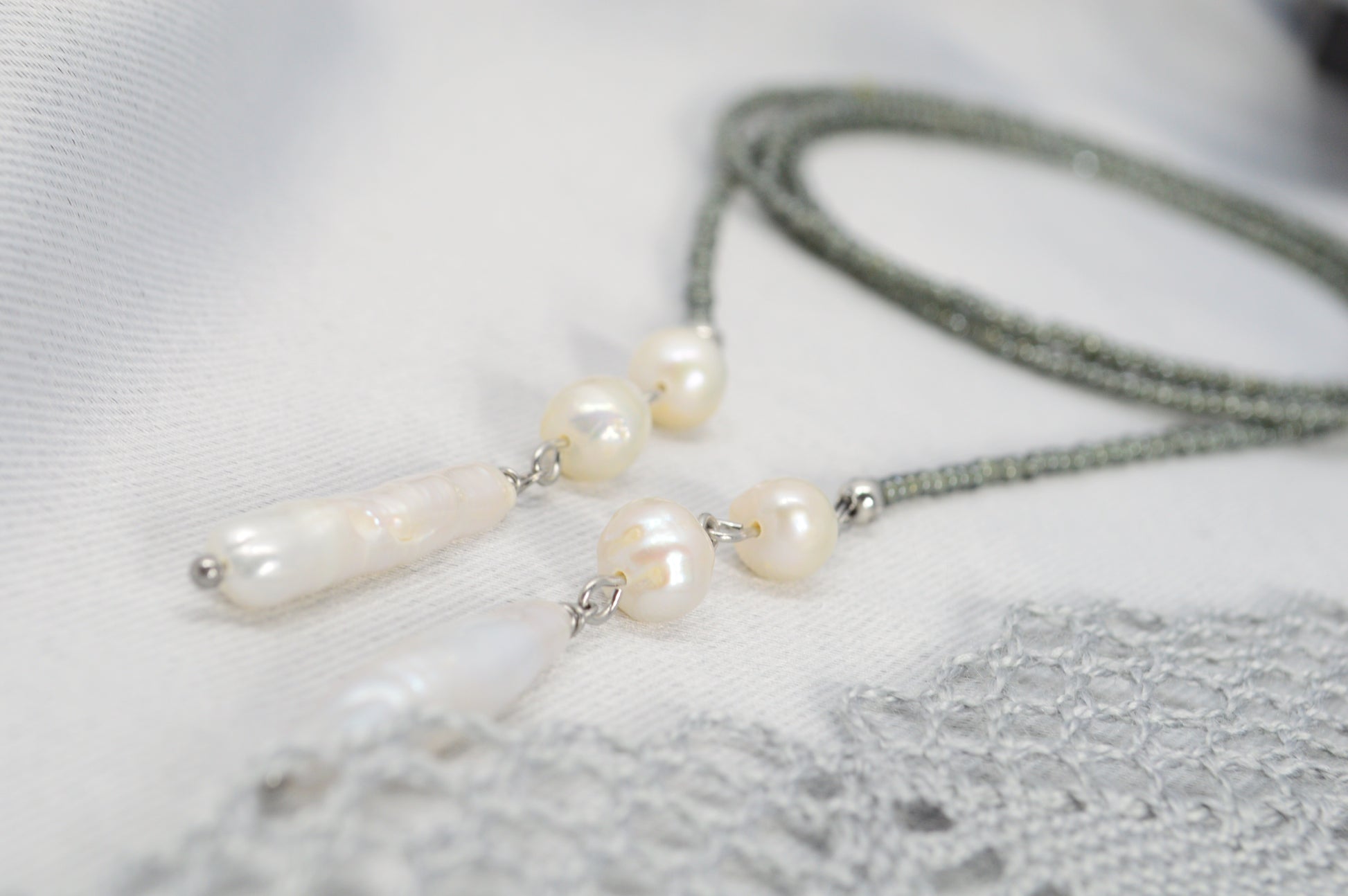 Step into effortless elegance with this handmade minimalist necklace, crafted with shimmering seed beads in a subtle metallic hue and finished with genuine freshwater pearls in organic shapes. The unique design combines delicate strands with natural pearl drops, making it the perfect balance of modern simplicity and timeless sophistication.