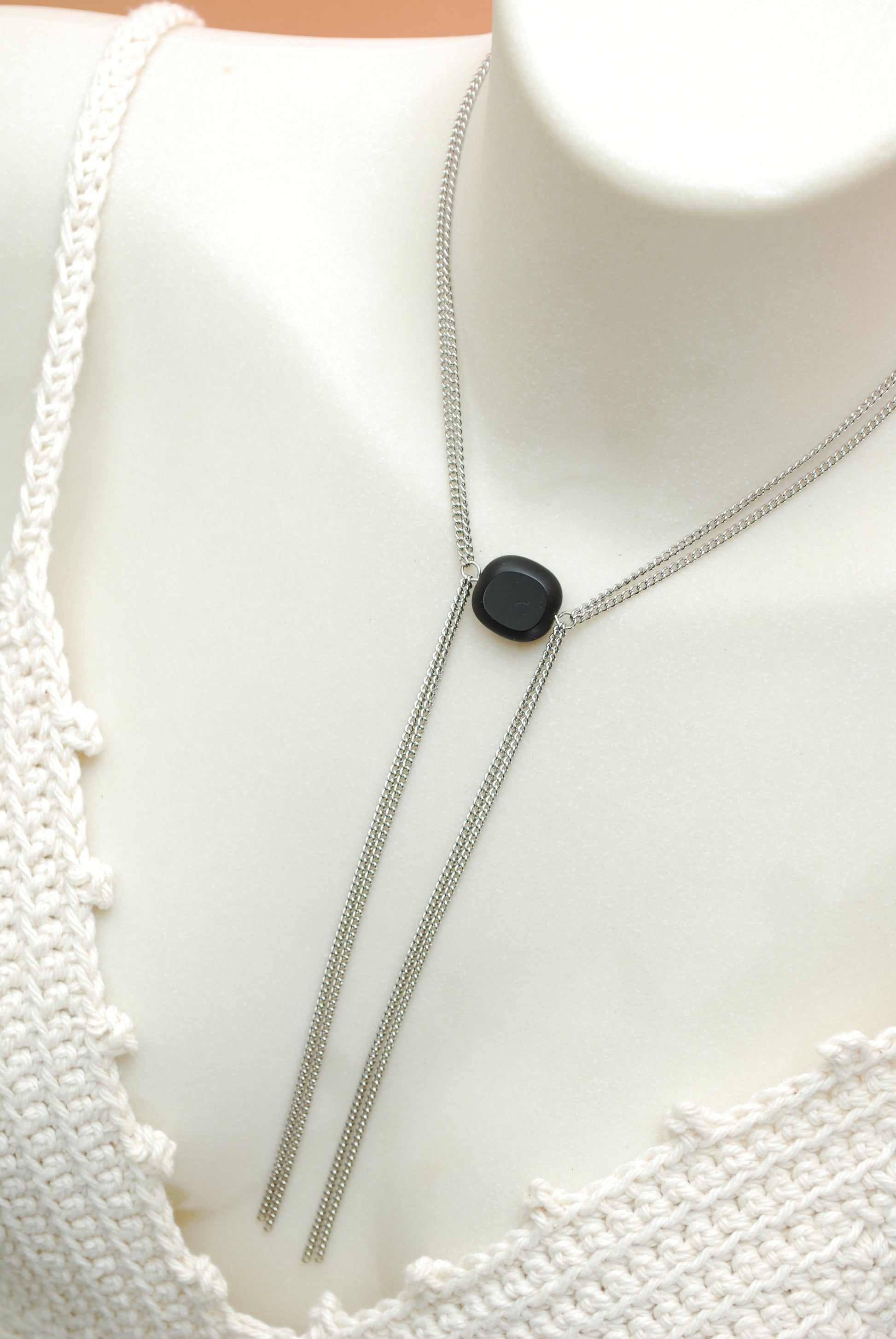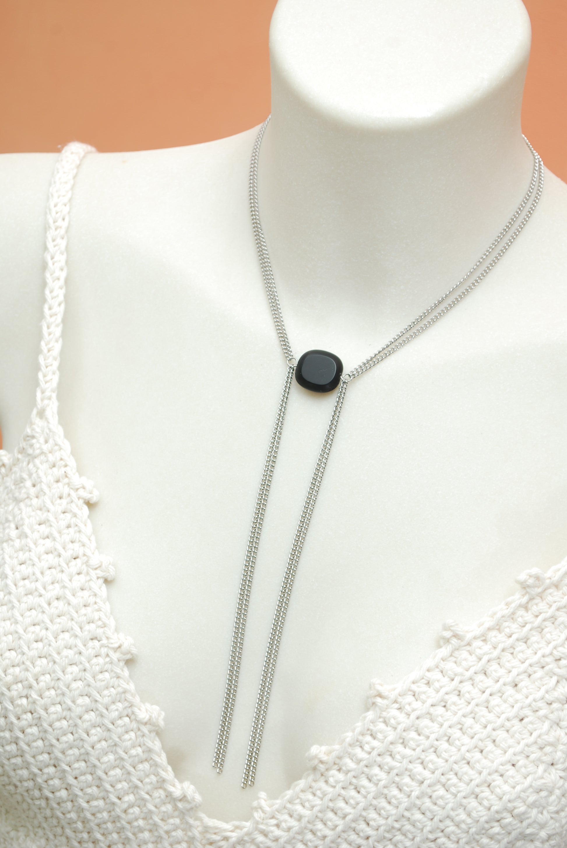 This minimalist lariat necklace features a clean, modern design with a subtle glass accent that adds depth and contrast to the piece. The elongated drop silhouette creates an elegant vertical line, making the necklace flattering and easy to style with a variety of outfits. Perfect for everyday wear, this modern statement necklace complements casual looks, knitwear, summer tops, and layered styling. Its lightweight feel and adjustable lariat form make it comfortable and versatile. Designed for women who appreciate understated jewelry with a contemporary edge, this necklace is a timeless accessory and a thoughtful gift for lovers of minimalist and modern jewelry.