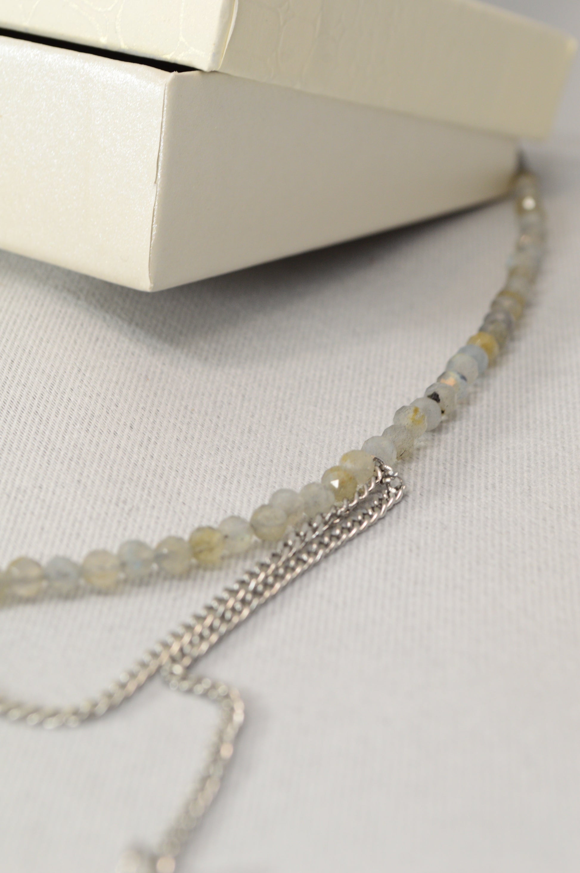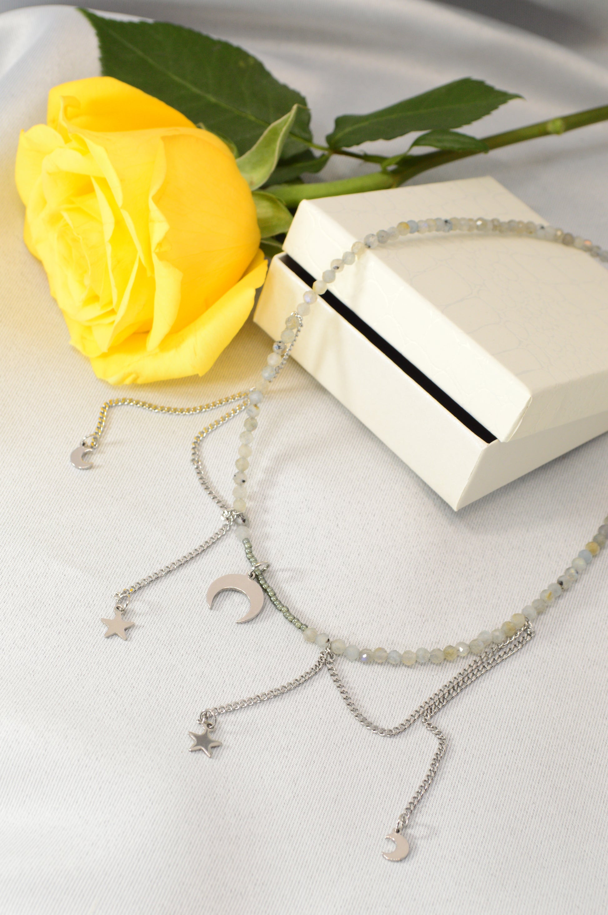 Delicate celestial necklace made from natural moonstone beads combined with stainless steel chains and tiny star & crescent charms. Soft flashes of blue from the moonstone give the piece a dreamy, magical look. Perfect for layering with your favorite silver chains, adding a celestial touch to everyday outfits, or gifting someone who loves mystical, gentle jewelry. Made on durable stainless steel — won’t tarnish, great for daily wear.