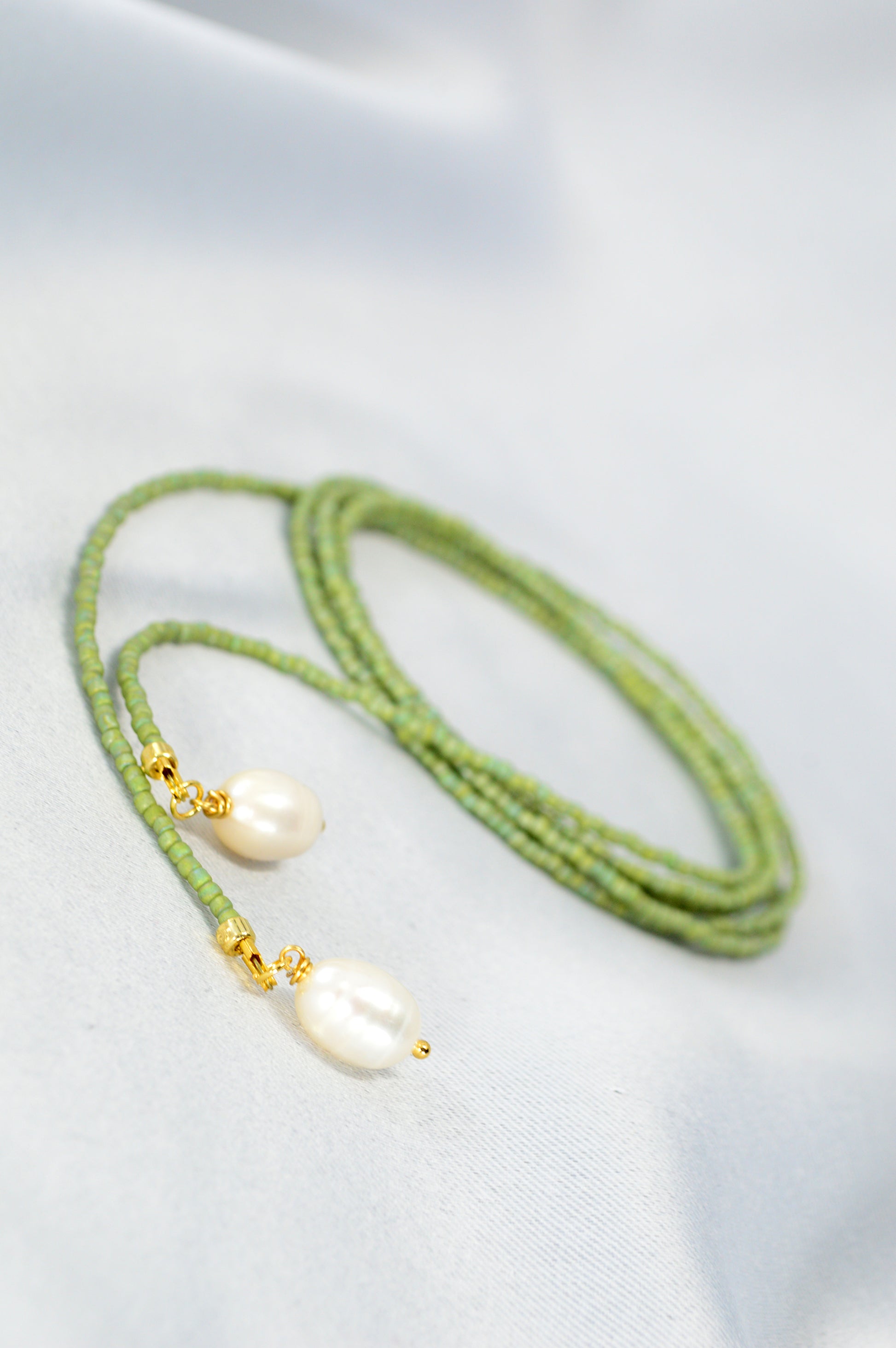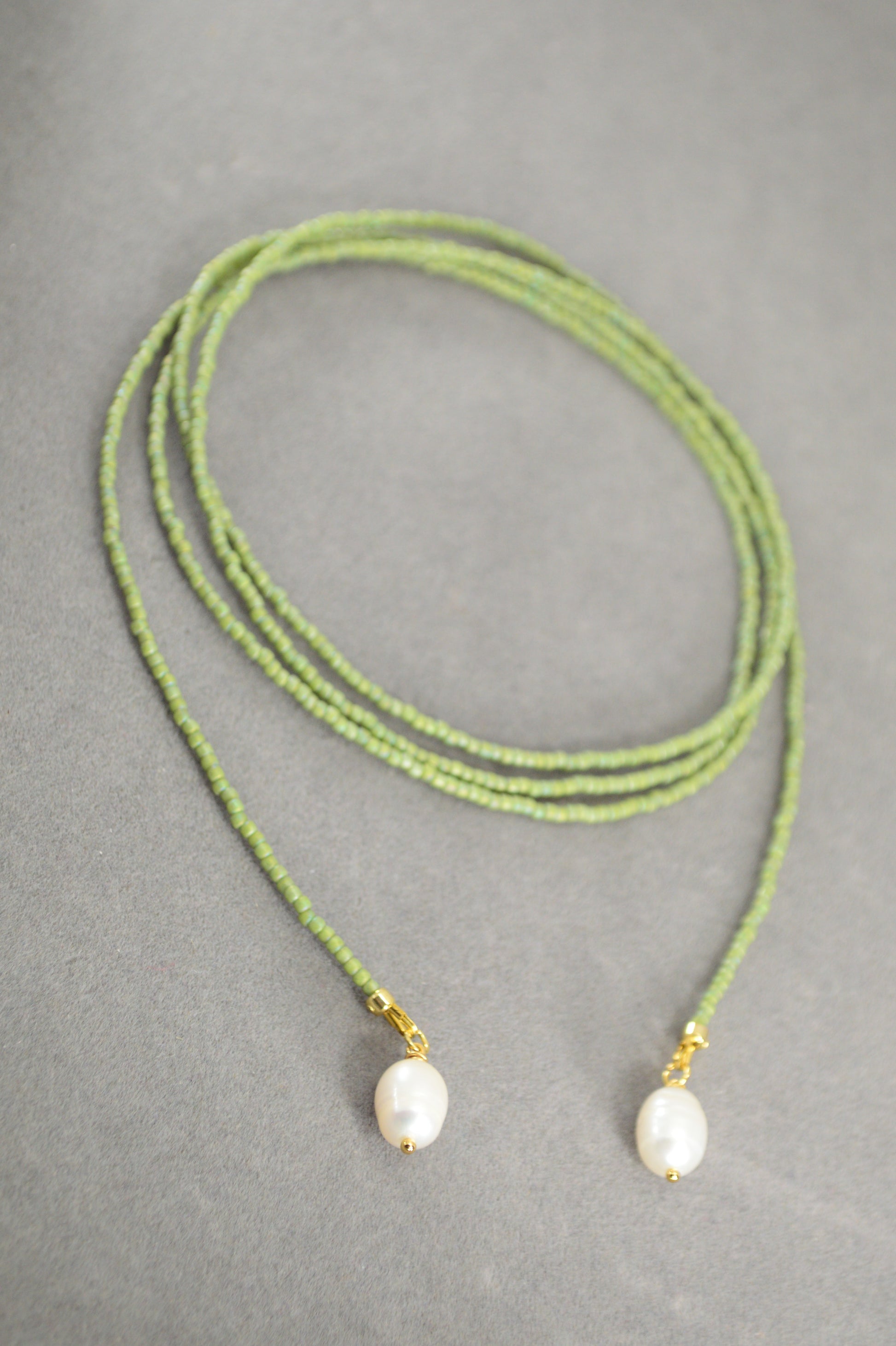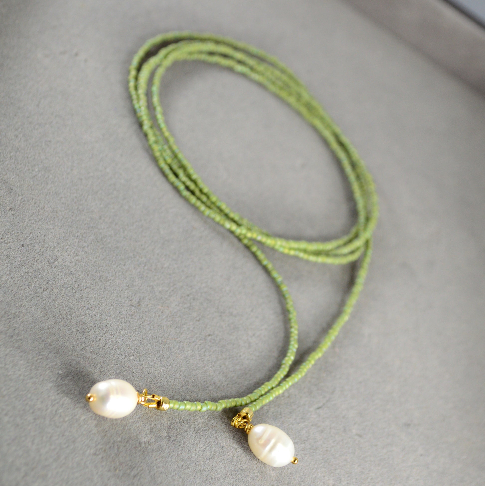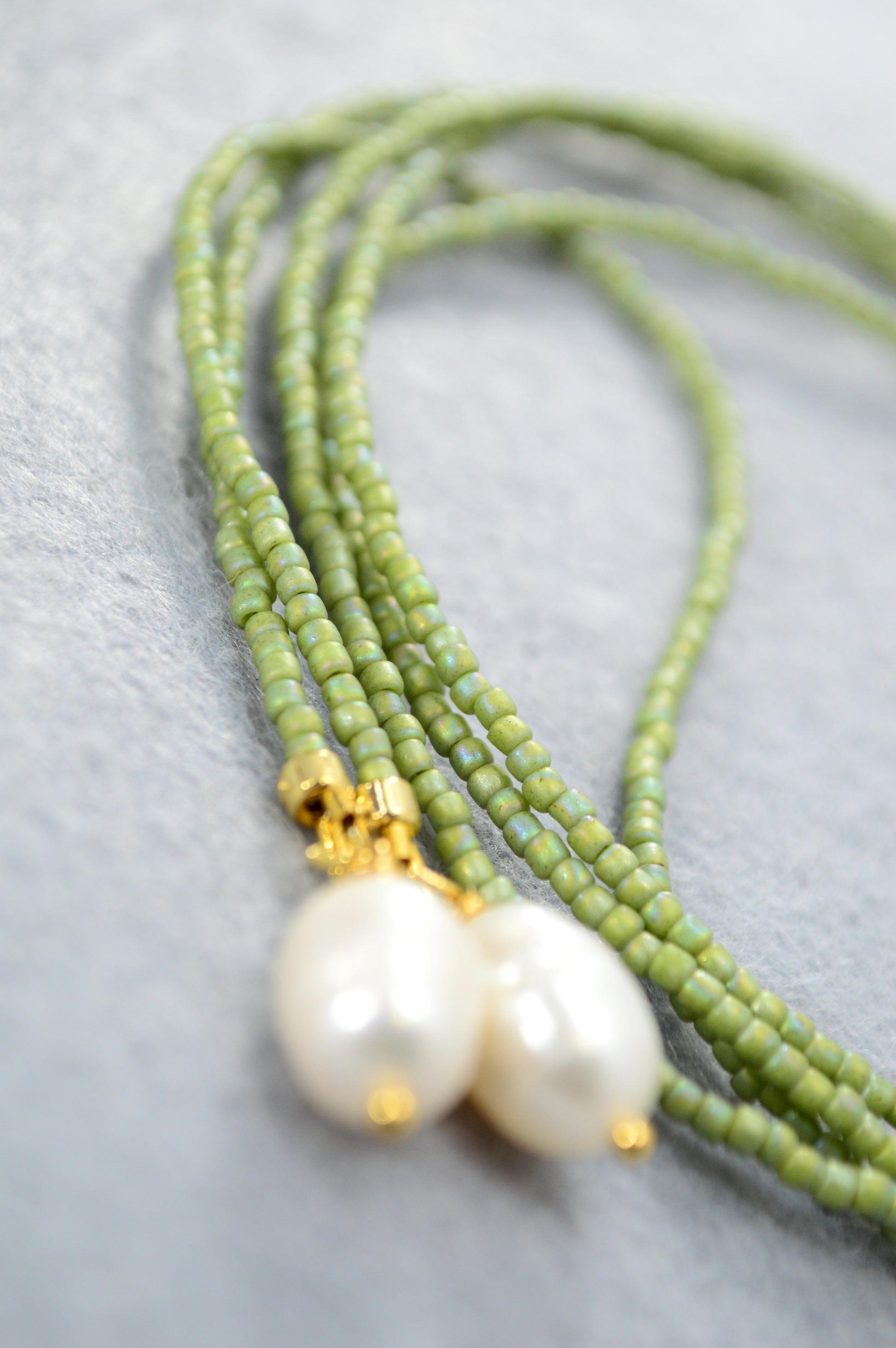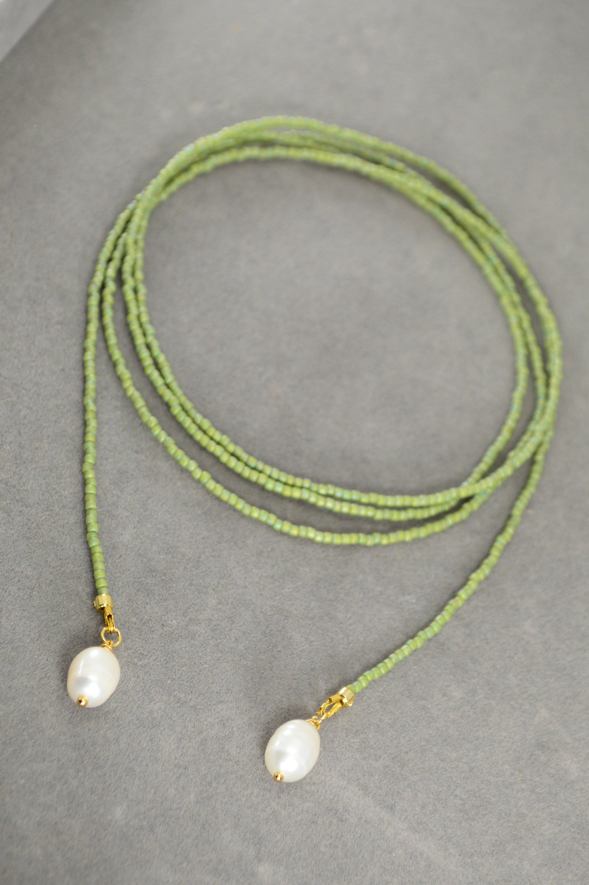This olive green beaded lariat necklace features delicate seed beads and elegant freshwater pearl drops, creating a refined boho-chic look. The adjustable lariat design wraps gracefully around the neck, forming a flattering Y-shape silhouette that elongates the neckline. Perfect for summer outfits, beach weddings, Mediterranean-inspired styling, or layered bohemian looks, this green pearl necklace adds a natural, earthy touch to any wardrobe. Lightweight and feminine, it pairs beautifully with dresses, linen tops, and vacation ensembles. A versatile statement piece for women who love minimalist boho jewelry with subtle color and timeless elegance.