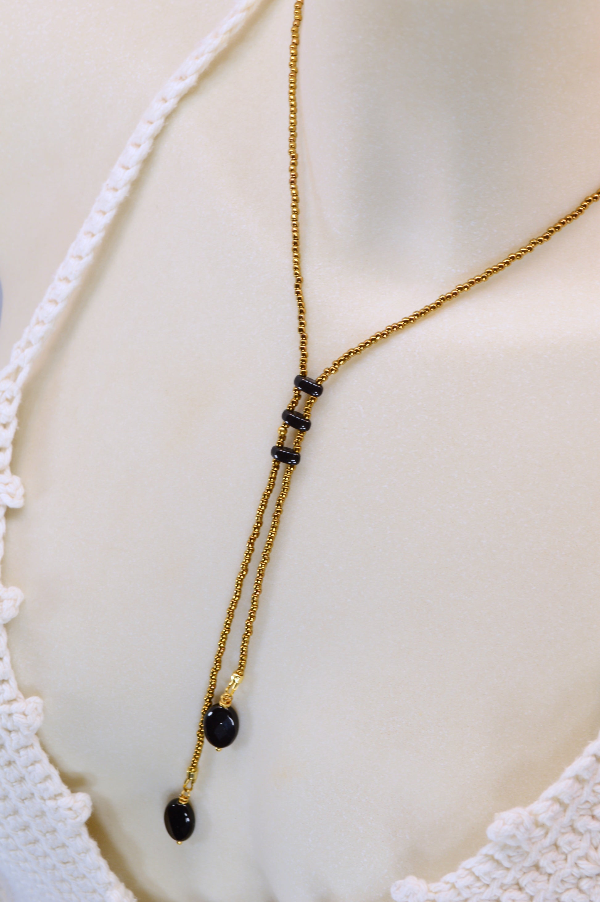 Onyx Y Lariat Necklace – Black Onyx Drops on Gold Seed Bead Chain