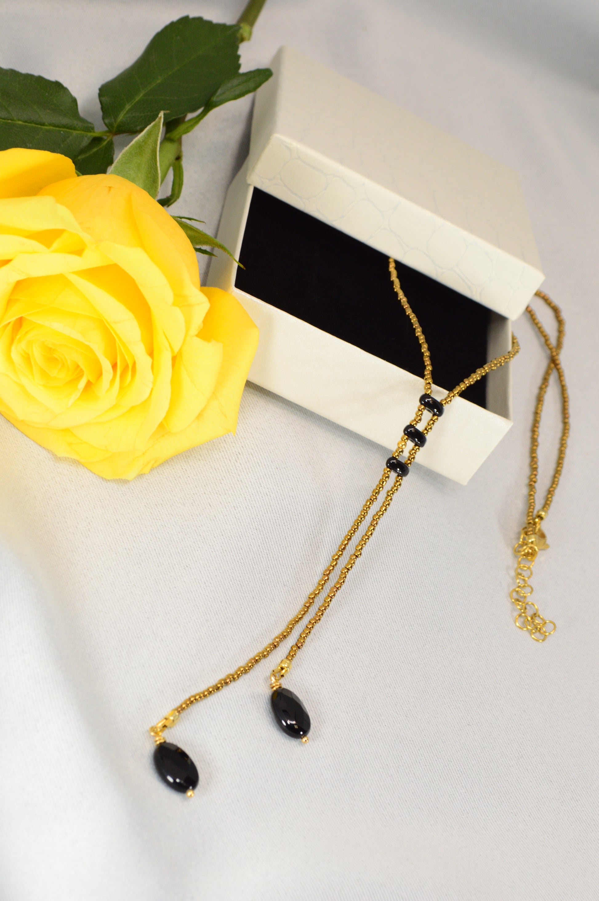 Elegant Y-shaped lariat necklace made with glossy black onyx drops and tiny gold seed beads. The sliding detail in the center lets you adjust the length of the tails, creating a soft, feminine silhouette. Minimalist, delicate and eye-catching — perfect for layering with other gold chains or wearing as a statement piece with an open neckline. Ideal for summer outfits, evening looks, gifting, or adding a chic accent to your everyday style.
