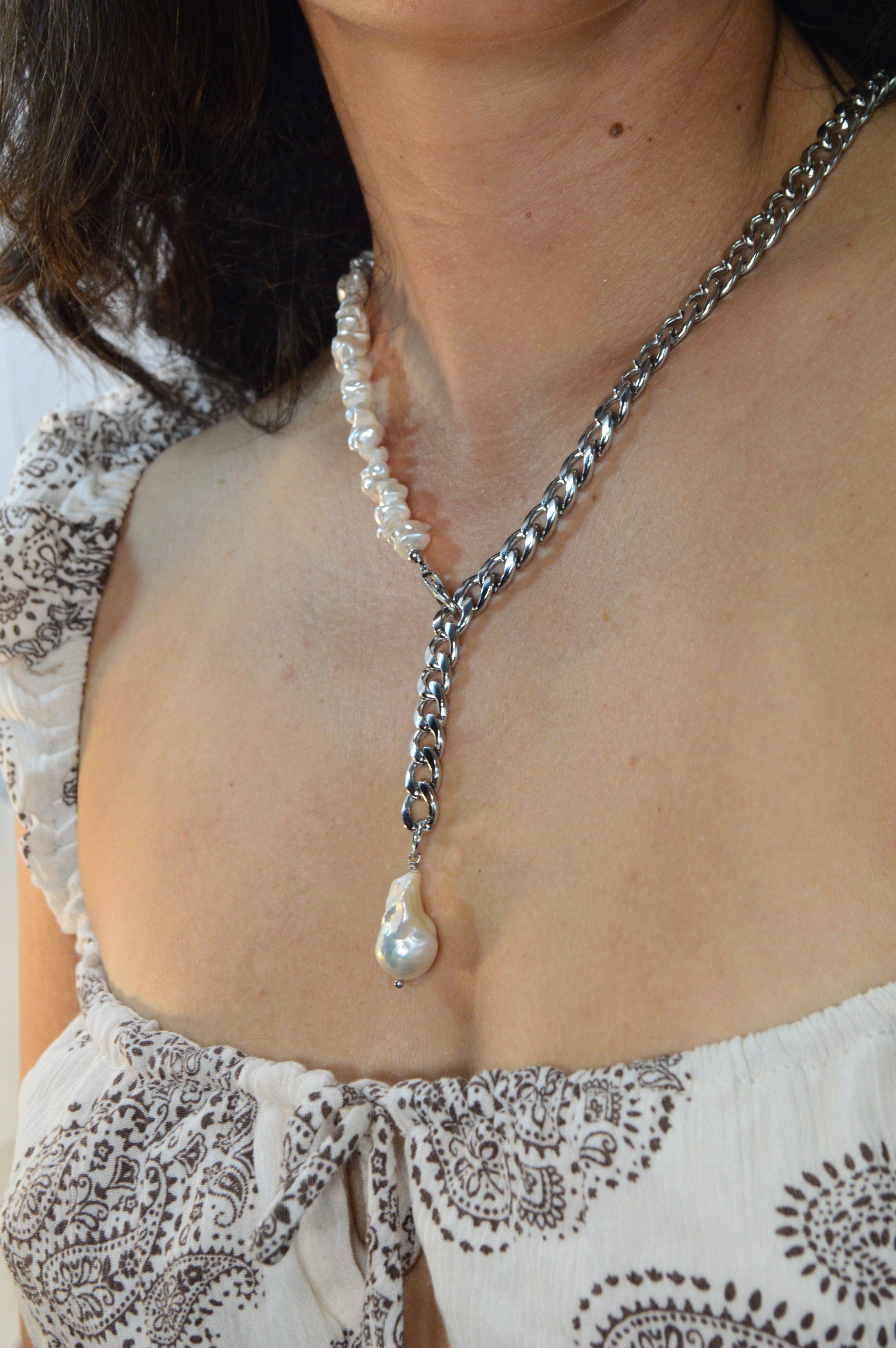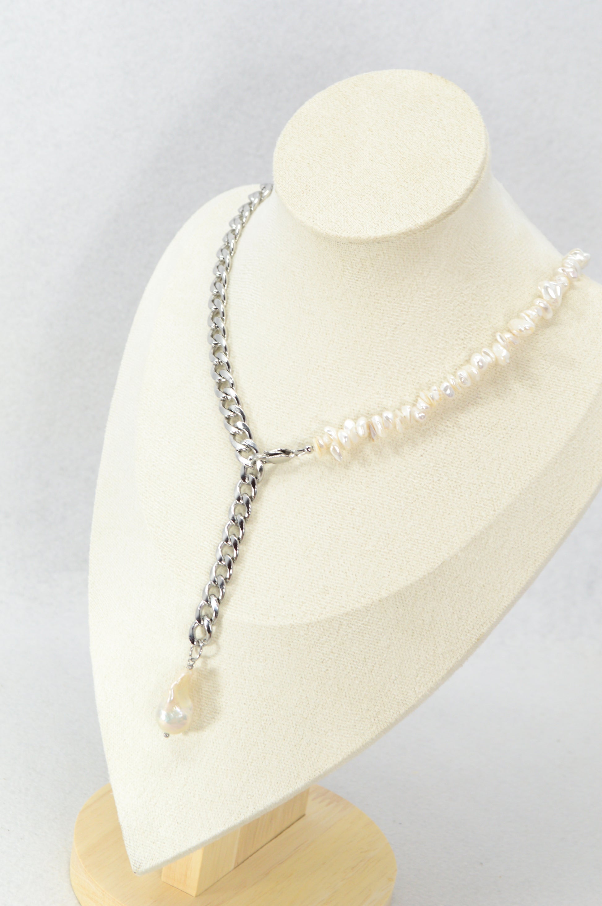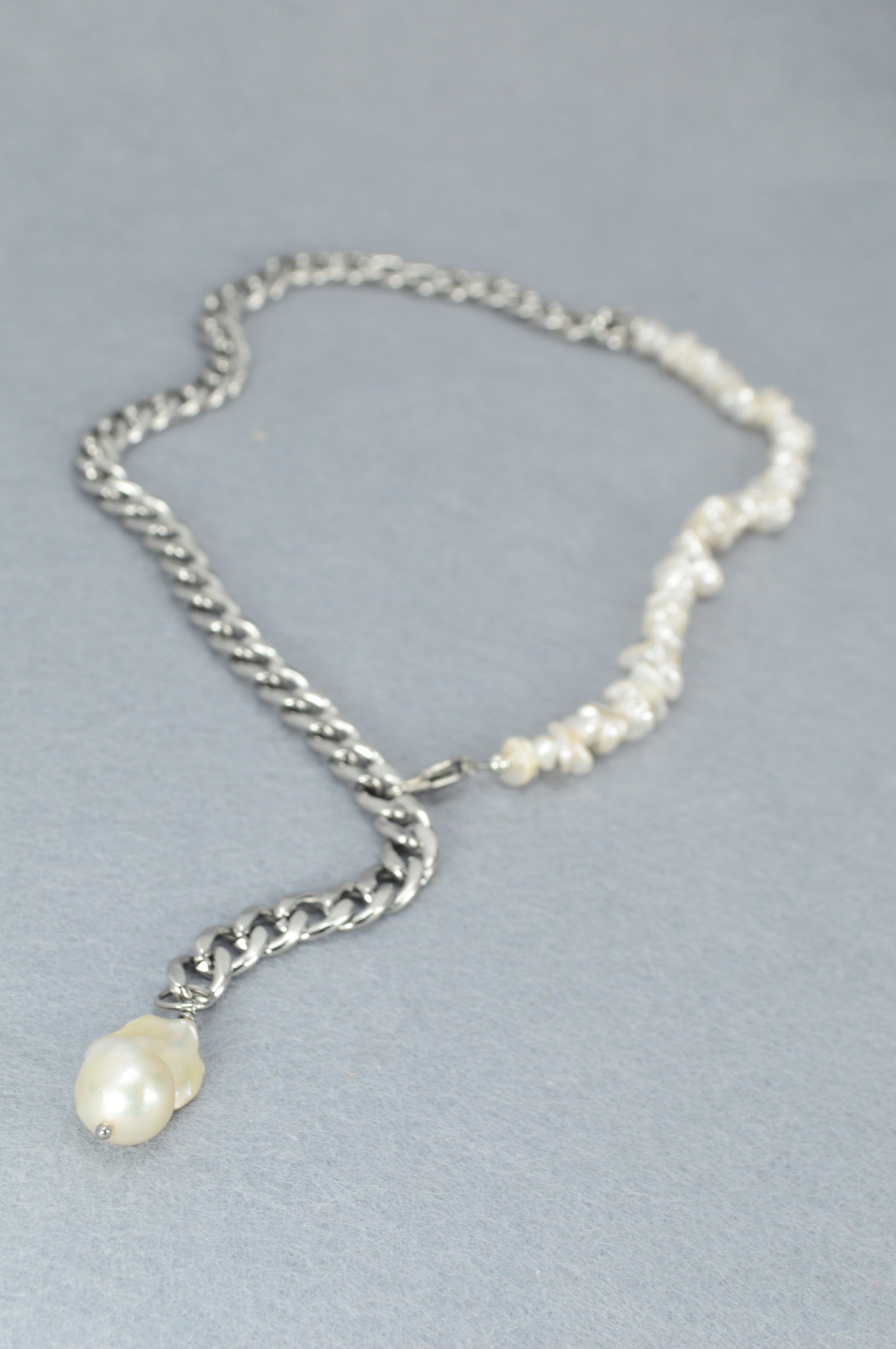This handcrafted necklace combines a modern stainless steel chain with soft, organic textures of mother-of-pearl beads. The design features a striking asymmetry: smooth chain links on one side and shimmering, irregular-shaped mother-of-pearl pearls on the other. The final touch? A beautiful, one-of-a-kind natural freshwater pearl drop pendant that makes this piece truly special.