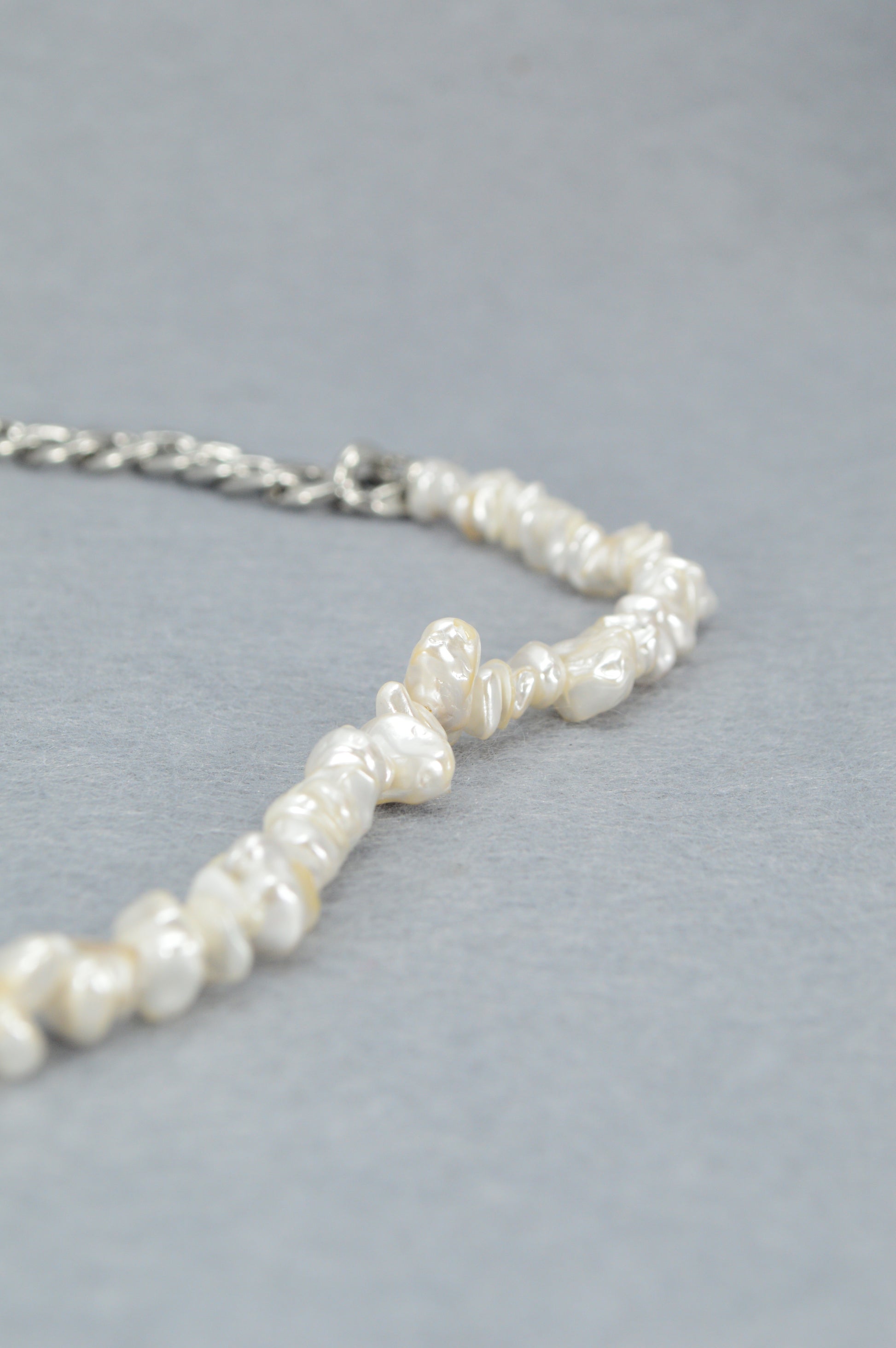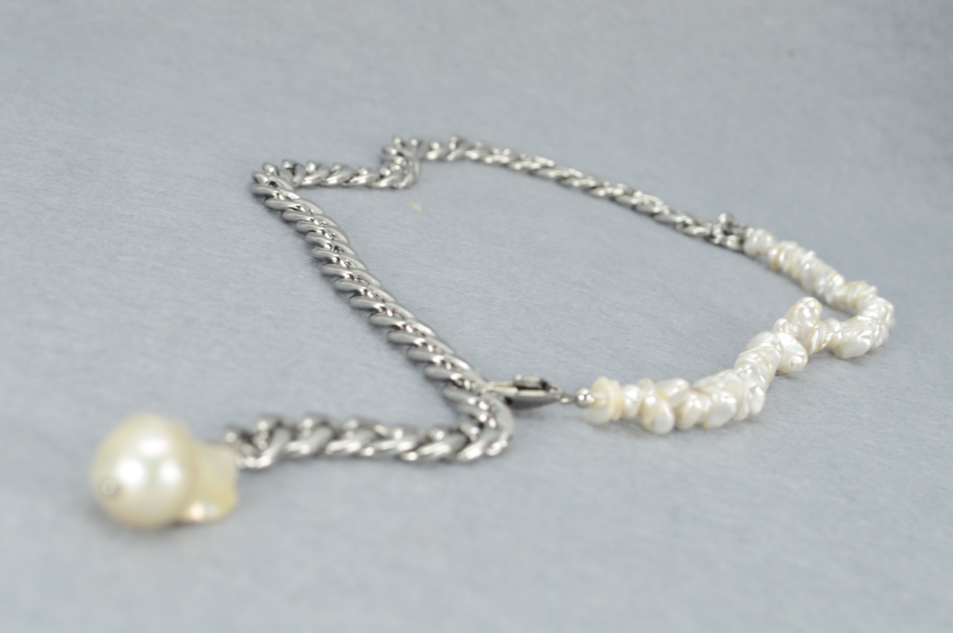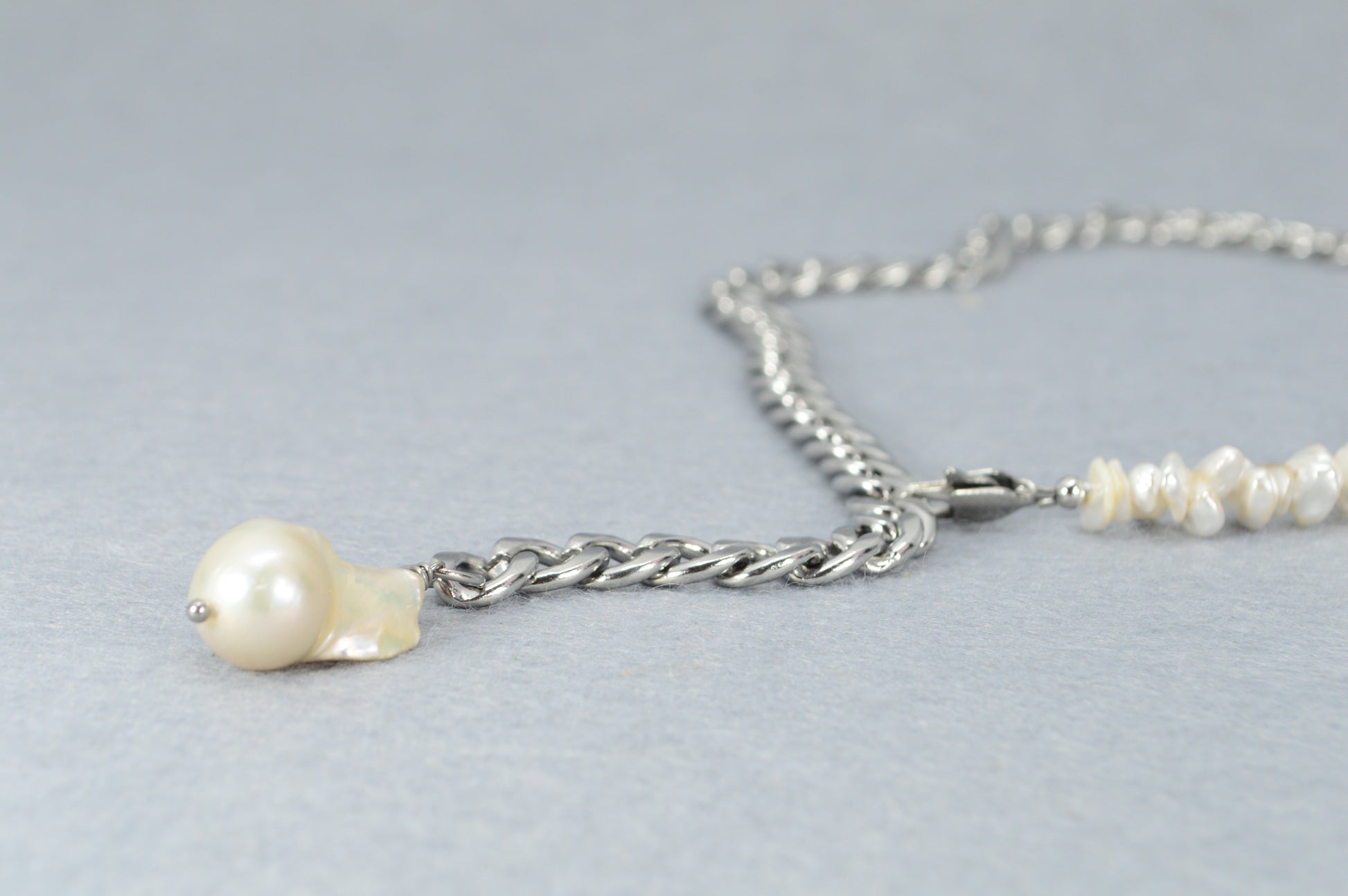 This handcrafted necklace combines a modern stainless steel chain with soft, organic textures of mother-of-pearl beads. The design features a striking asymmetry: smooth chain links on one side and shimmering, irregular-shaped mother-of-pearl pearls on the other. The final touch? A beautiful, one-of-a-kind natural freshwater pearl drop pendant that makes this piece truly special.