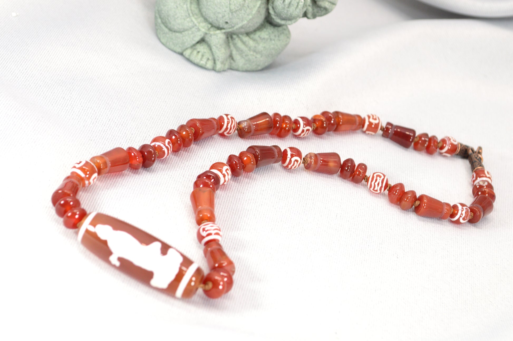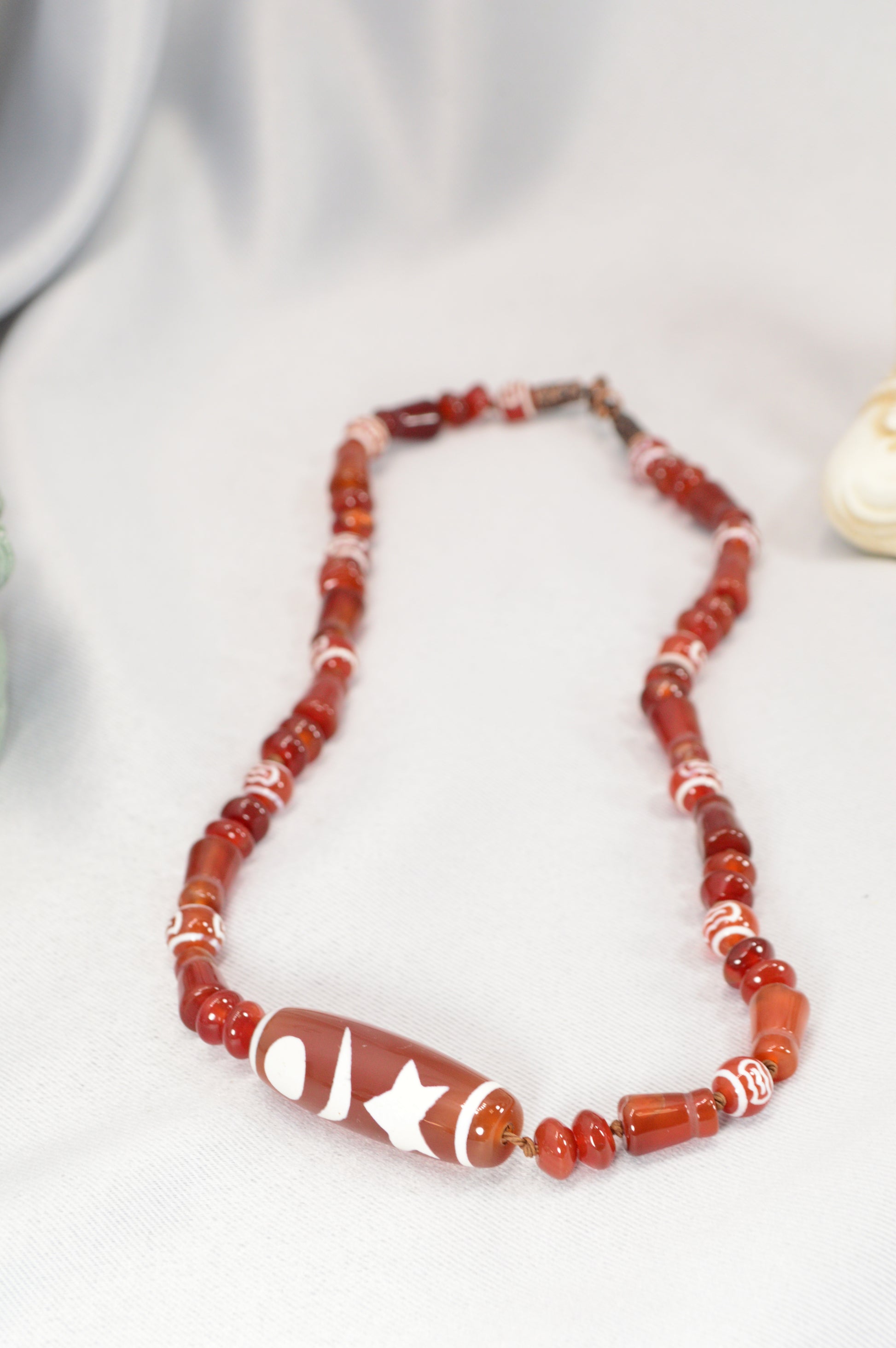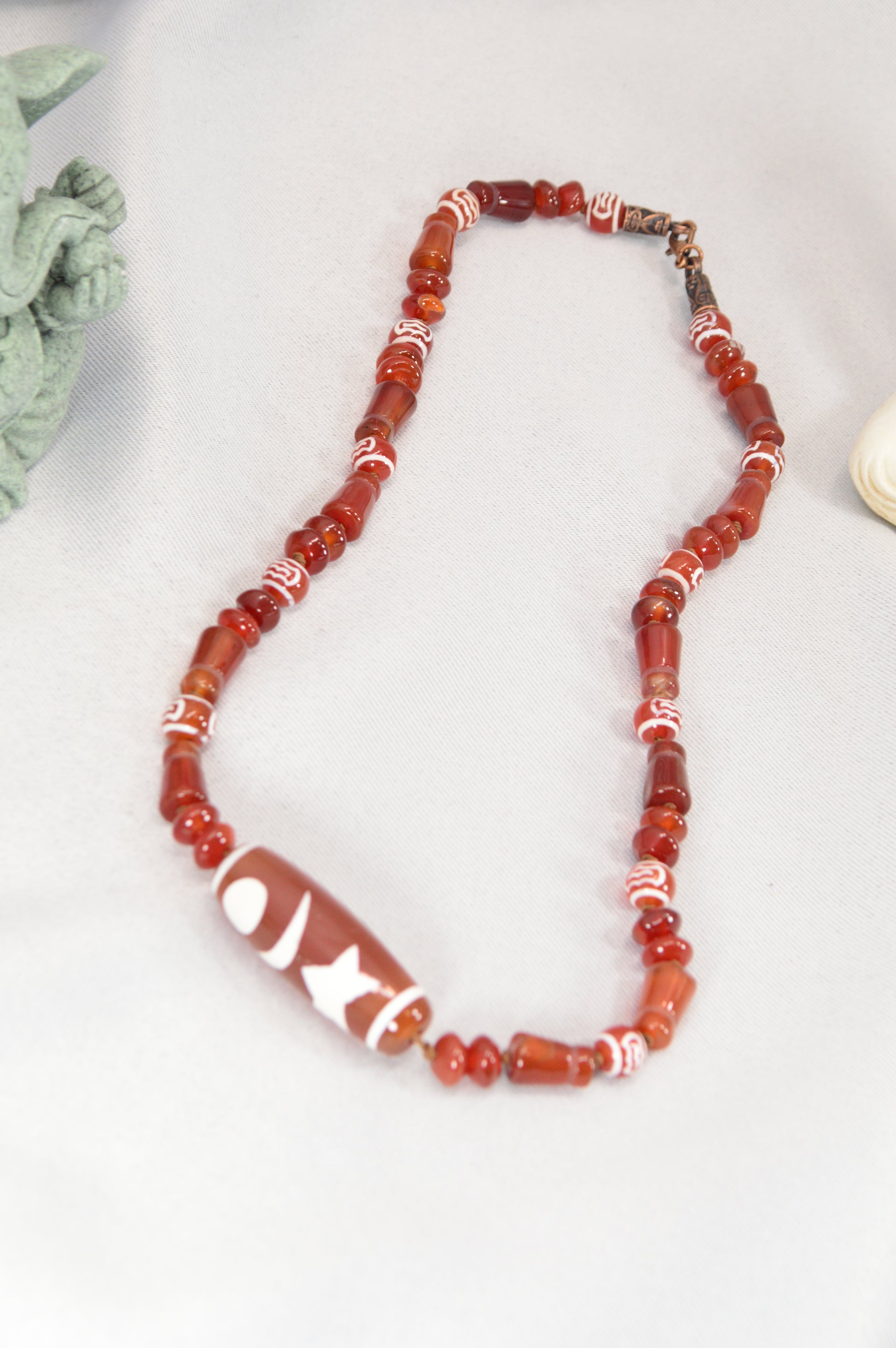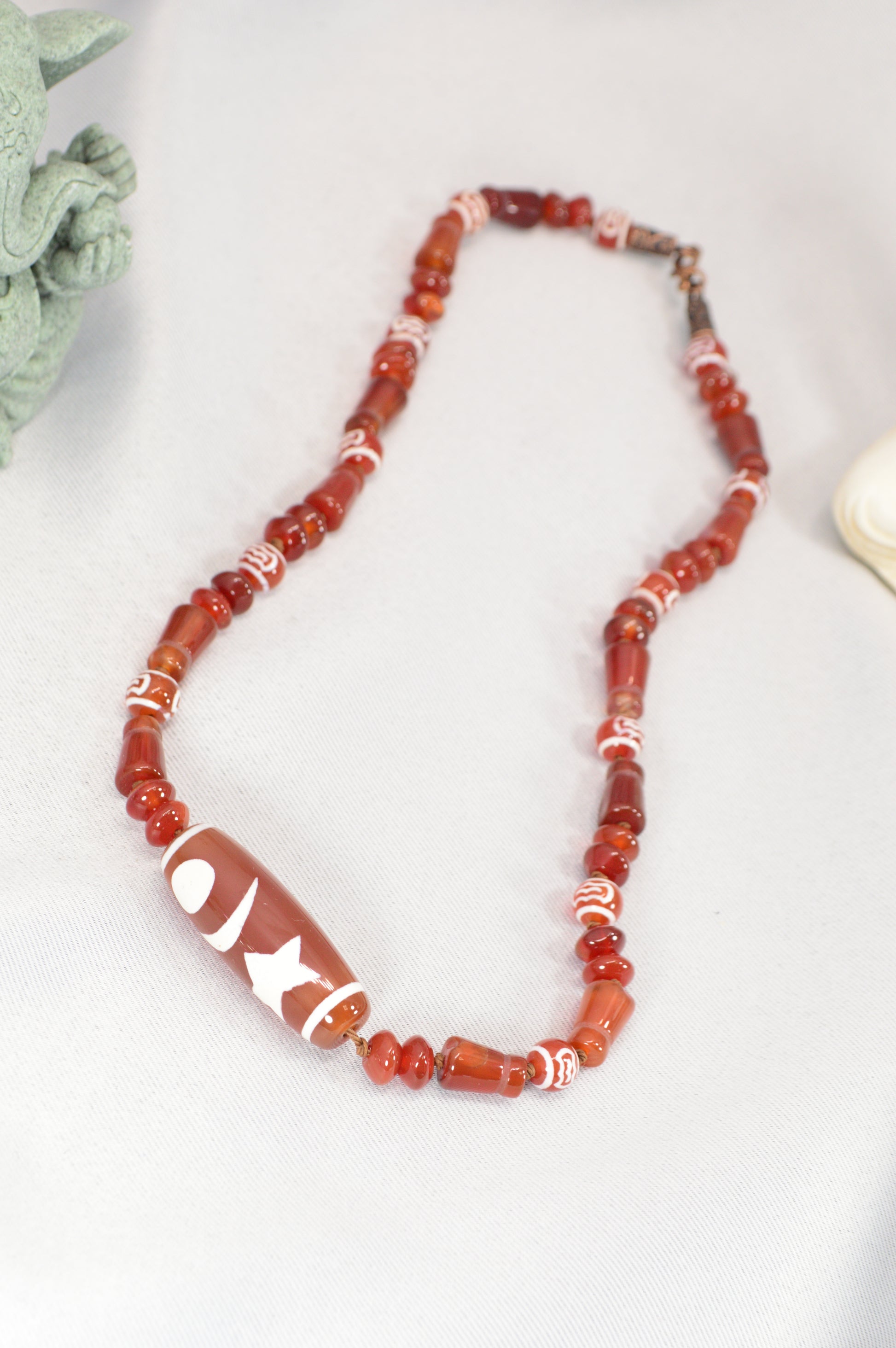 Red Tibetan Dzi Necklace • Star & Moon Amulet • Boho Spiritual Jewelry