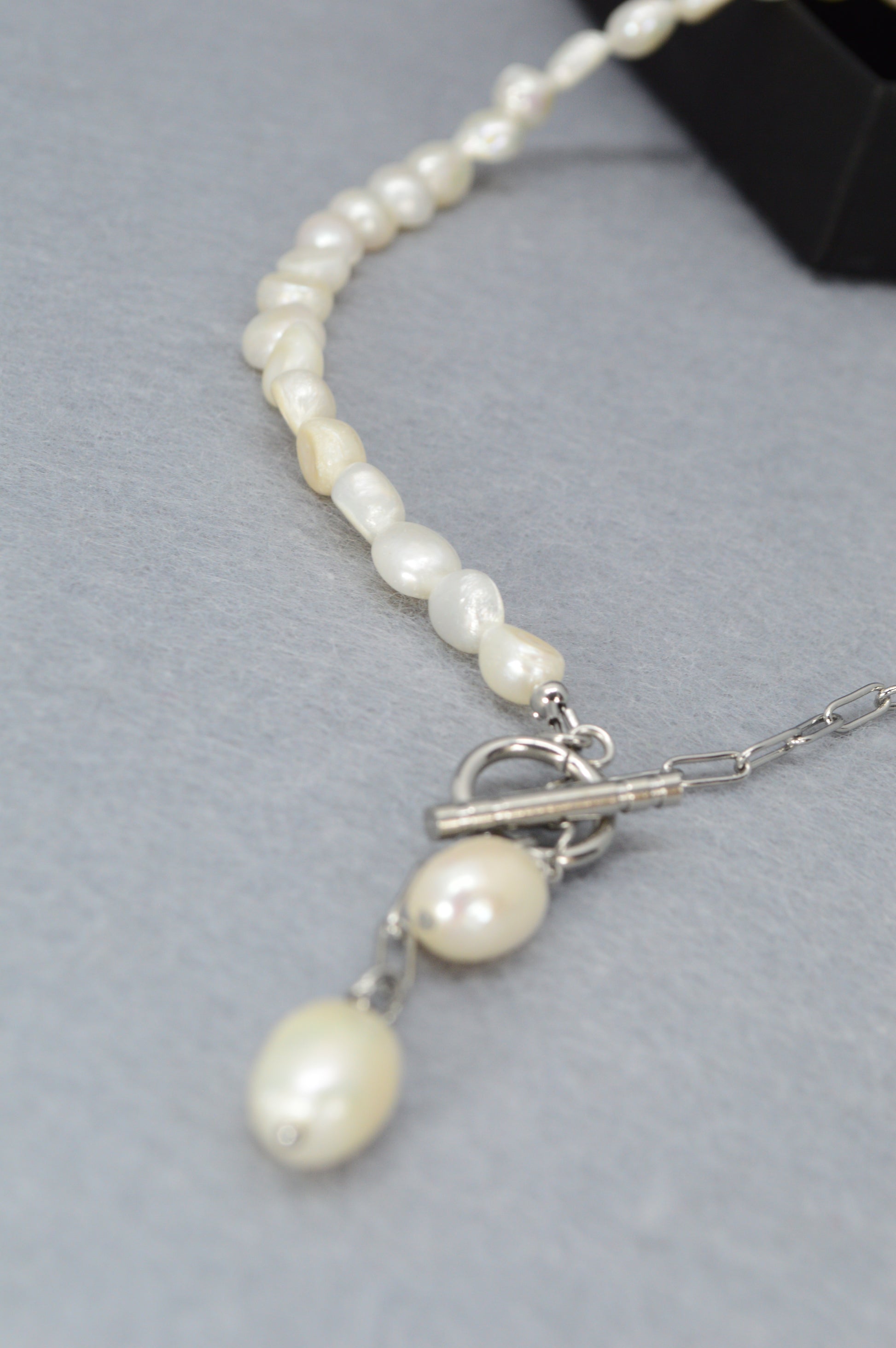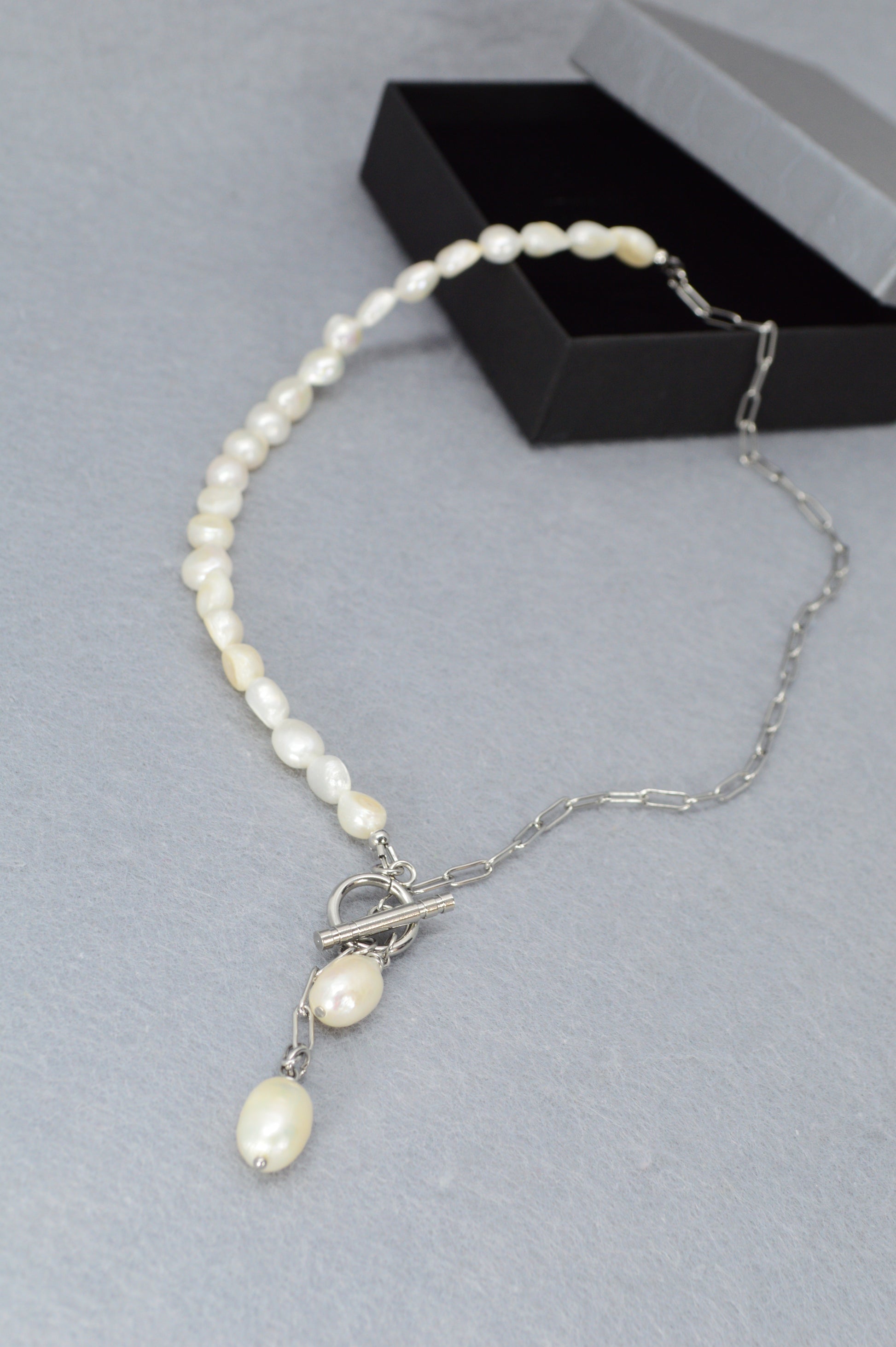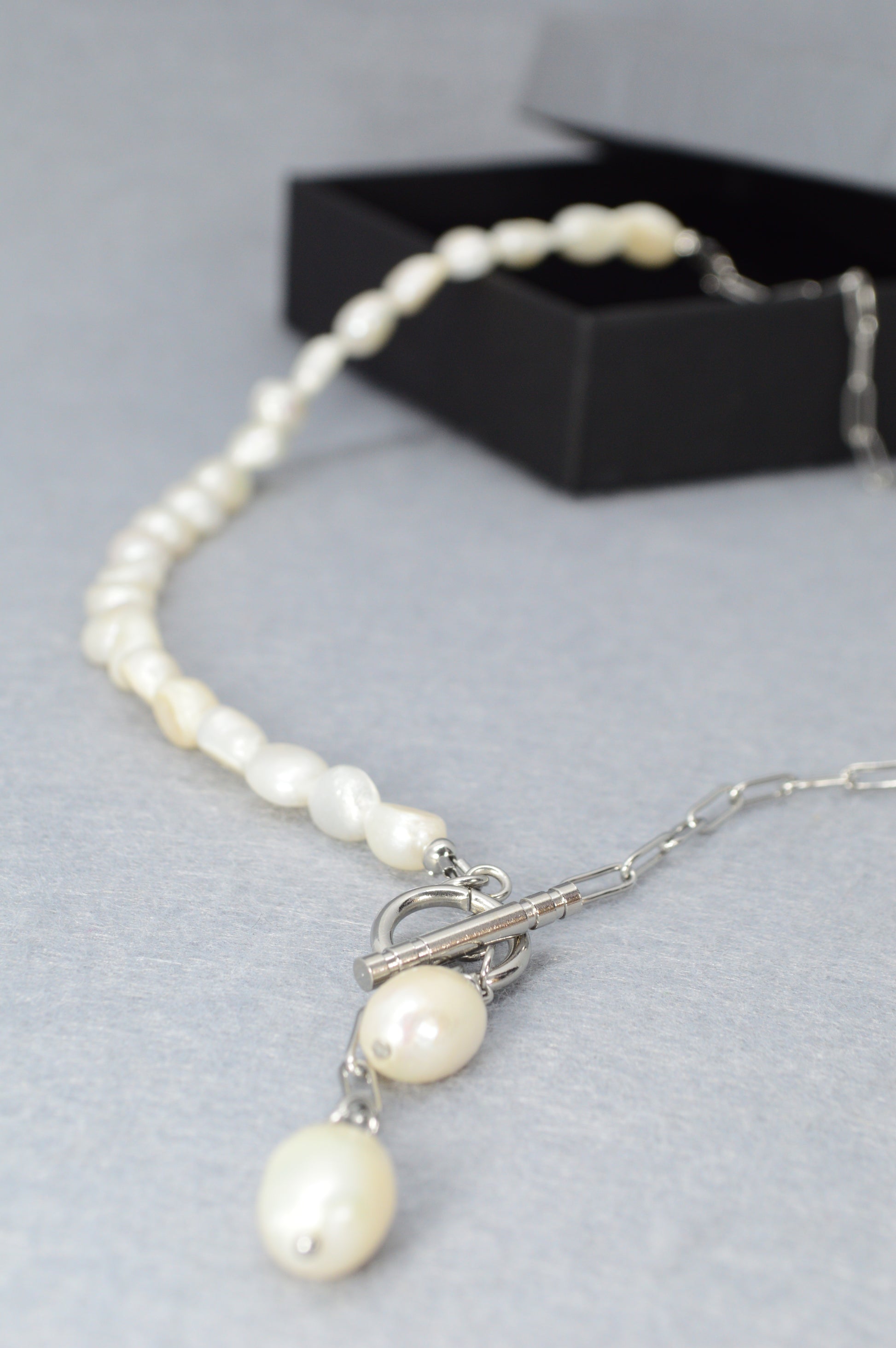 A modern take on timeless elegance – this silver asymmetrical necklace combines the natural beauty of freshwater pearls with the sleek edge of stainless steel chain.
