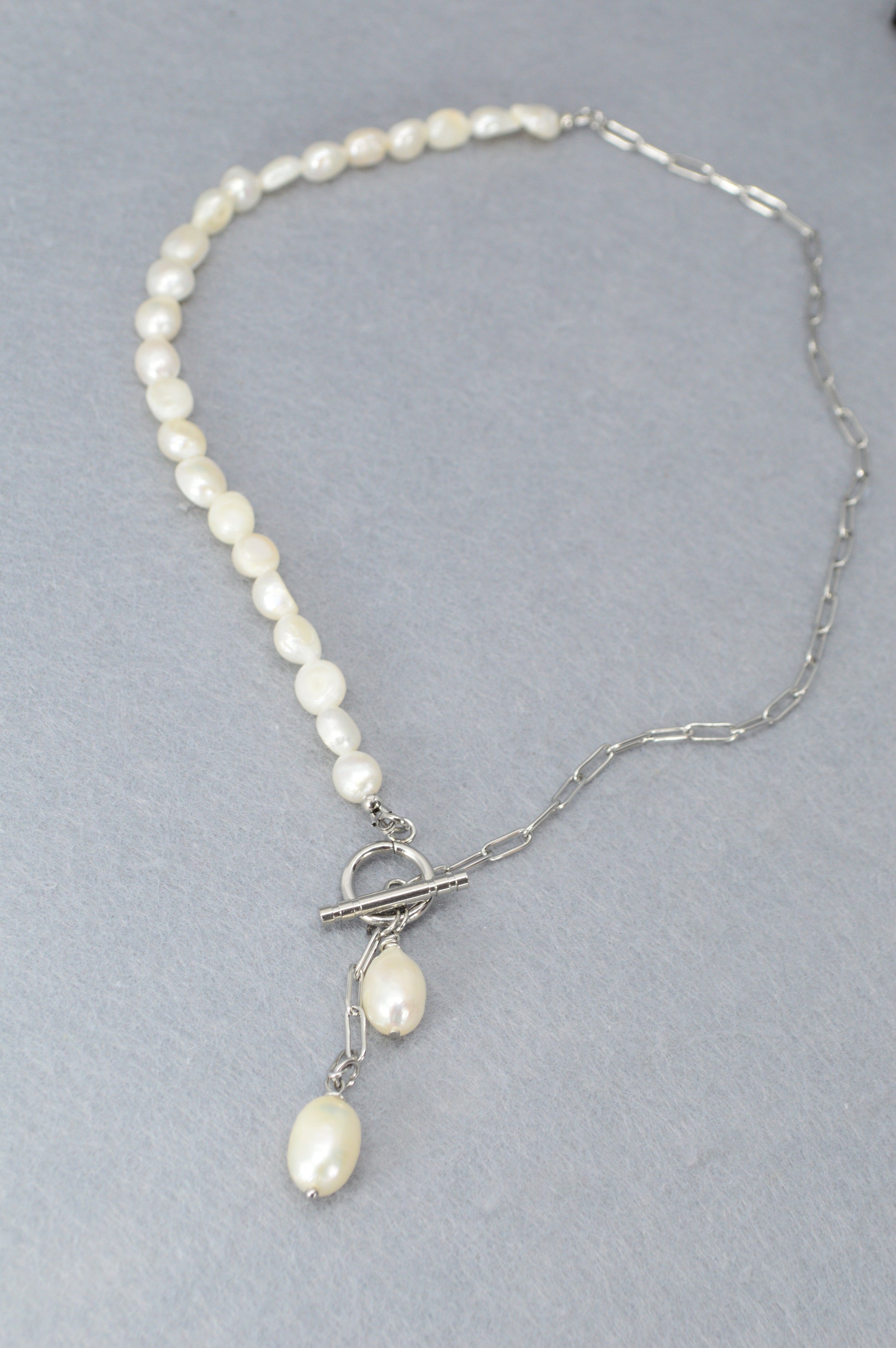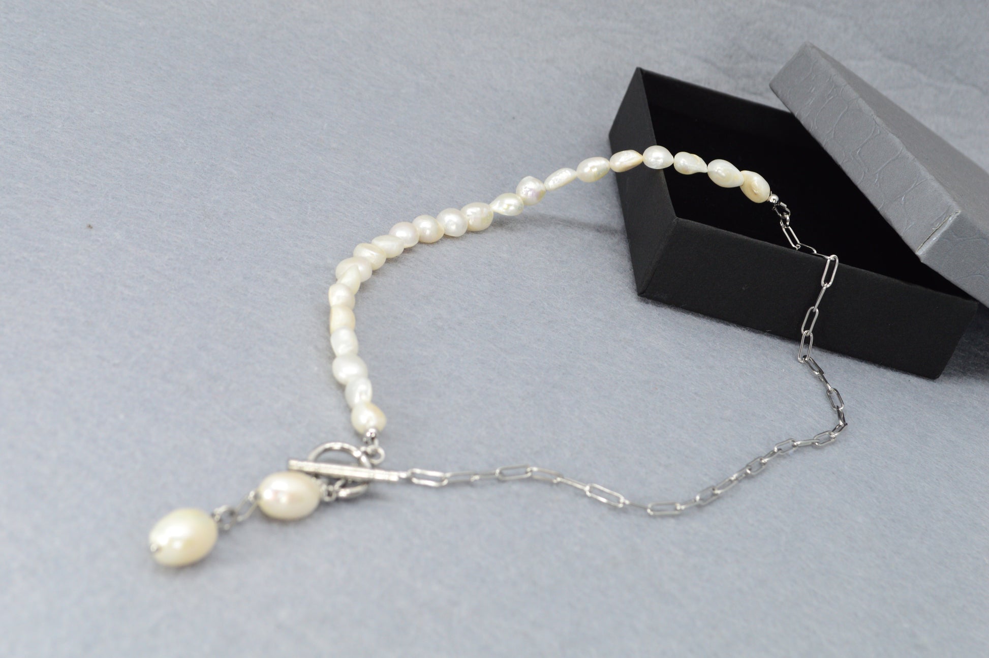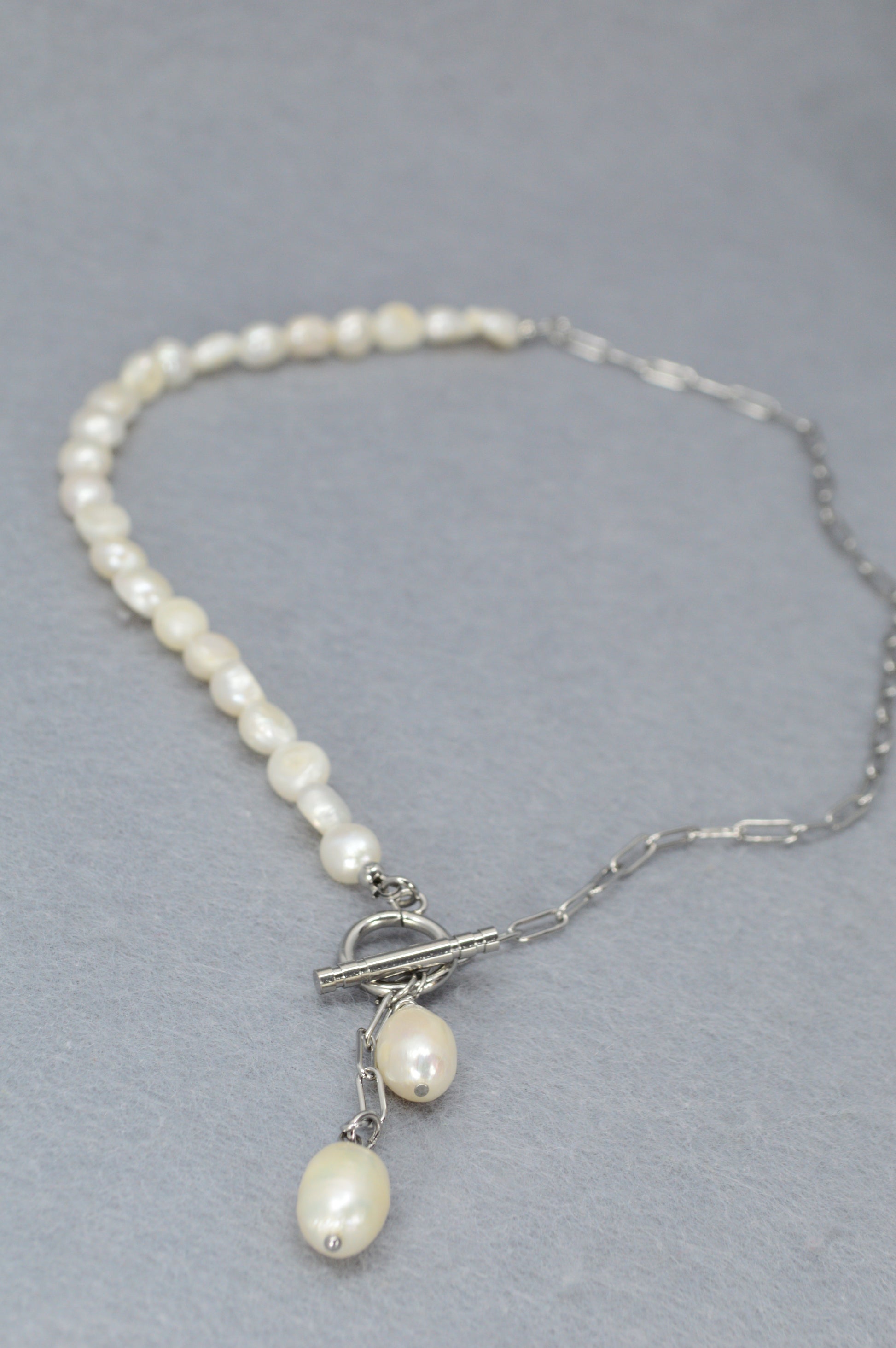 A modern take on timeless elegance – this silver asymmetrical necklace combines the natural beauty of freshwater pearls with the sleek edge of stainless steel chain.