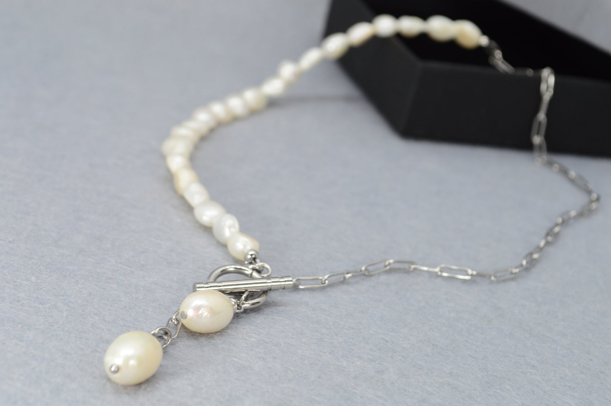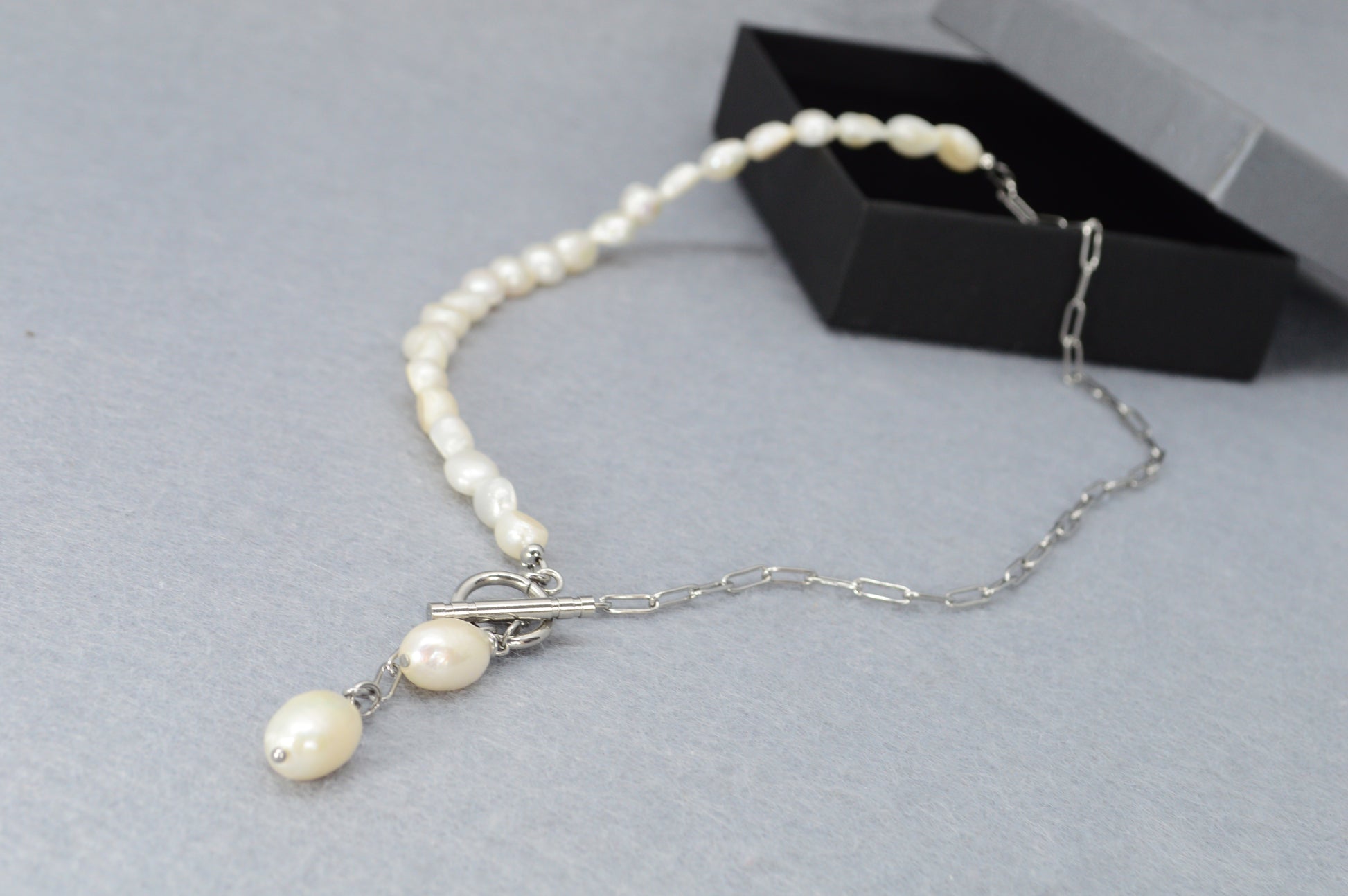 Half of the necklace is strung with luminous white pearls, while the other half features a delicate silver-tone stainless steel chain.