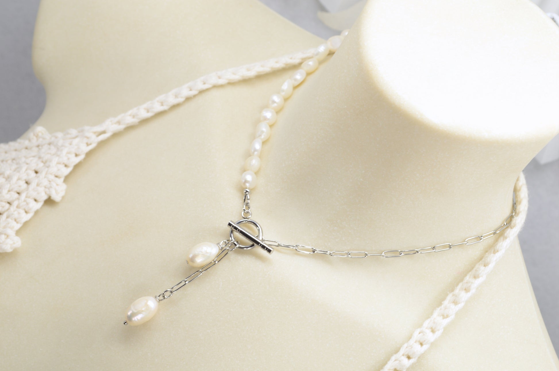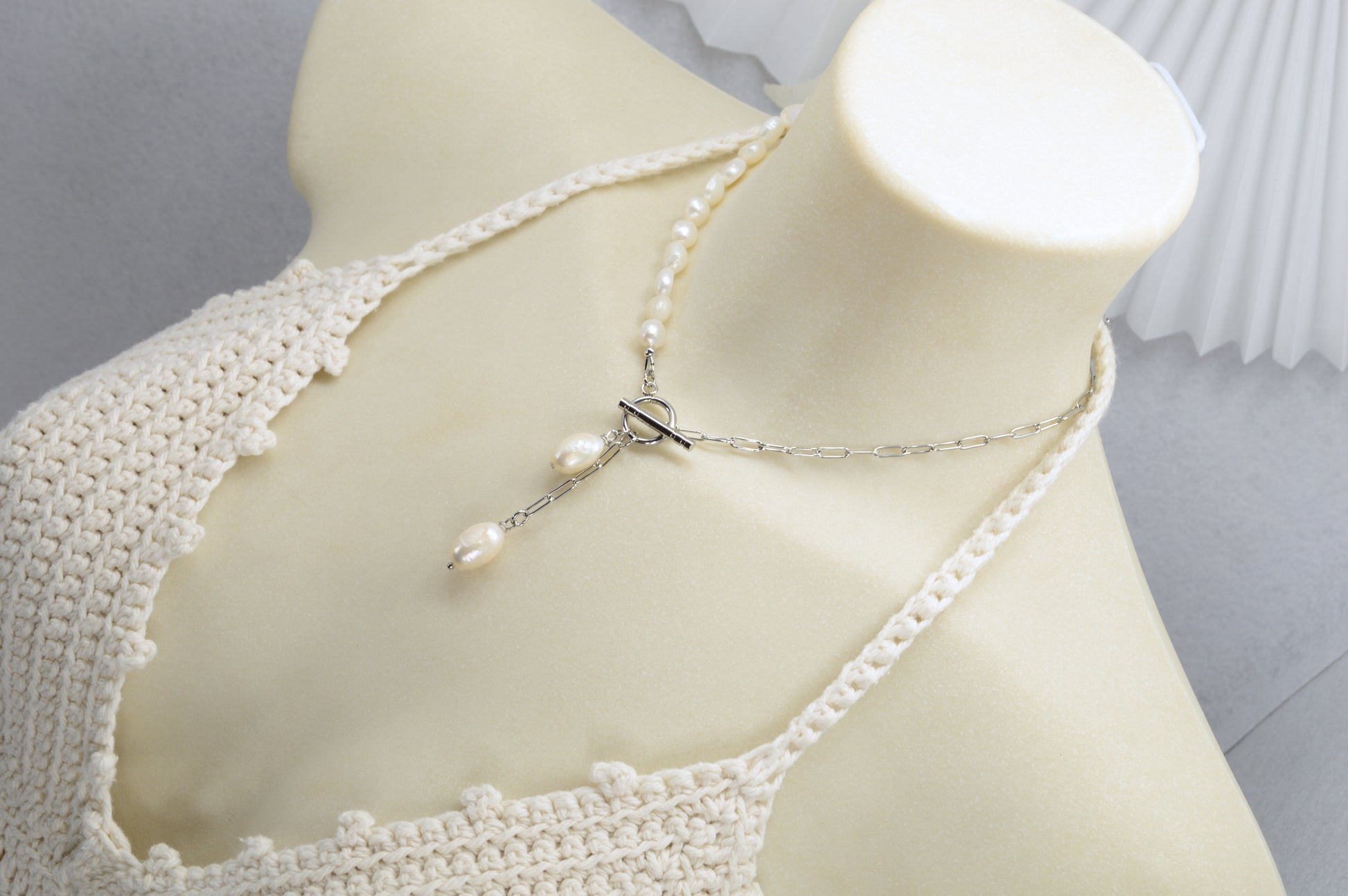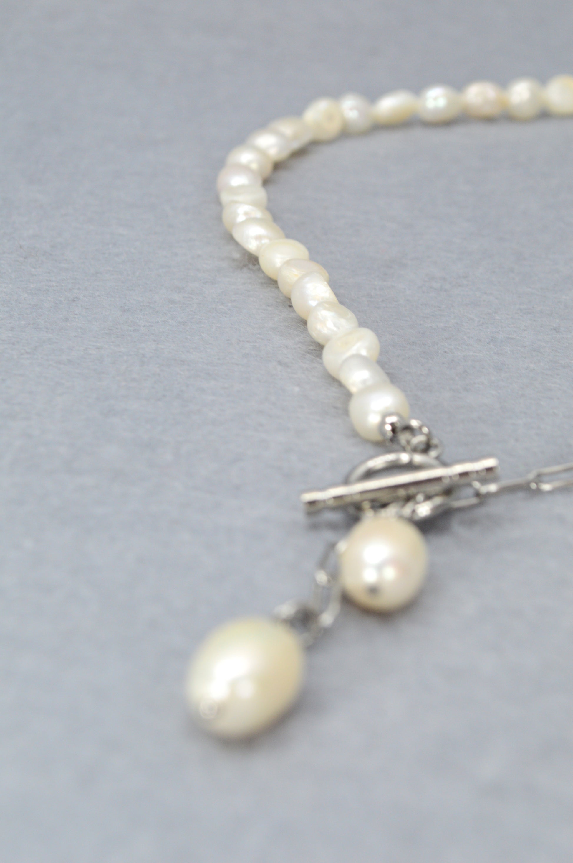 Two larger freshwater pearls hang from the toggle clasp, creating graceful movement and a touch of uniqueness in every piece.