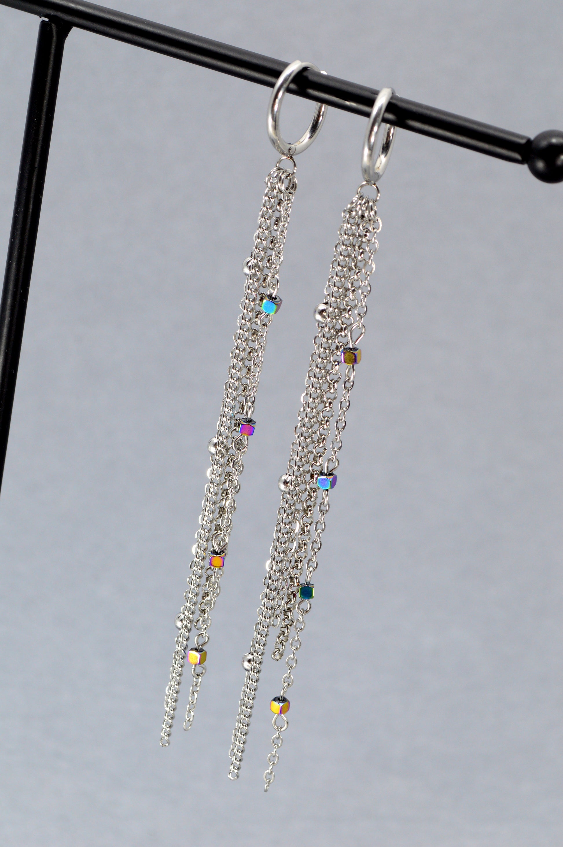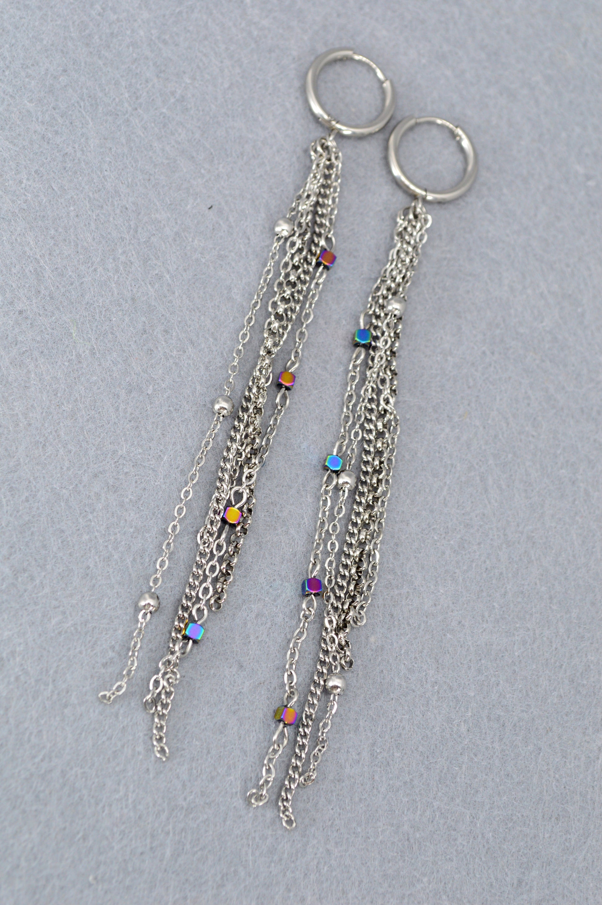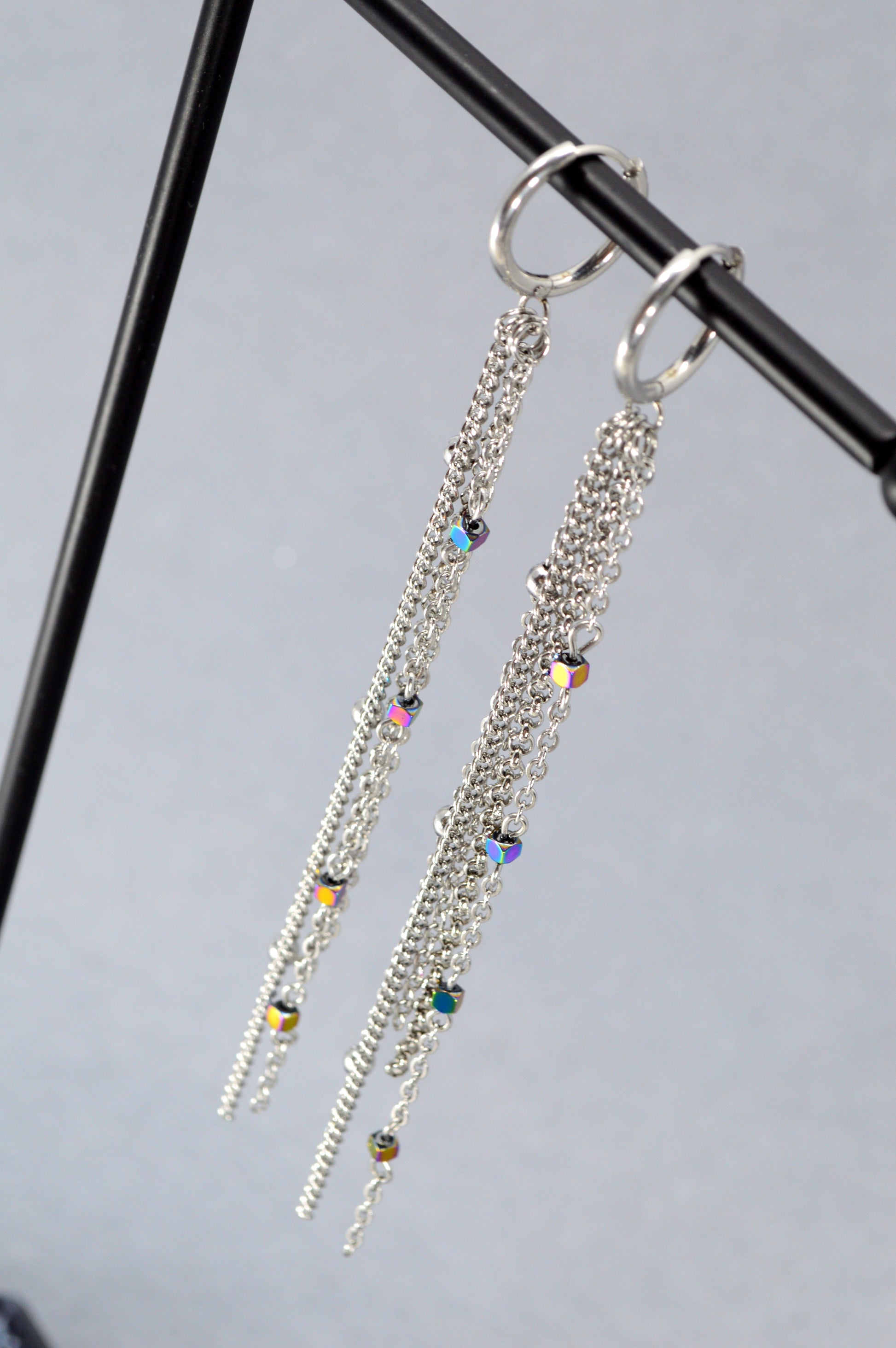 Turn heads, catch the light, and own the night! These long silver chain earrings with rainbow details are bold, edgy, and full of playful energy. Lightweight but striking β they move with you, sparkle with every step, and instantly level up your outfit.