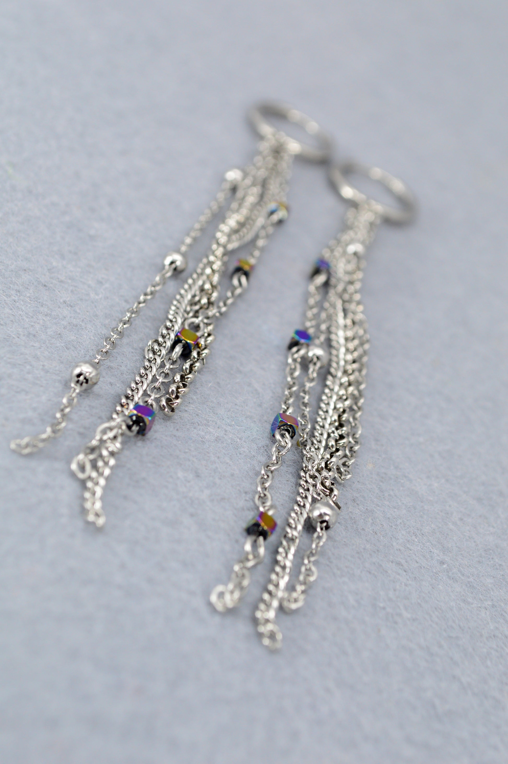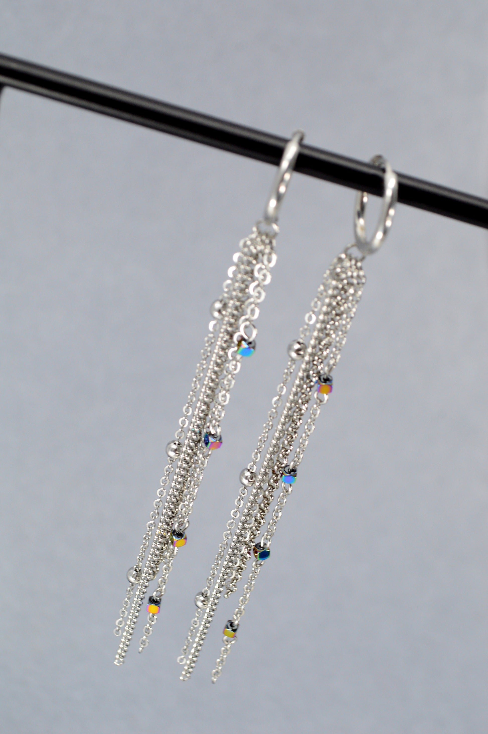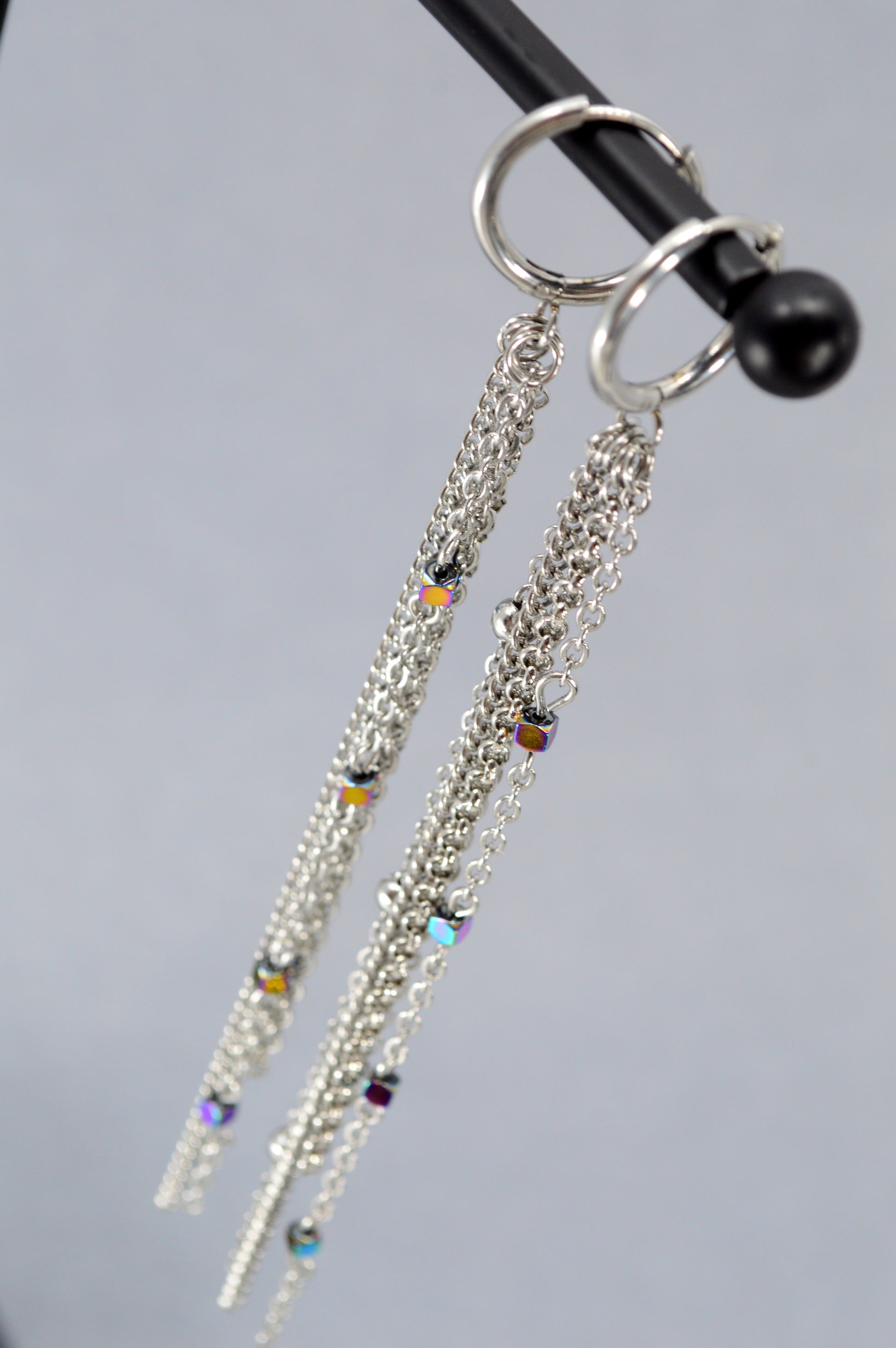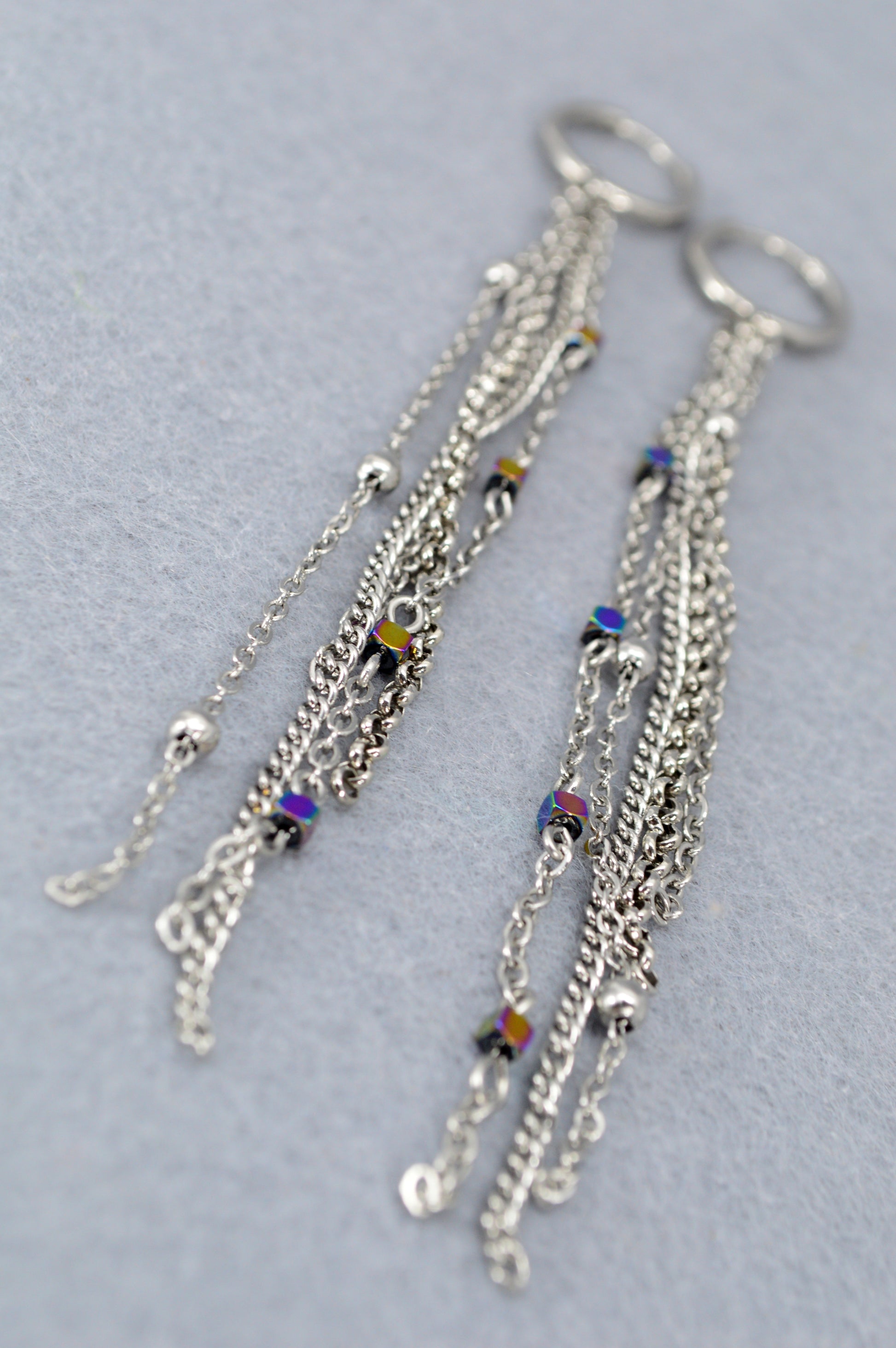 Turn heads, catch the light, and own the night! These long silver chain earrings with rainbow details are bold, edgy, and full of playful energy. Lightweight but striking β they move with you, sparkle with every step, and instantly level up your outfit.