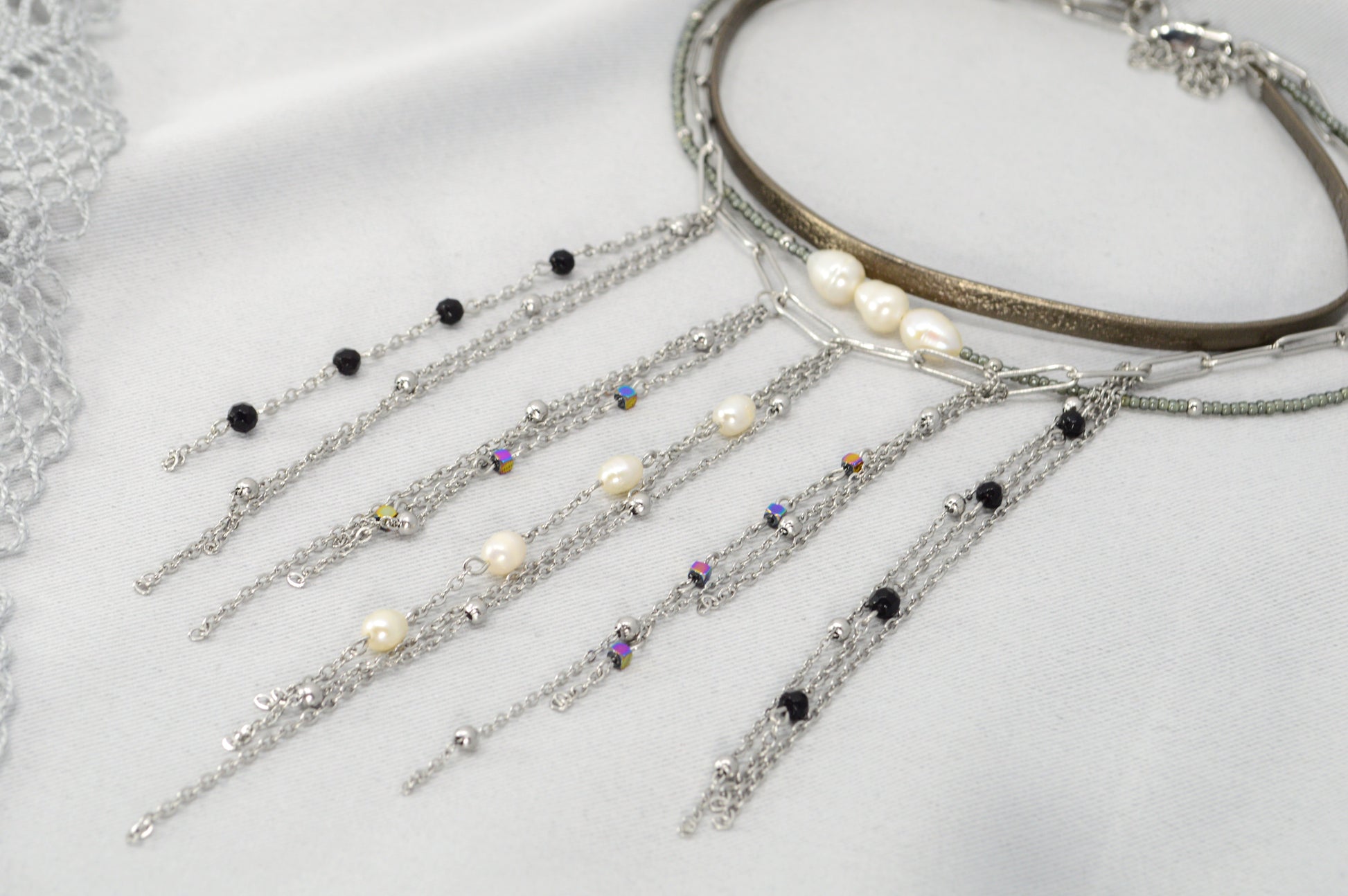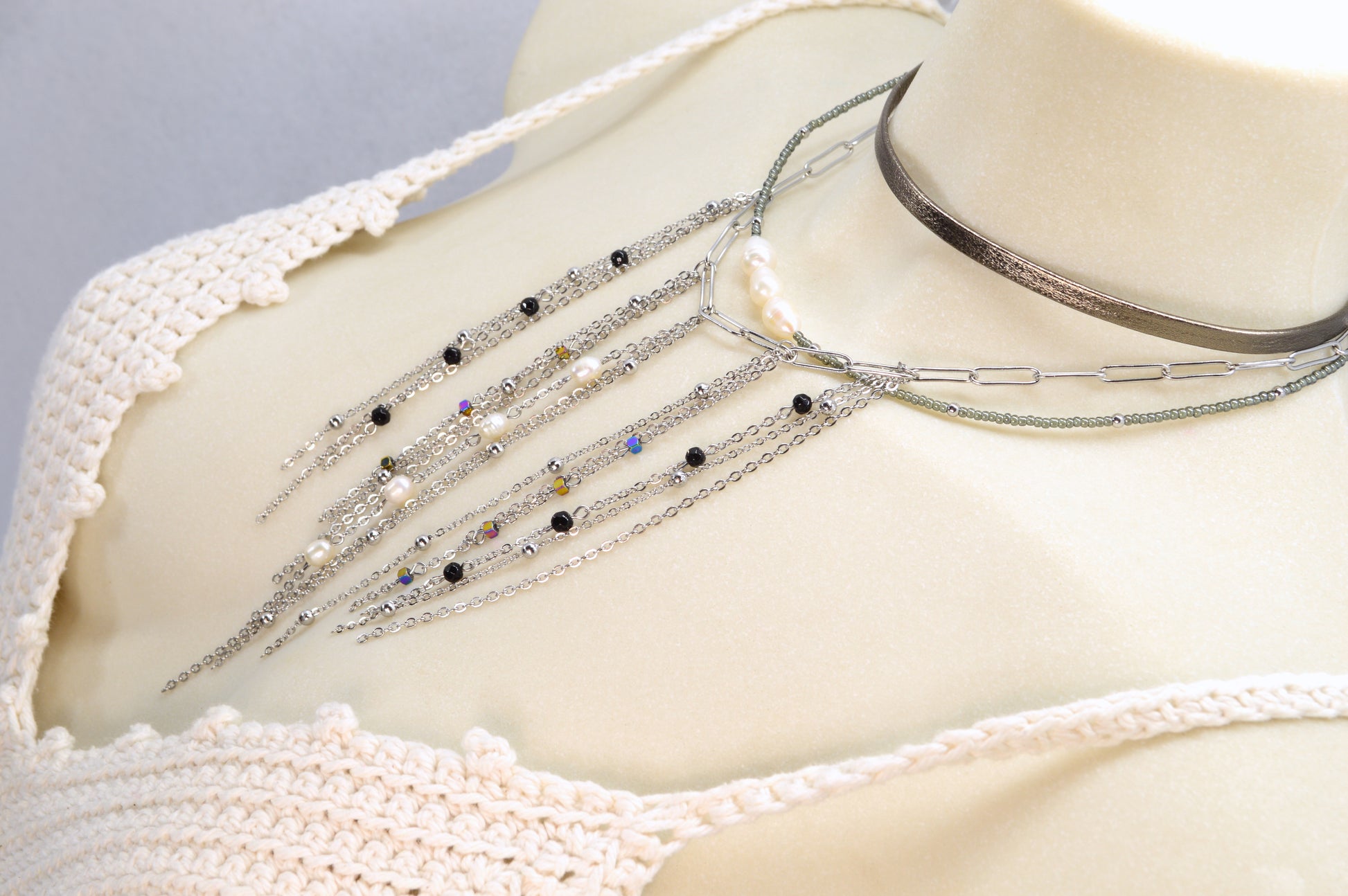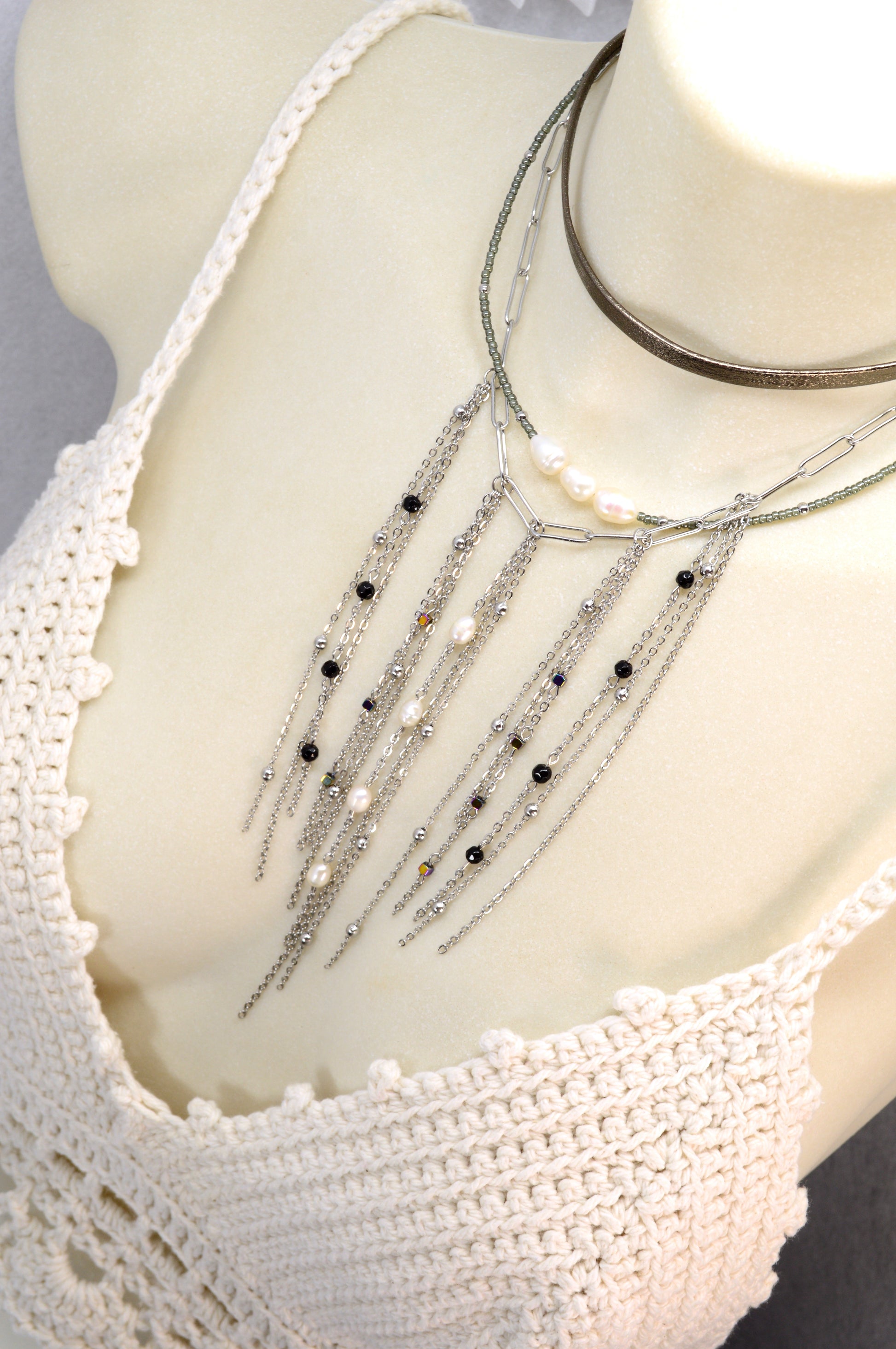 Turn every entrance into a showstopper moment with this dramatic layered fringe necklace. Handcrafted with stainless steel chains, freshwater pearls, black onyx, and iridescent gemstones, it’s a statement piece that screams confidence, edge, and high fashion.