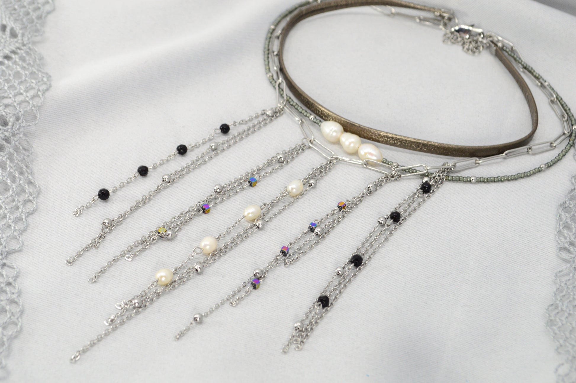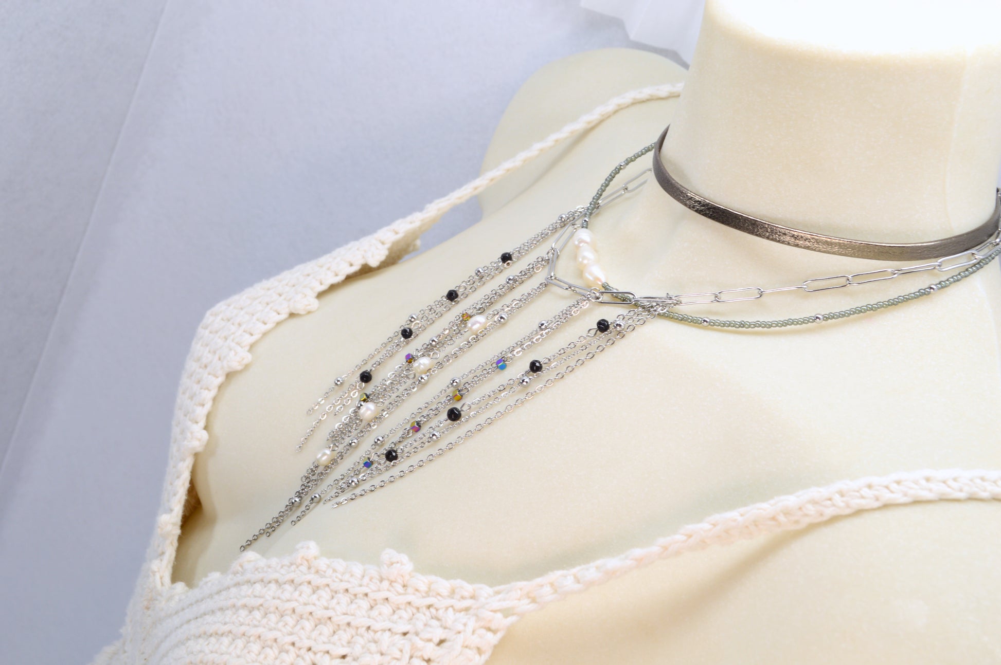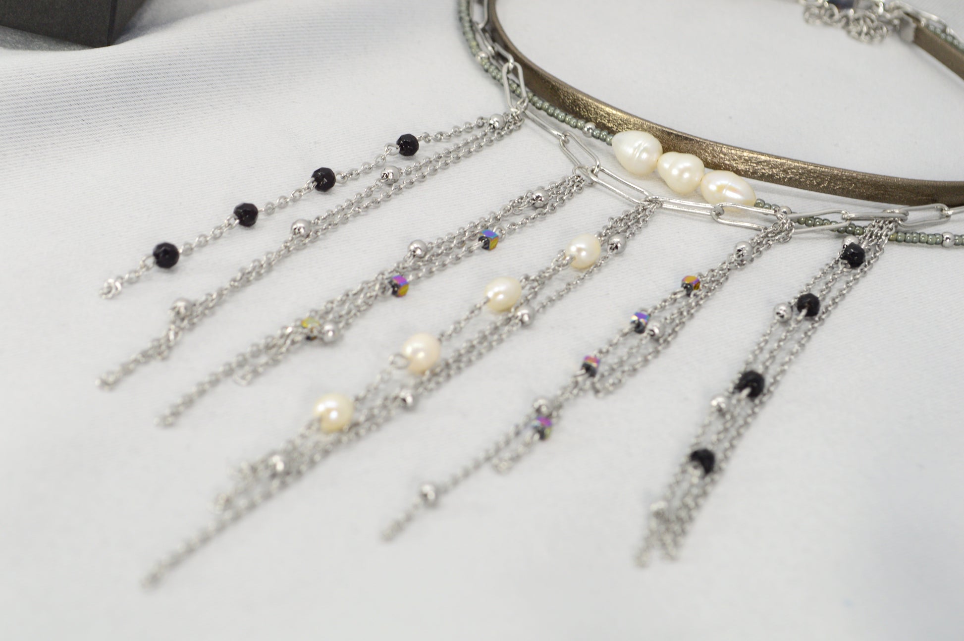 Turn every entrance into a showstopper moment with this dramatic layered fringe necklace. Handcrafted with stainless steel chains, freshwater pearls, black onyx, and iridescent gemstones, it’s a statement piece that screams confidence, edge, and high fashion.