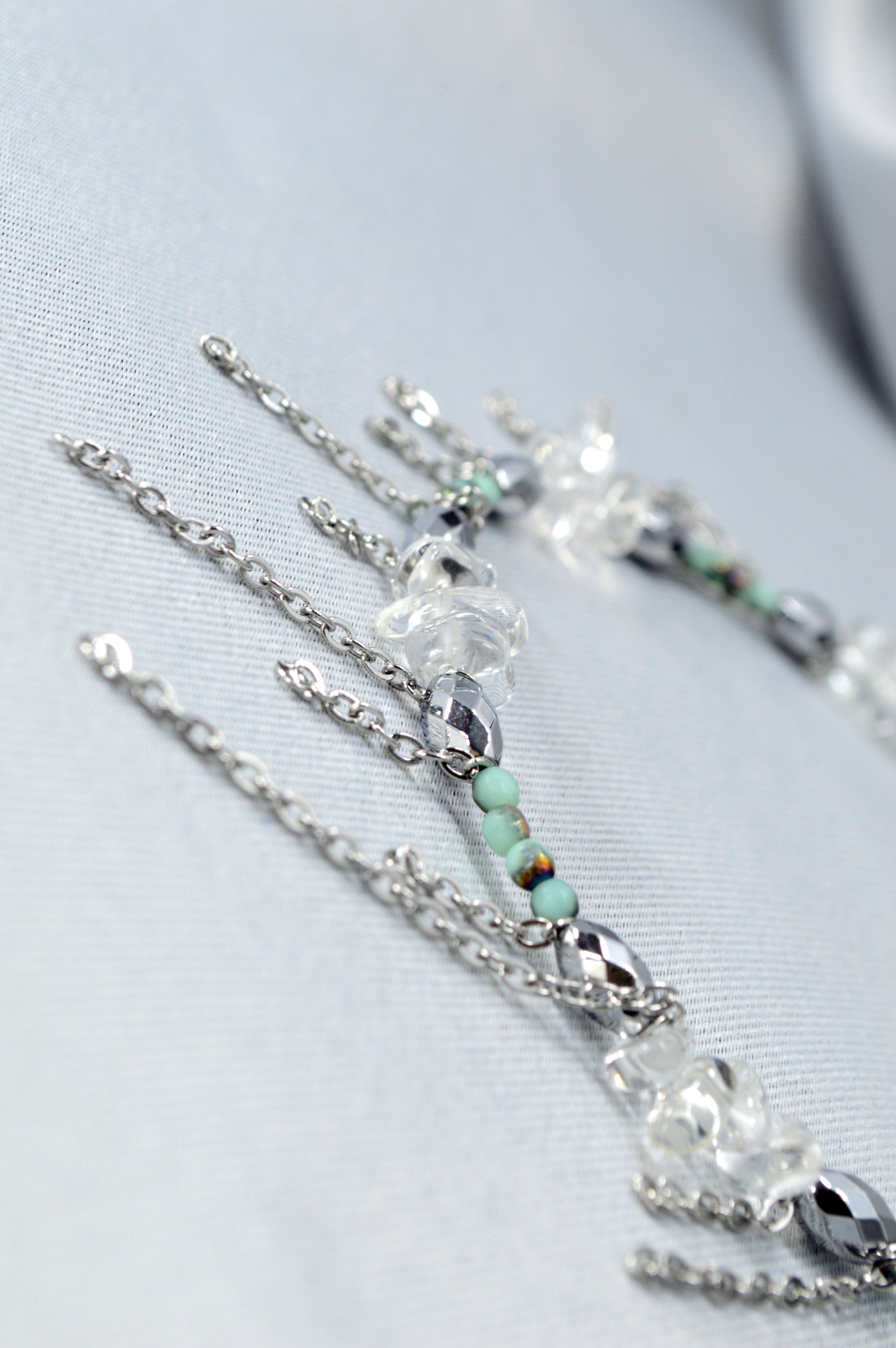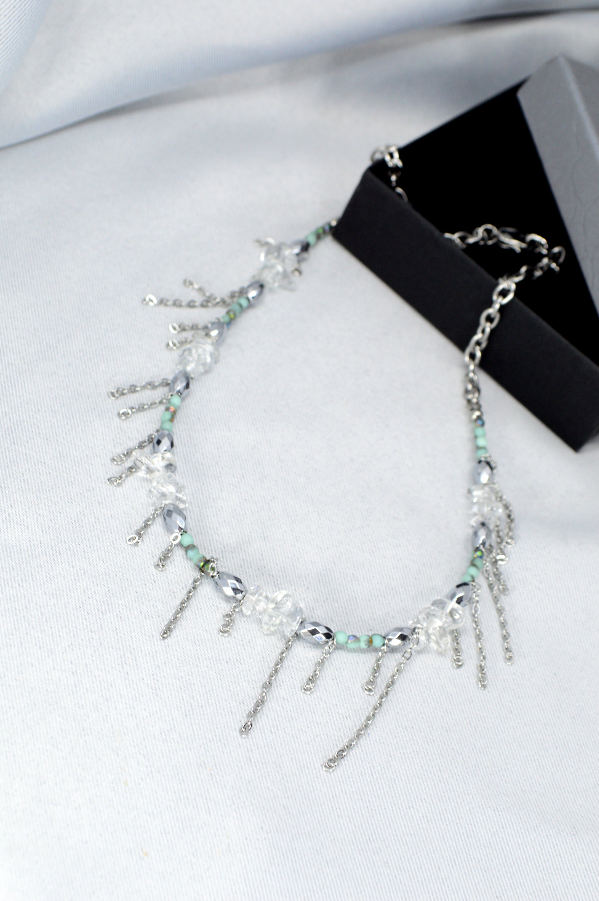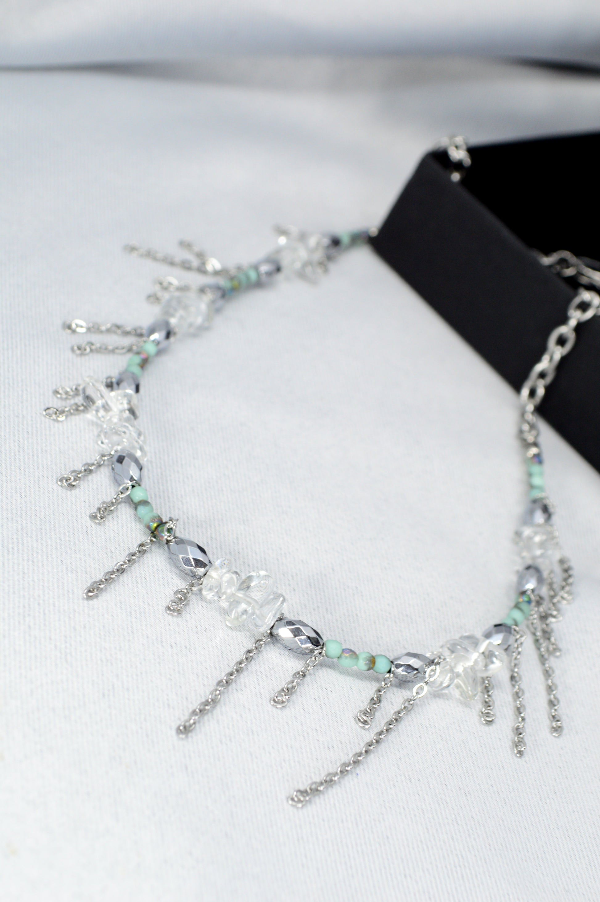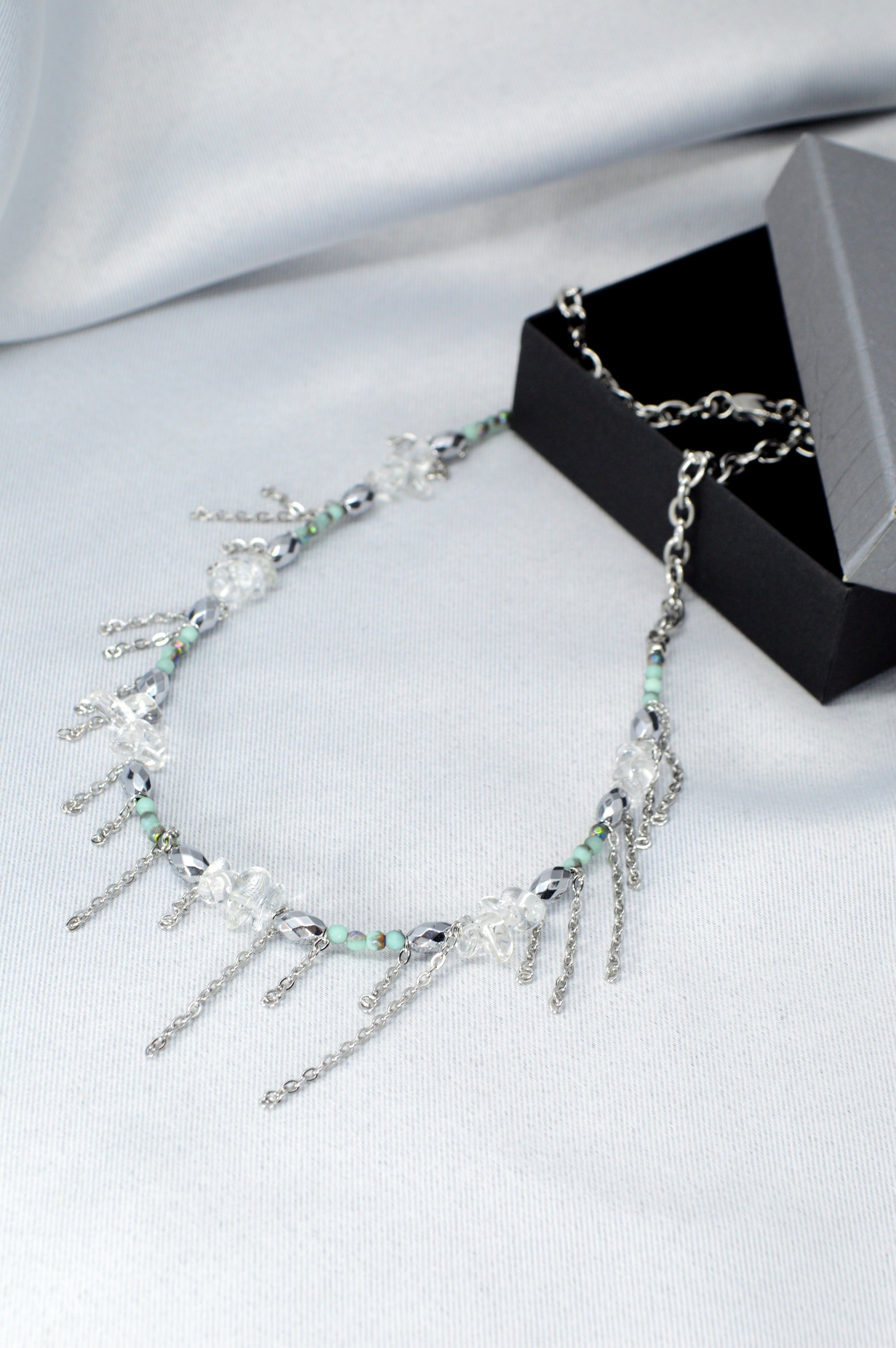 Not your average necklace. This piece is all about mixing natural stones, shimmering glass beads, and stainless steel chains to create a bold, stylish look that feels fresh, modern, and a little rebellious.