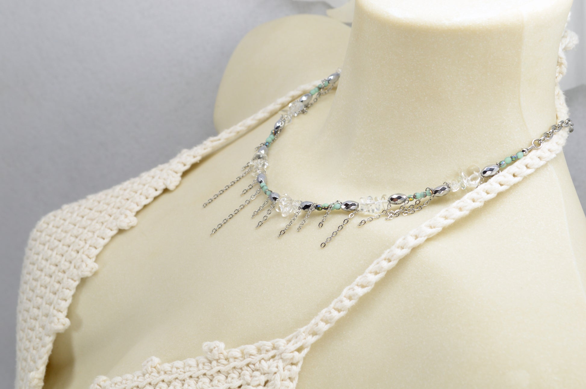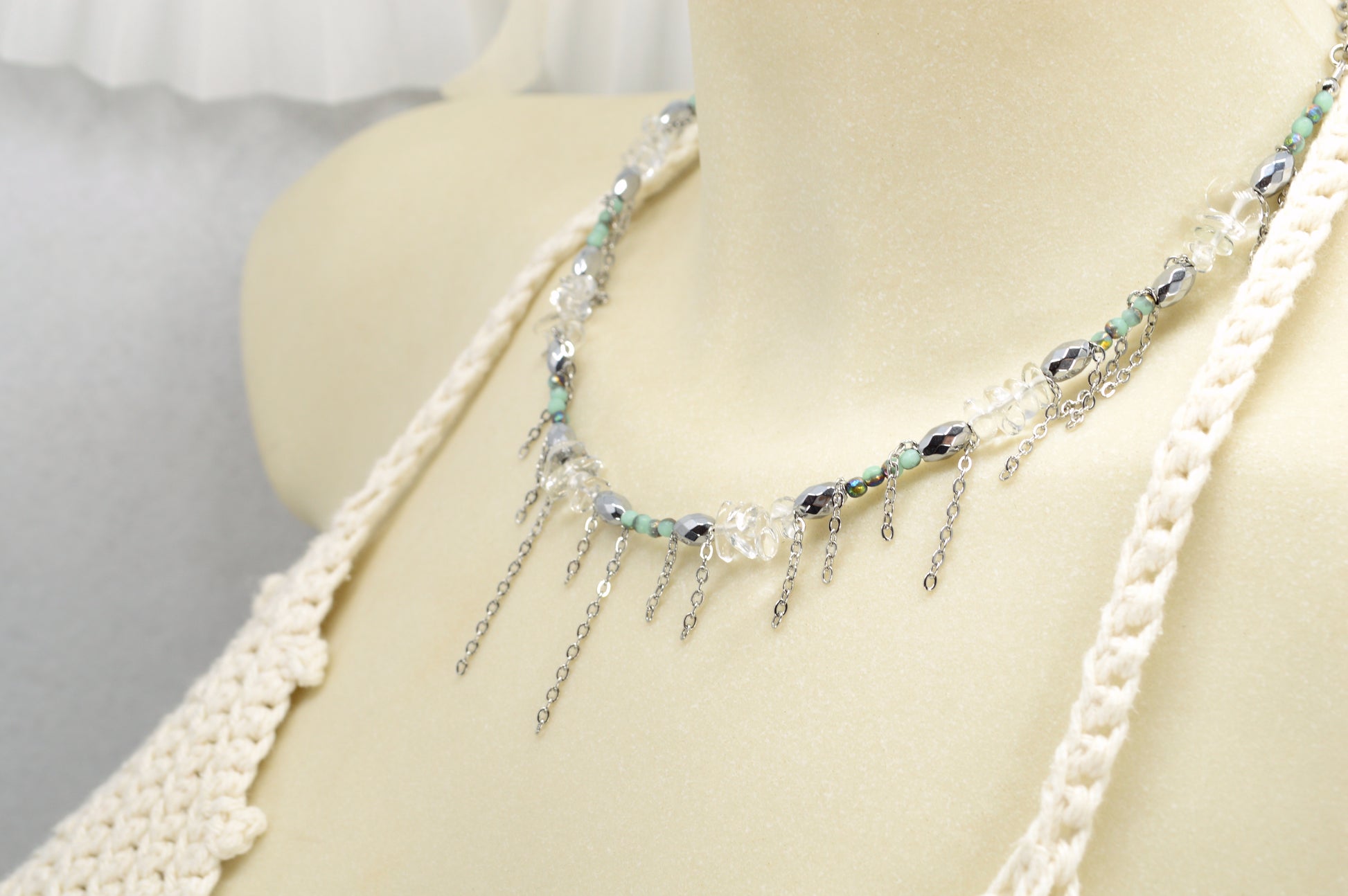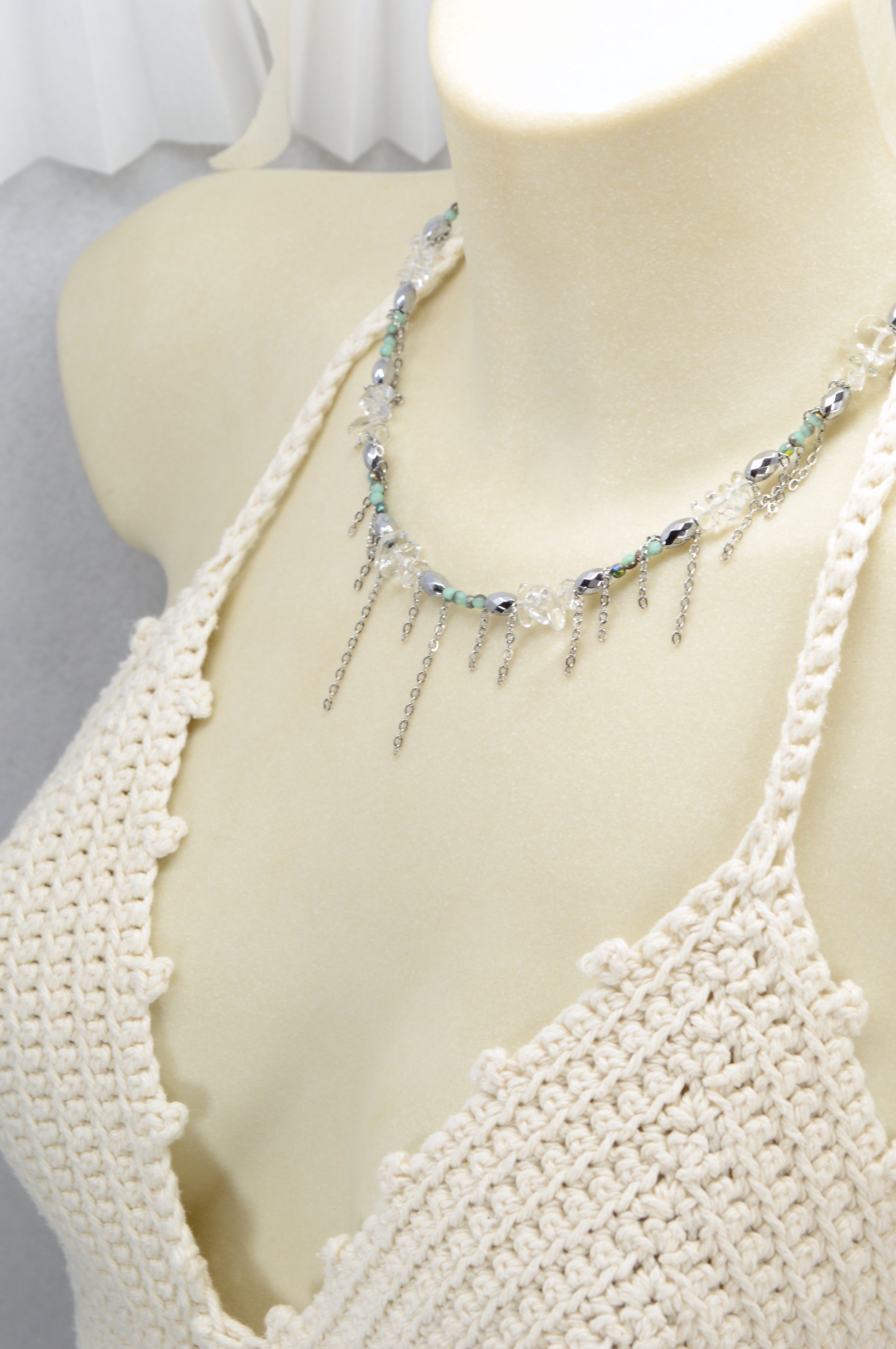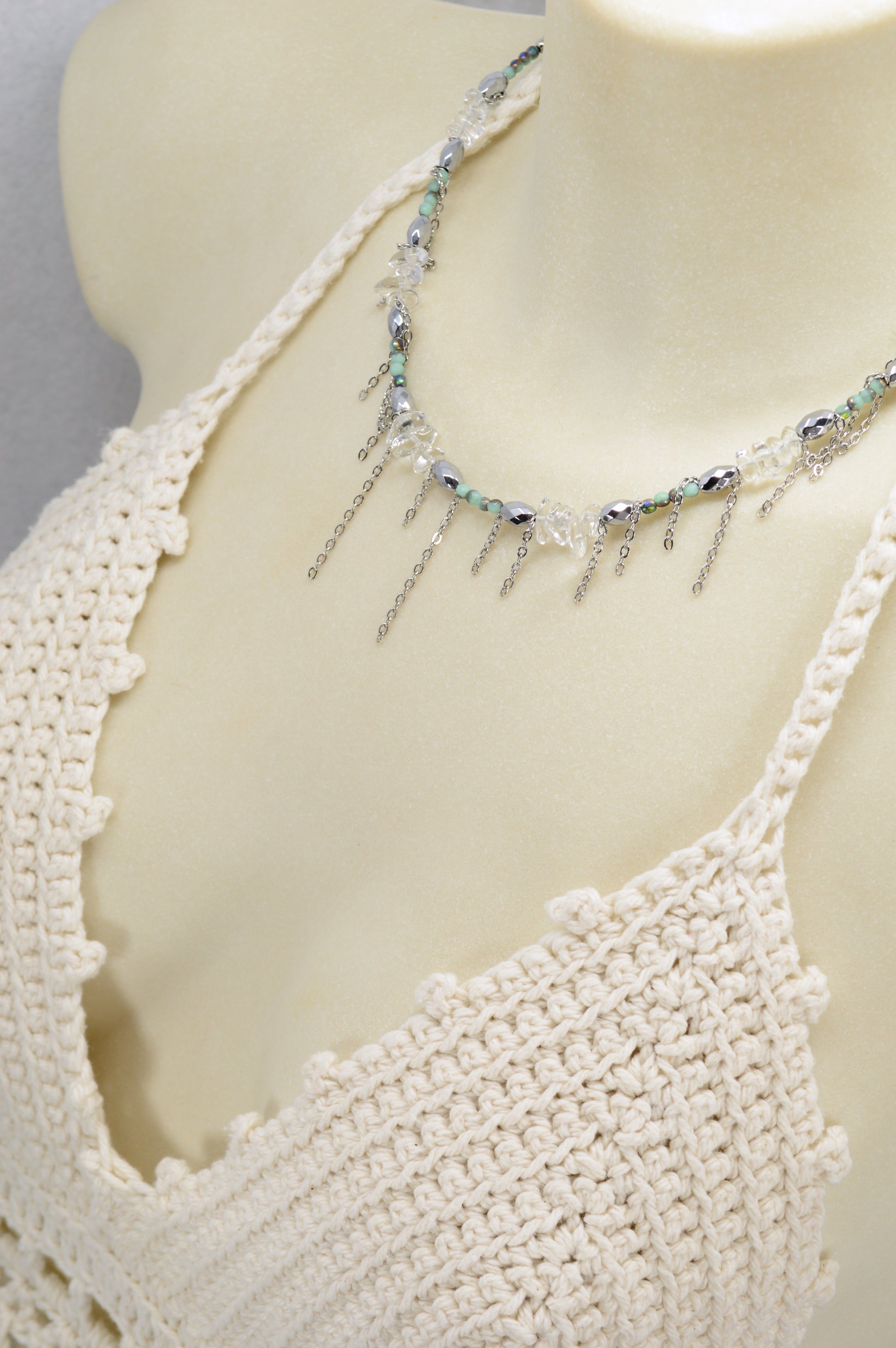 Not your average necklace. This piece is all about mixing natural stones, shimmering glass beads, and stainless steel chains to create a bold, stylish look that feels fresh, modern, and a little rebellious.