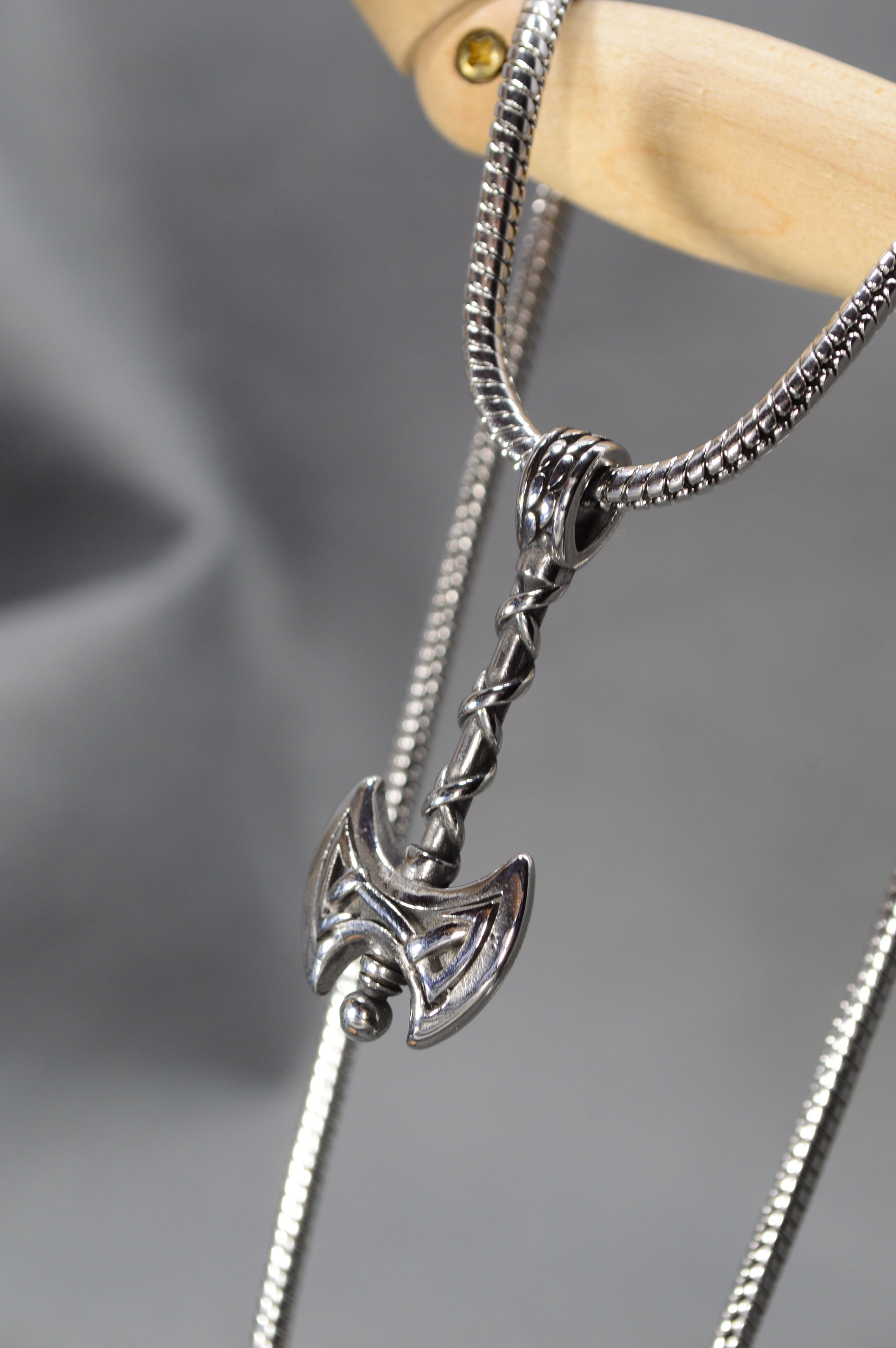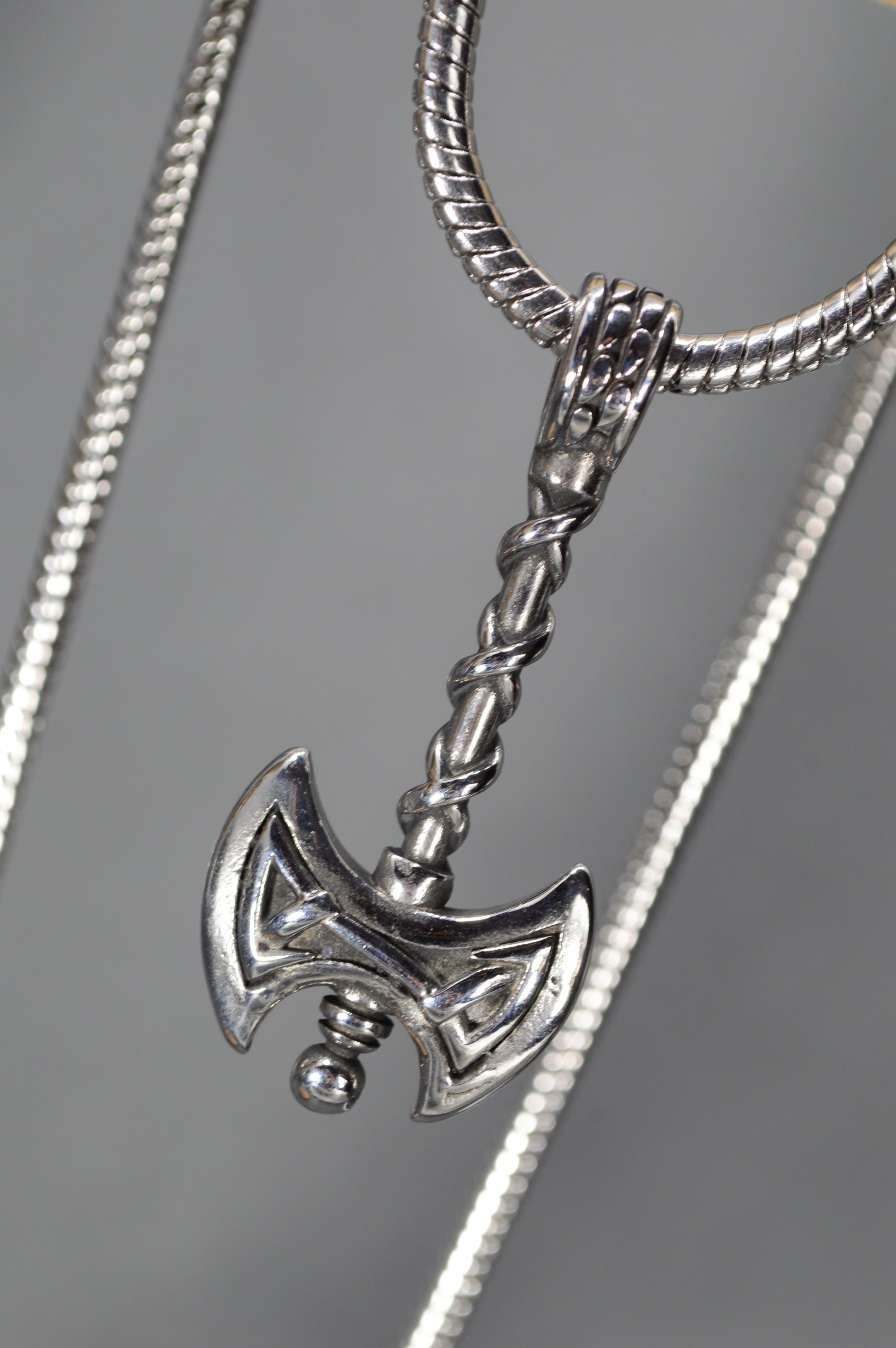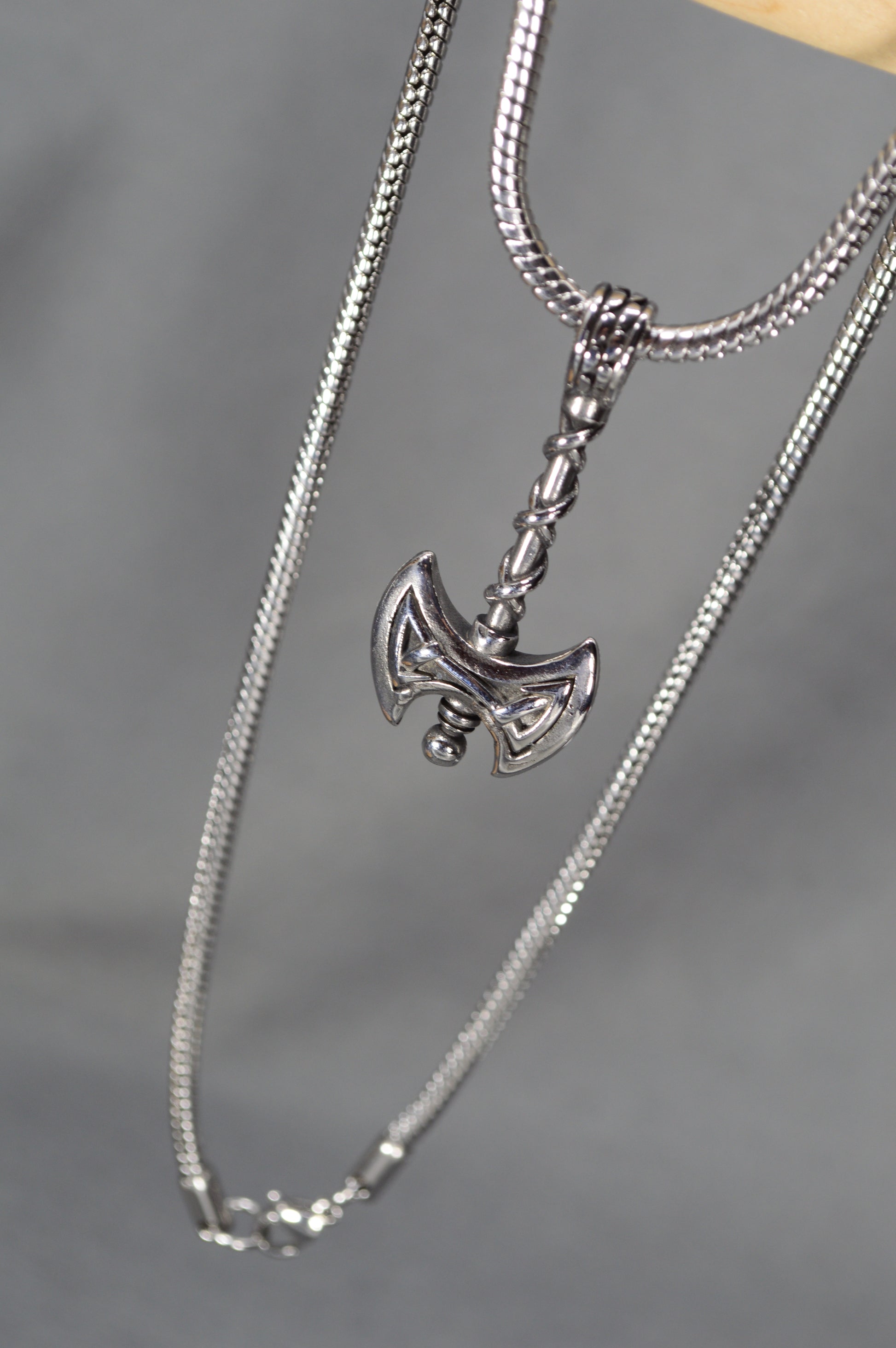 Striking Viking-inspired necklace featuring a detailed double-bladed axe pendant. Made from durable stainless steel with an antique-style finish that highlights every carved line and knotwork accent. The twisted handle and bold blade design evoke classic Norse weaponry, making this piece perfect for lovers of mythology, Viking culture, and powerful symbolic jewelry. The pendant hangs on a sturdy stainless steel chain suitable for everyday wear. A great gift for him, for history fans, or anyone drawn to rugged warrior aesthetics.