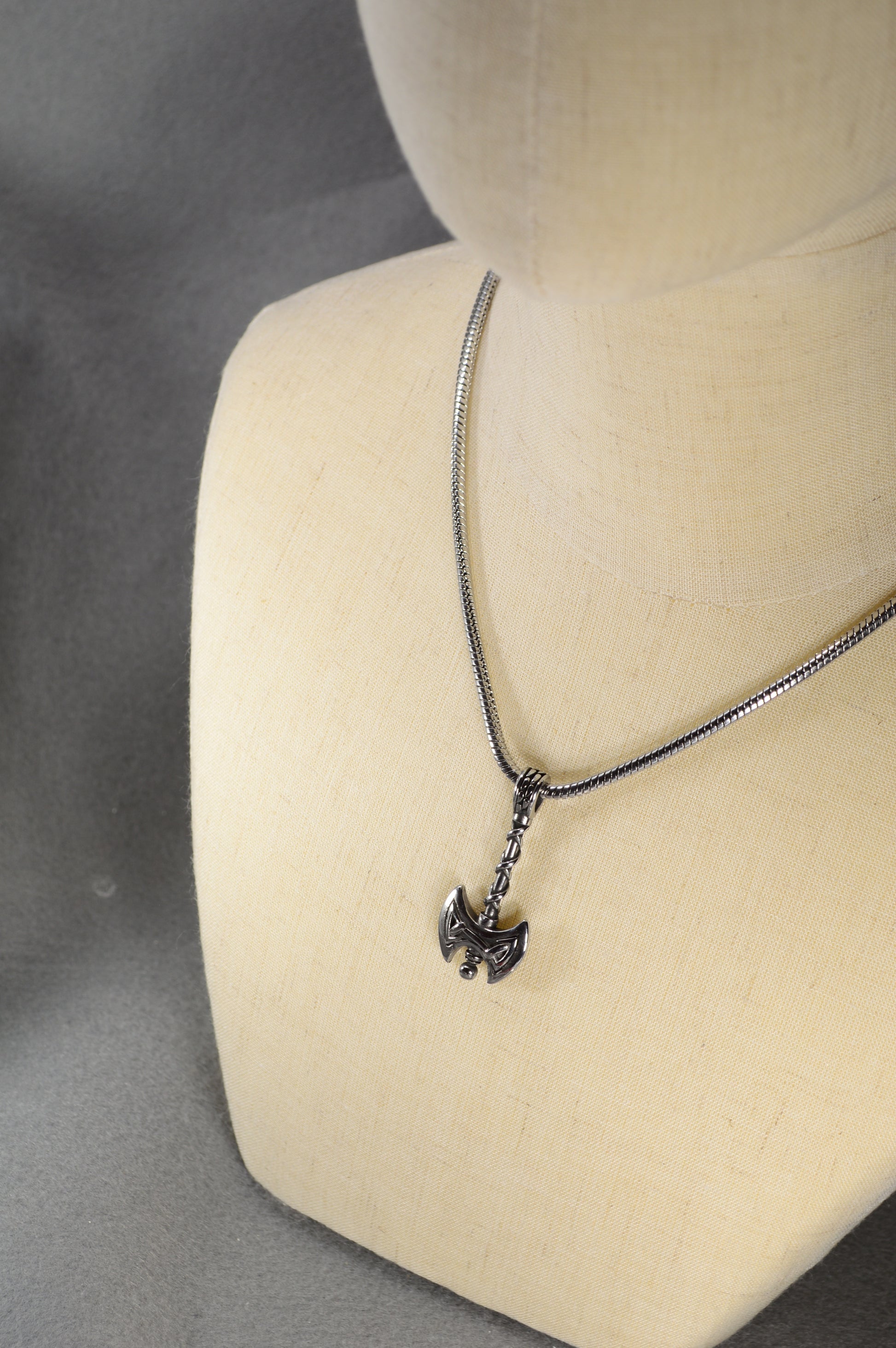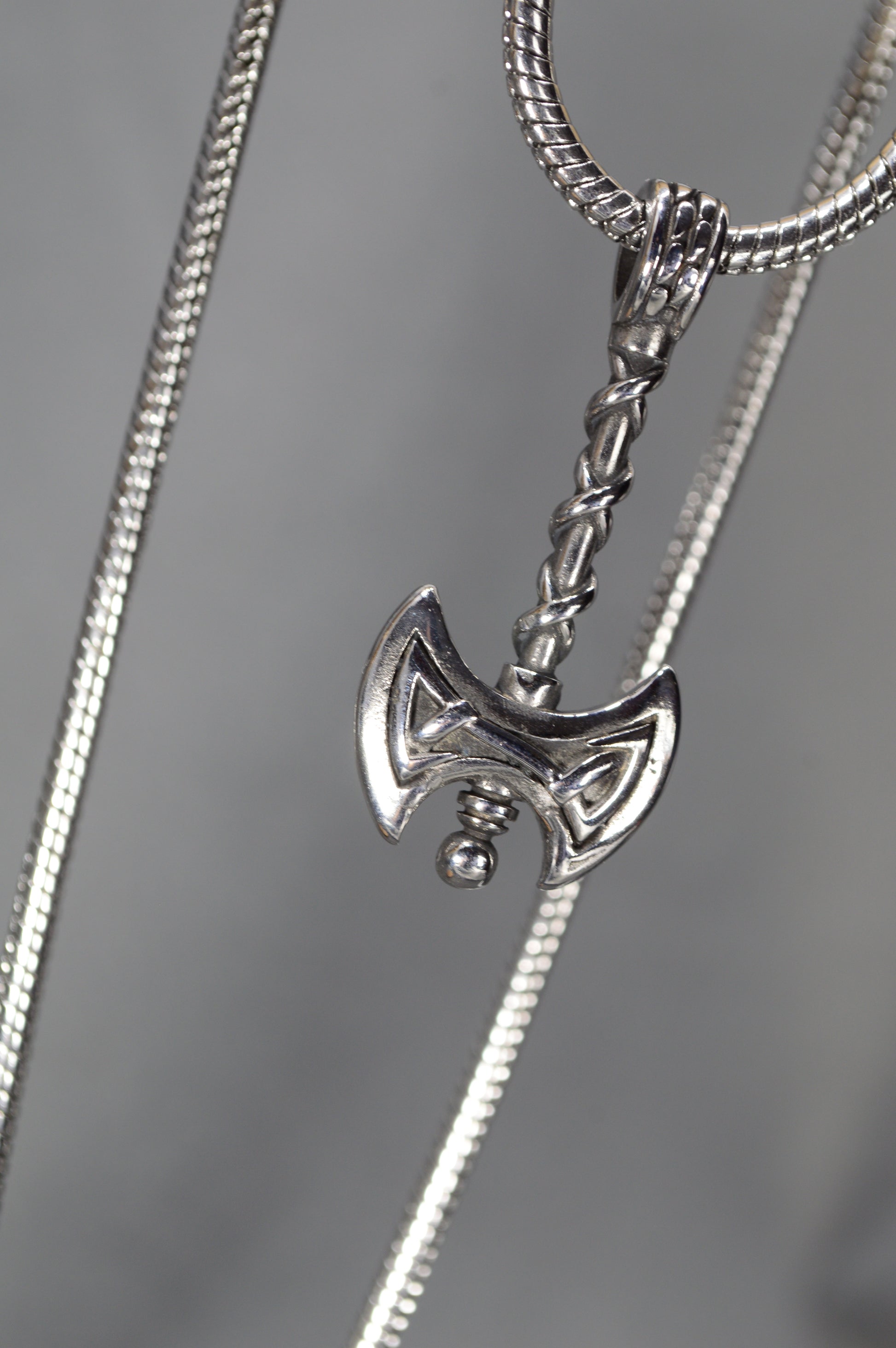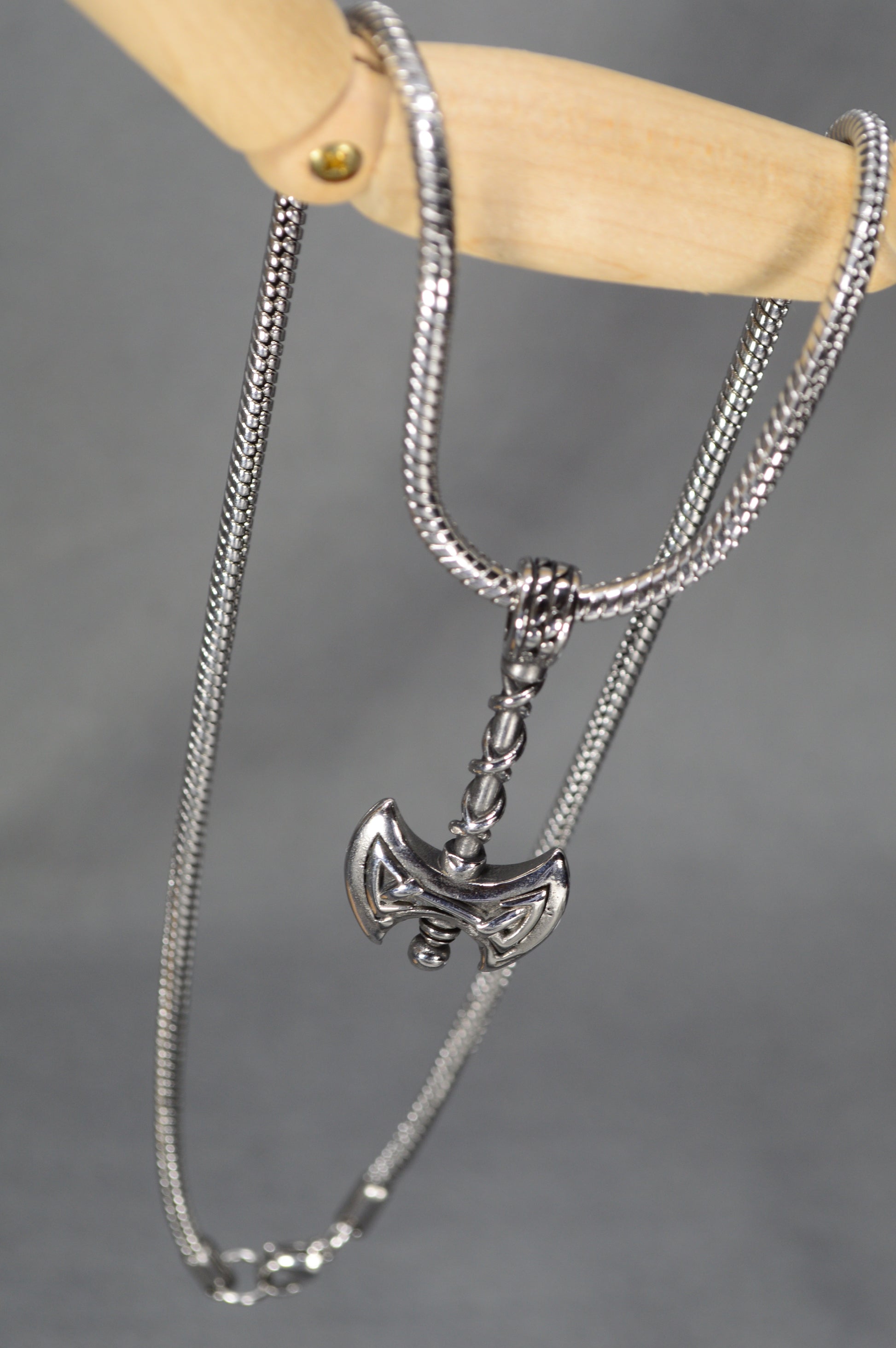 Striking Viking-inspired necklace featuring a detailed double-bladed axe pendant. Made from durable stainless steel with an antique-style finish that highlights every carved line and knotwork accent. The twisted handle and bold blade design evoke classic Norse weaponry, making this piece perfect for lovers of mythology, Viking culture, and powerful symbolic jewelry. The pendant hangs on a sturdy stainless steel chain suitable for everyday wear. A great gift for him, for history fans, or anyone drawn to rugged warrior aesthetics.